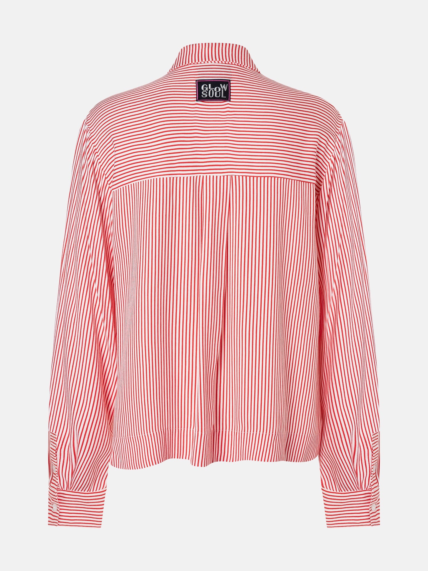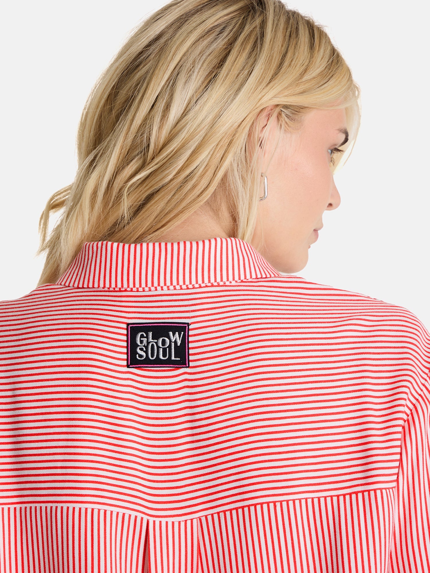 Diese Bluse von LIEBLINGSSTÜCK bringt mit ihrem frischen Streifenmuster einen modernen Twist in Deine Garderobe. Der klassische Hemdblusenkragen und die durchgehende Knopfleiste schenken ihr eine zeitlose Ausstrahlung. Highlight ist die aufgesetzte Brusttasche mit dem gestickten Schriftzug „LOVE NOW“, die dem Design eine liebevolle Botschaft verleiht. Die lockere Passform sorgt für angenehmen Tragekomfort und lässt sich vielseitig kombinieren. Ob lässig zu Jeans oder chic im Office – mit dieser Bluse setzt Du immer ein Statement. Ein Lieblingsteil, das Stil und Lebensfreude verbindet.