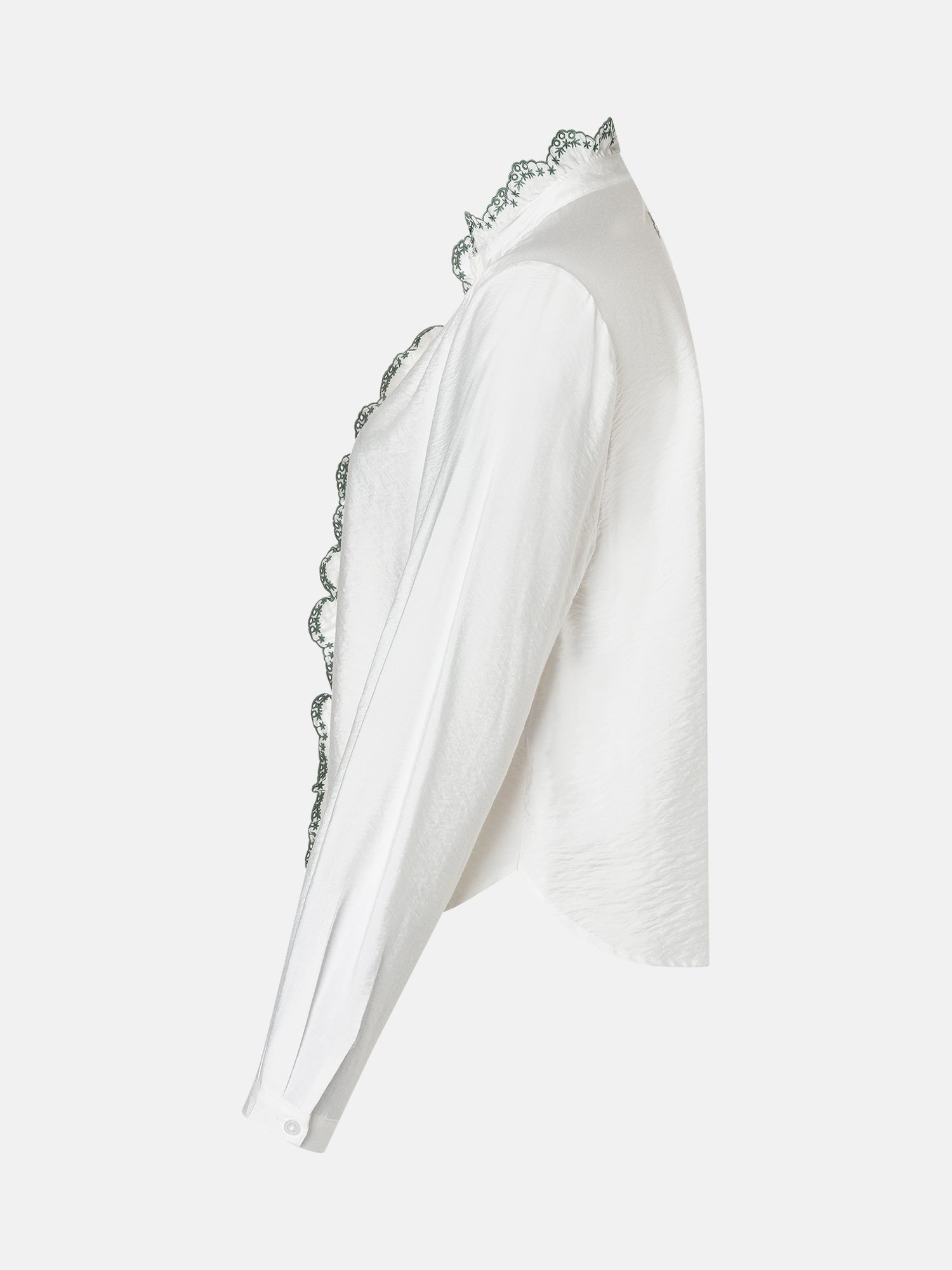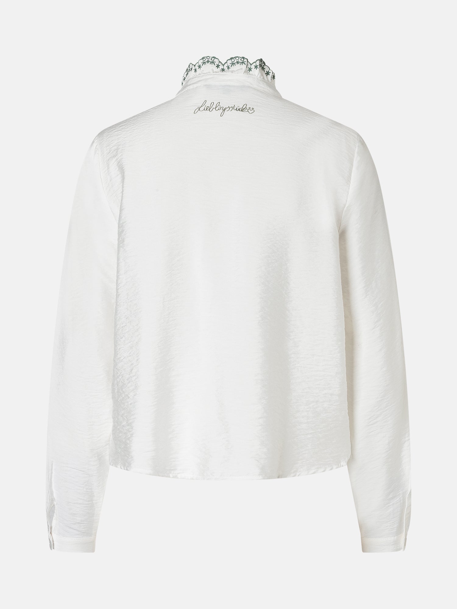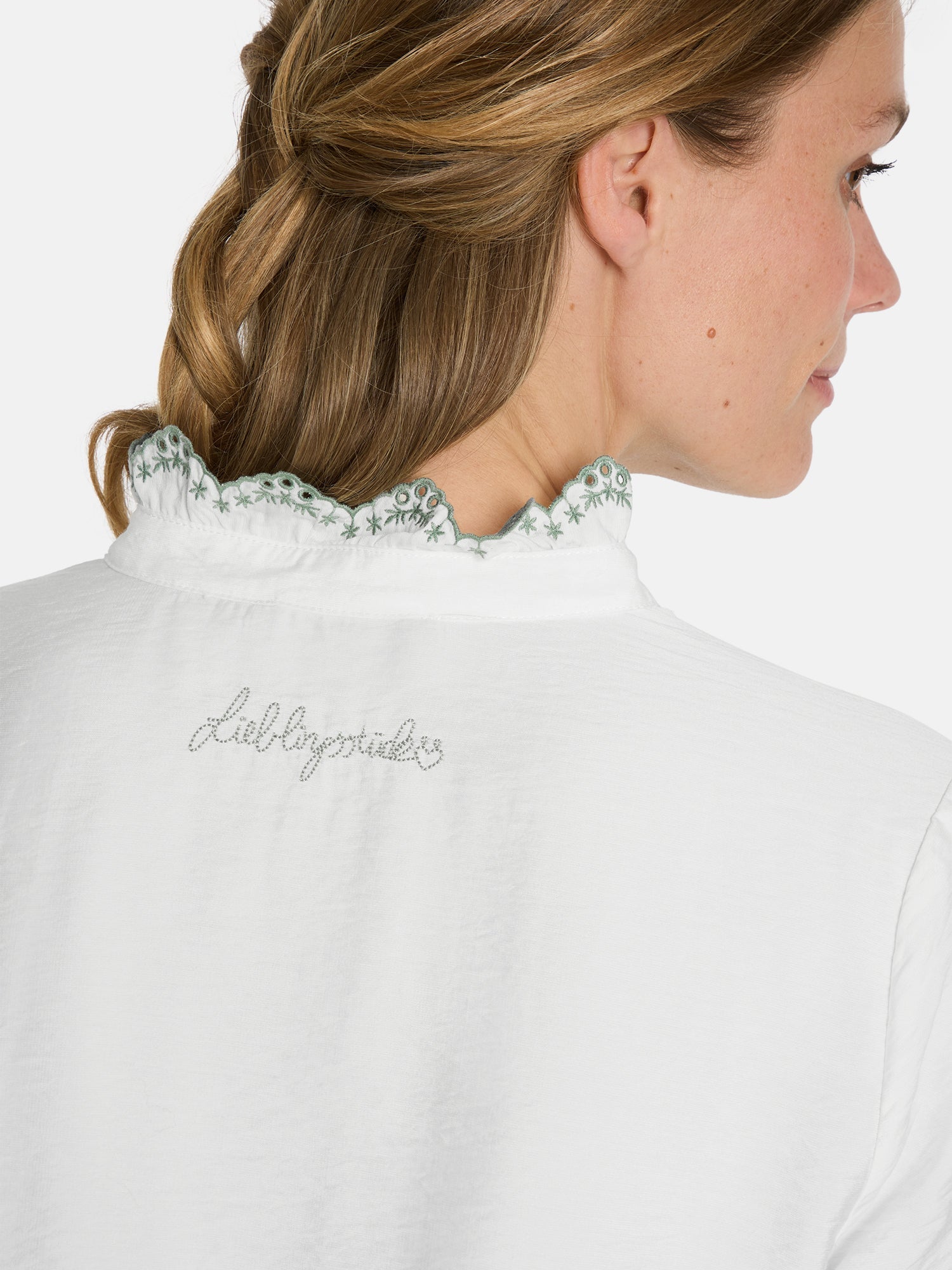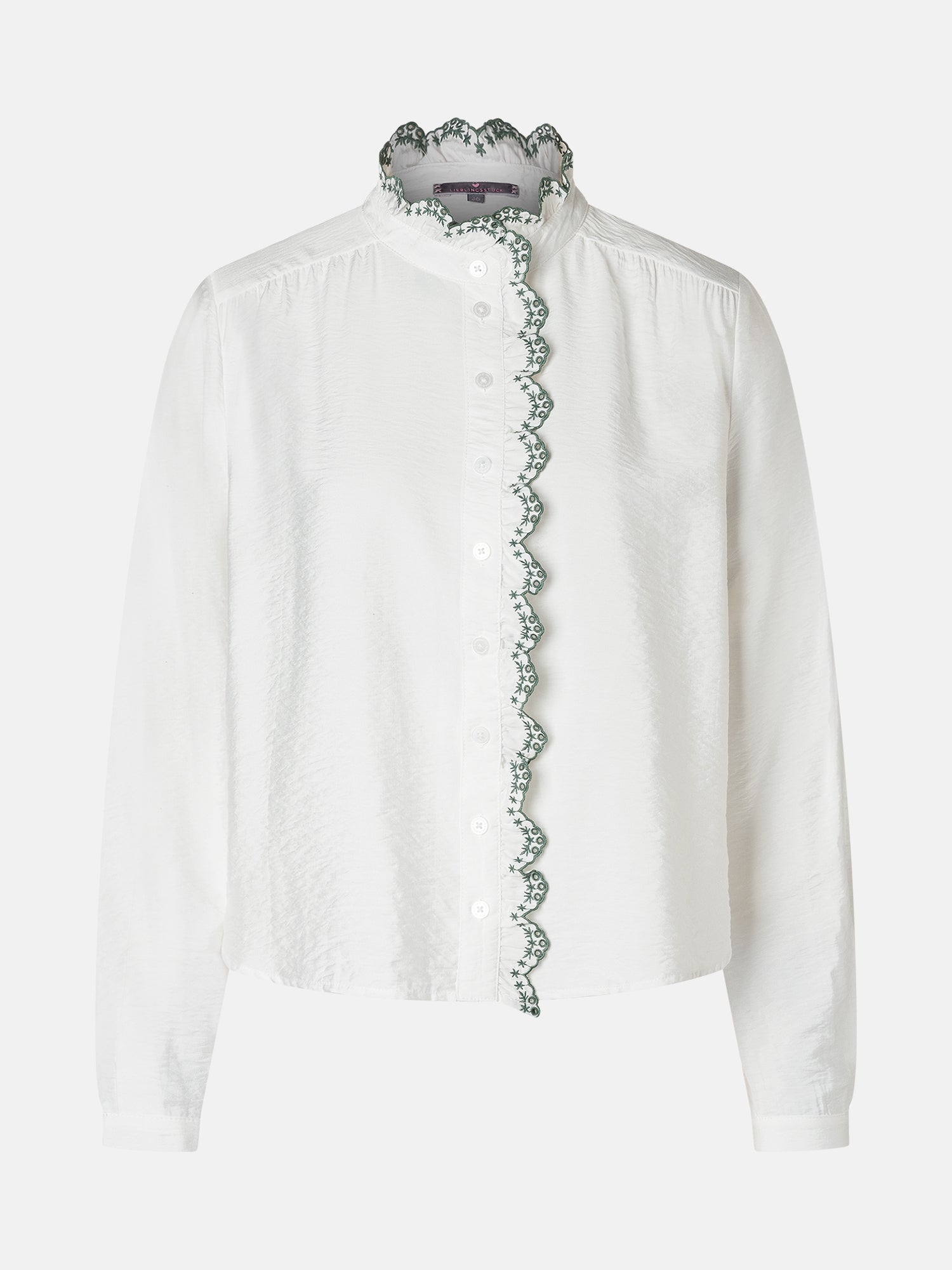Diese Bluse ist ein echtes LIEBLINGSSTÜCK für Alltag und Büro. Die Knopfleiste und die feine Stickerei am Kragen geben dem Look Struktur und eine feminine Note. Bequem und charmant zugleich.