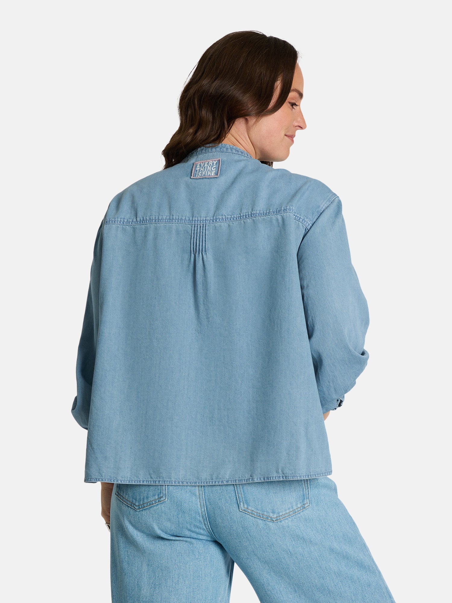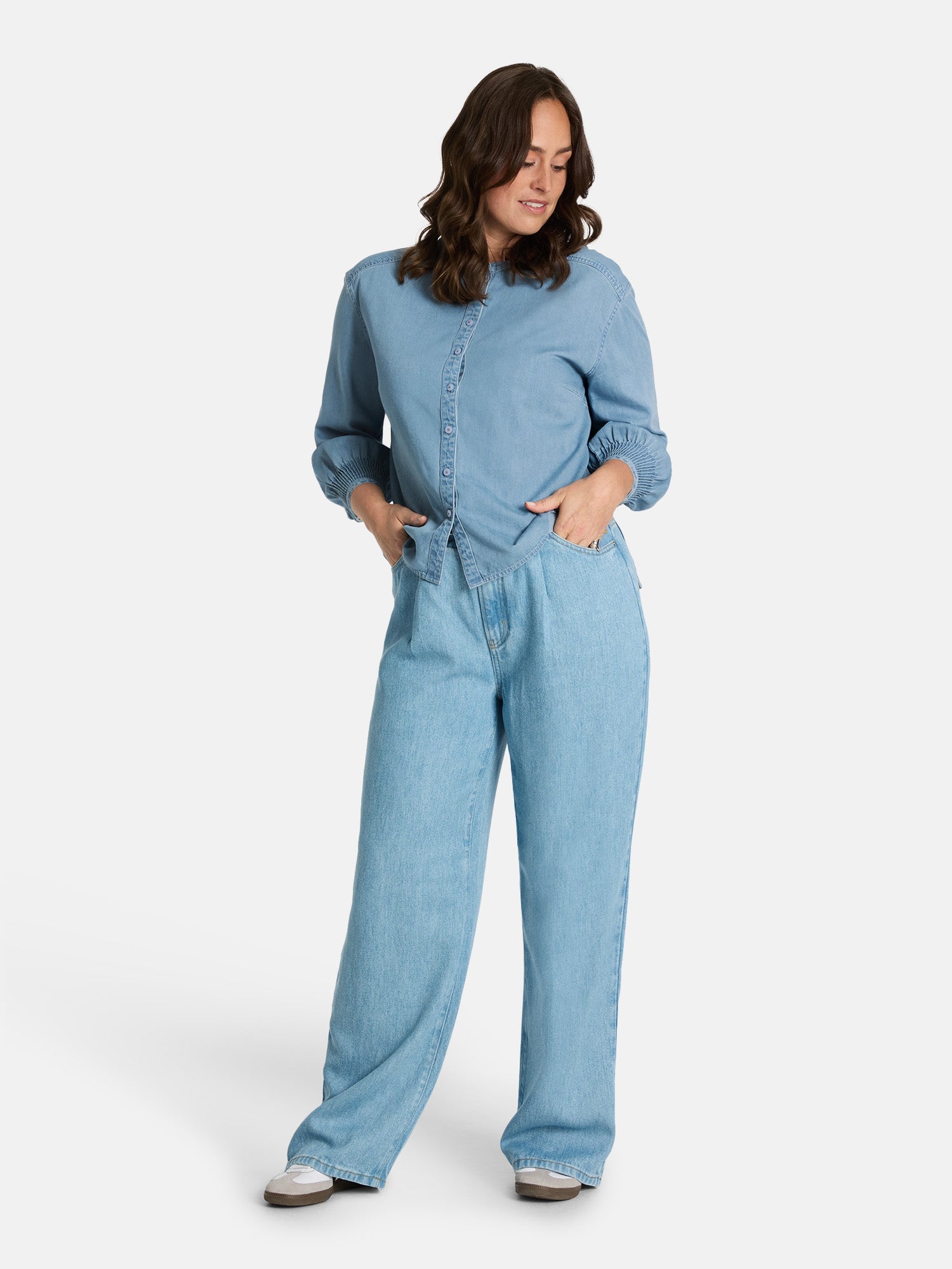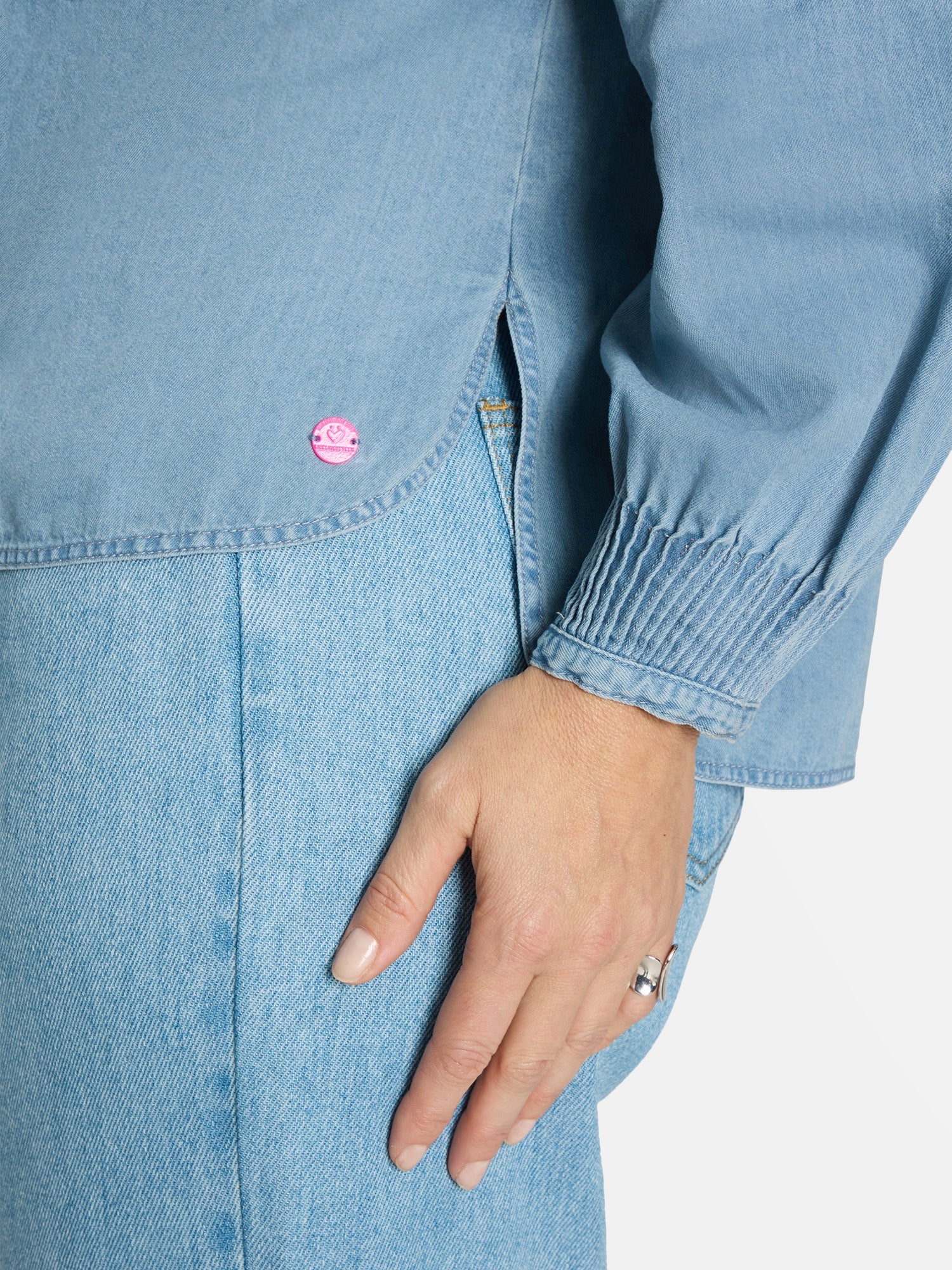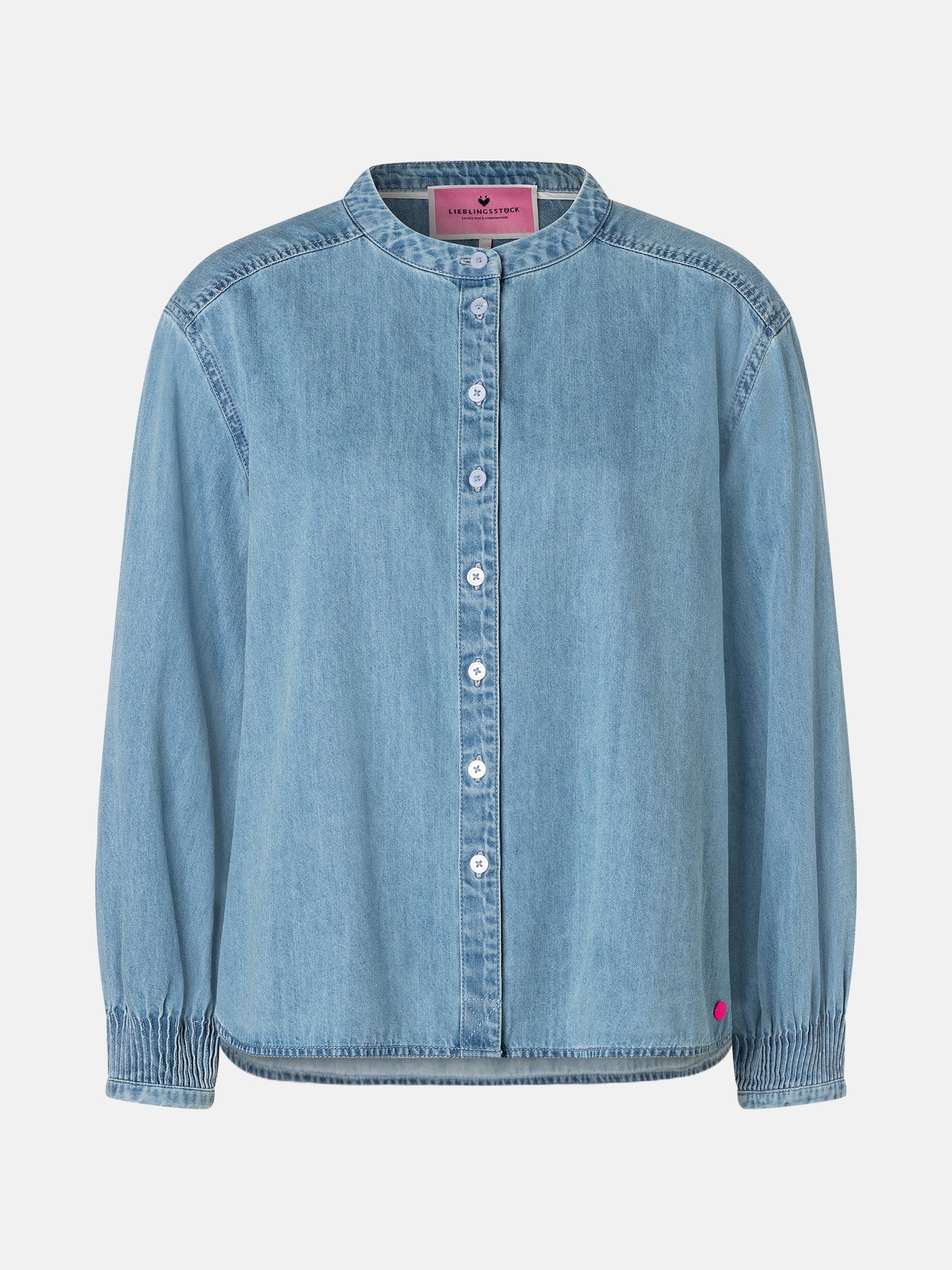 Diese durchgeknöpfte Bluse im Denim-Look bringt eine lässige Leichtigkeit in Deinen Alltag. Der moderne Stehkragen und die raffiniert gerafften Ärmelabschlüsse machen sie zu einem unkomplizierten Begleiter mit besonderem Twist. Die weiche Mischung aus Baumwolle und Lyocell sorgt dafür, dass Du Dich rundum wohlfühlst – egal ob Du sie chic oder casual stylst. Ein liebevolles Detail am Rücken verrät Dir: "Everything is fine" – und so fühlst Du Dich auch!