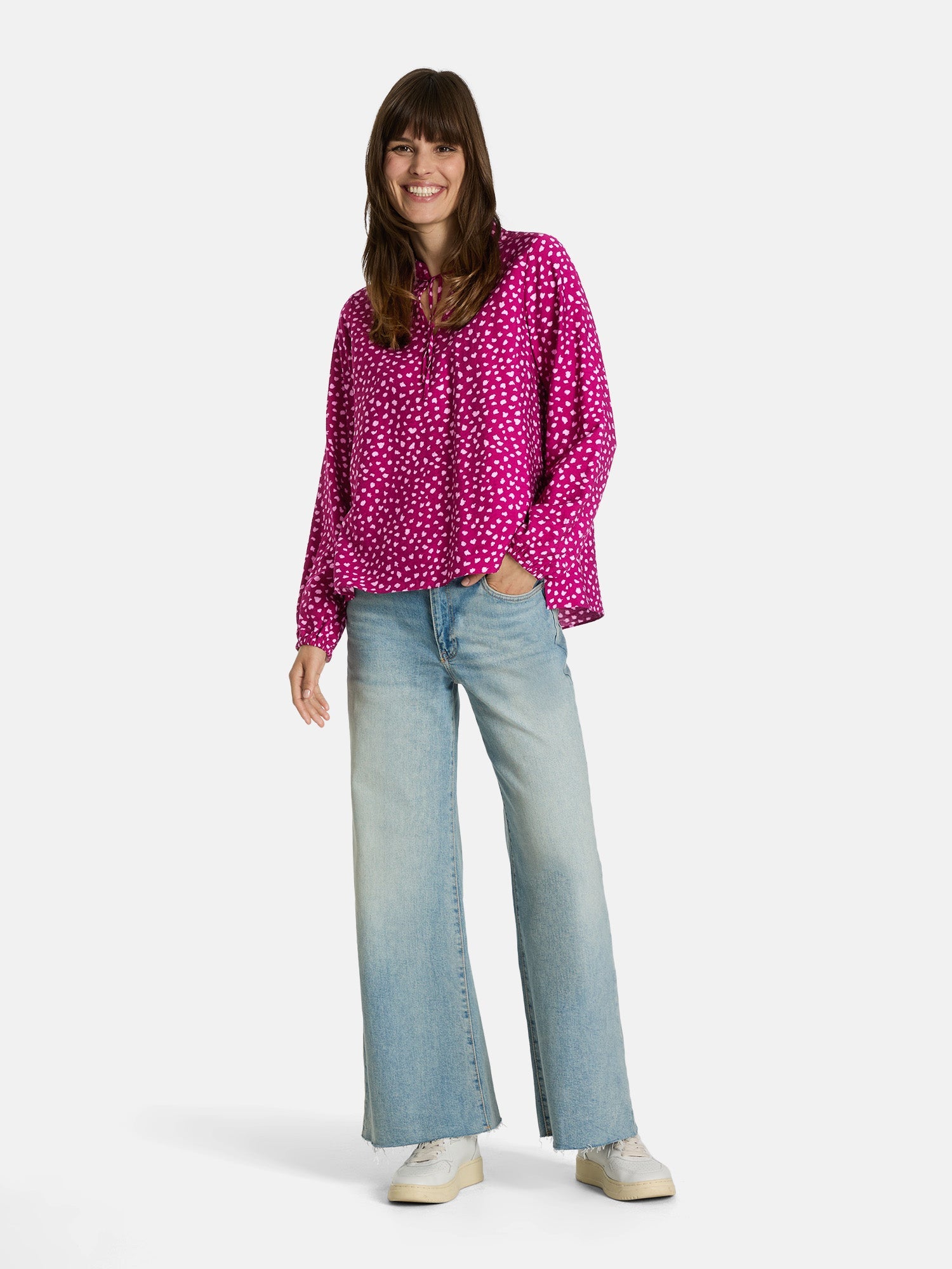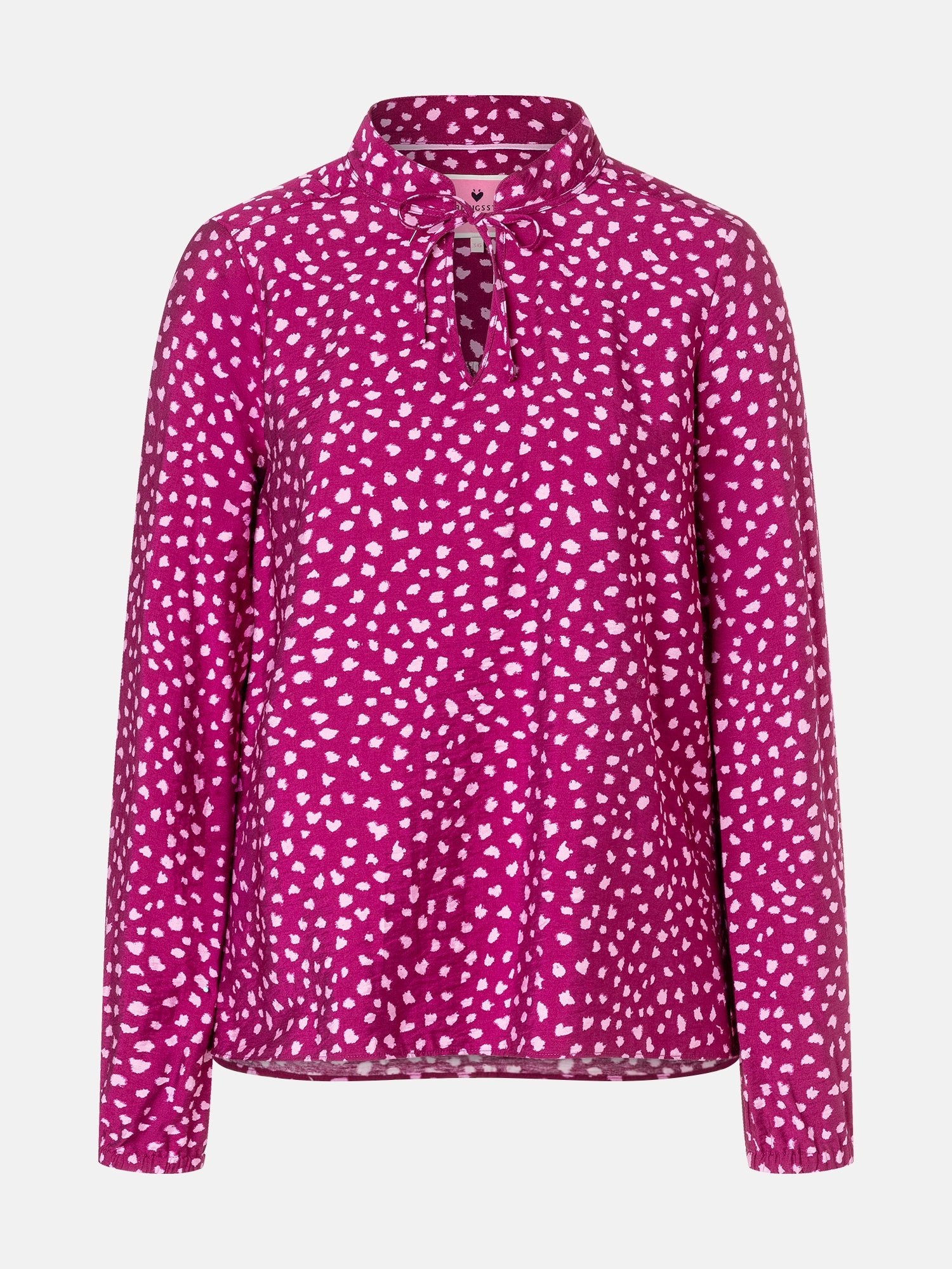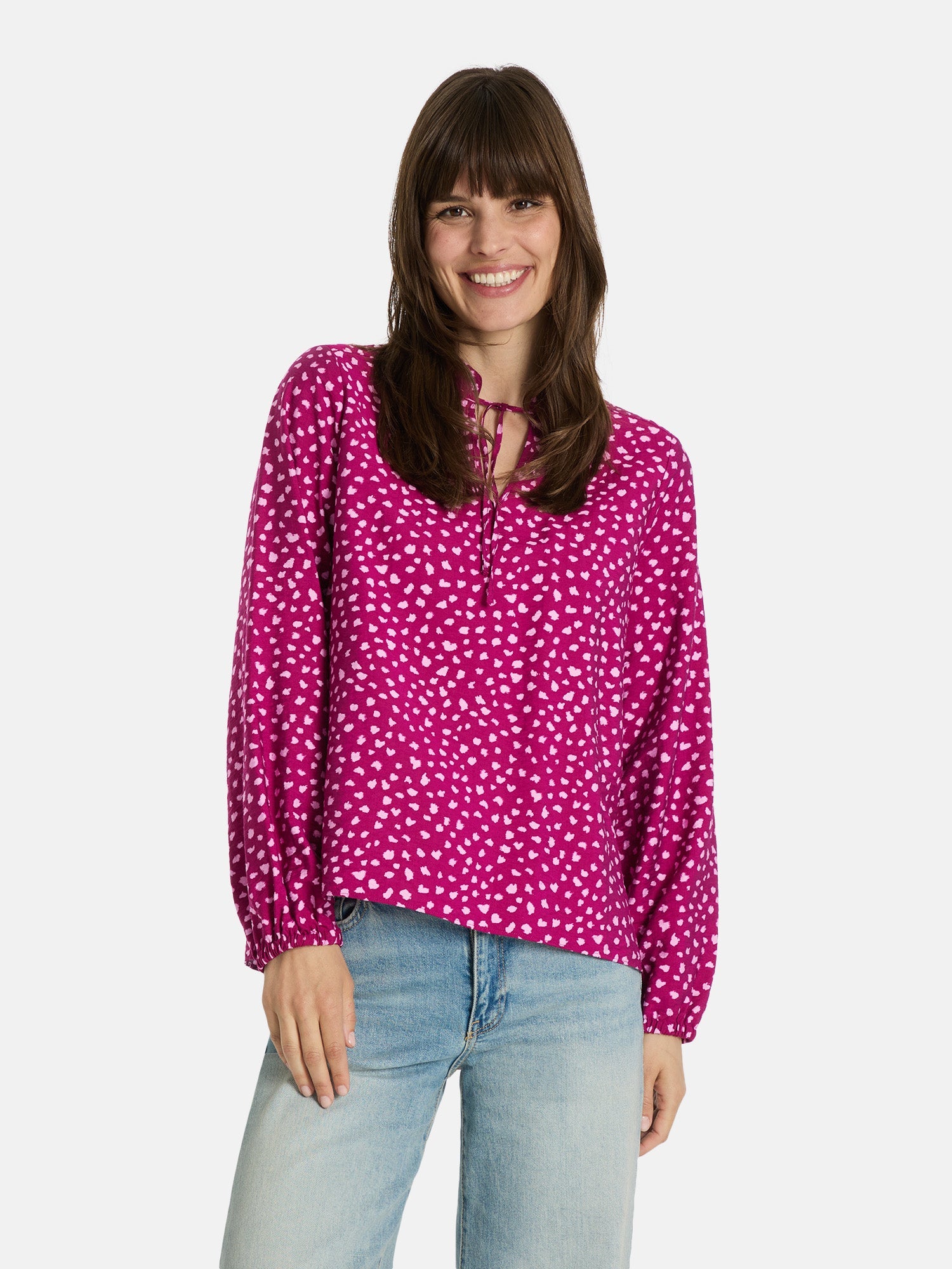 Diese Bluse zaubert Dir schon beim Anziehen ein Lächeln ins Gesicht! Das verspielte Muster und das süße Bindedetail am Ausschnitt machen sie zu einem echten Hingucker, der Deinem Look eine romantische Leichtigkeit verleiht. Die fließende Viskose sorgt dafür, dass Du Dich den ganzen Tag wohlfühlst – ob im Büro oder beim Kaffeetrinken mit Freundinnen. Ein kleines Stylingwunder, das zu Jeans genauso toll aussieht wie zum Rock.