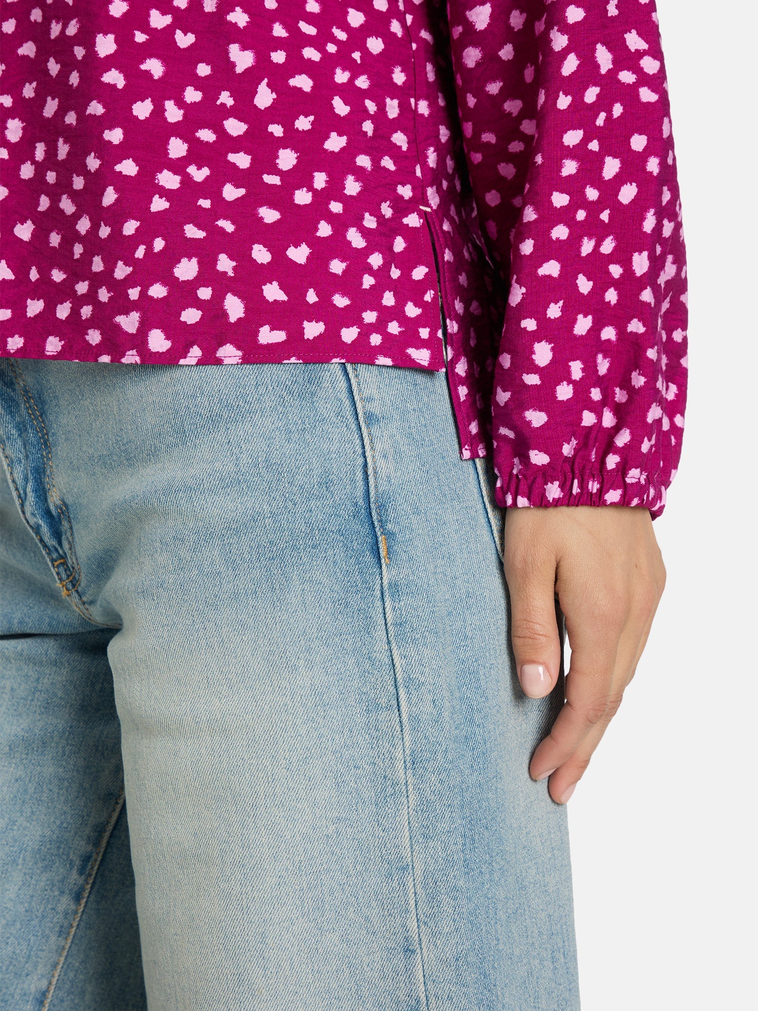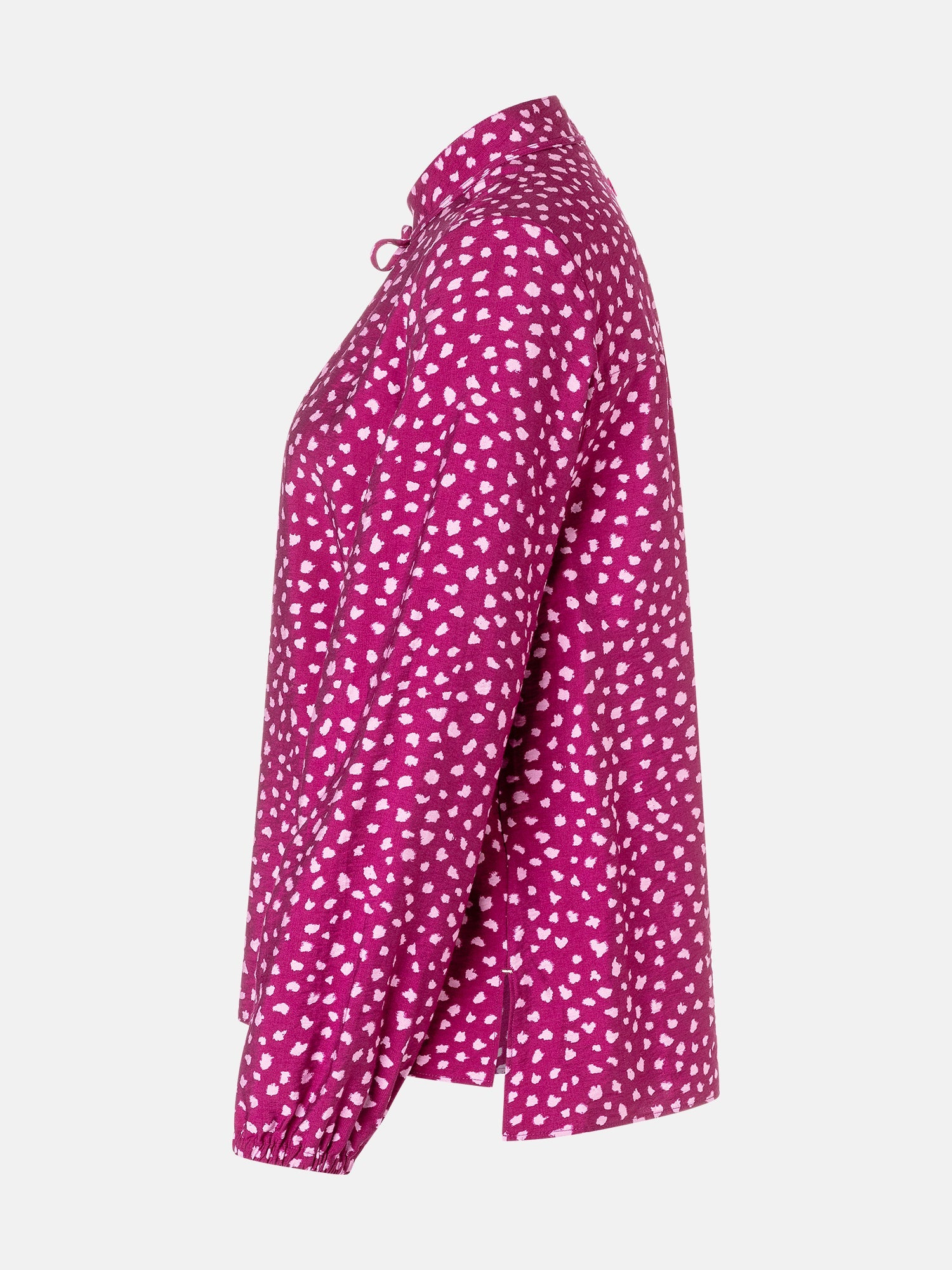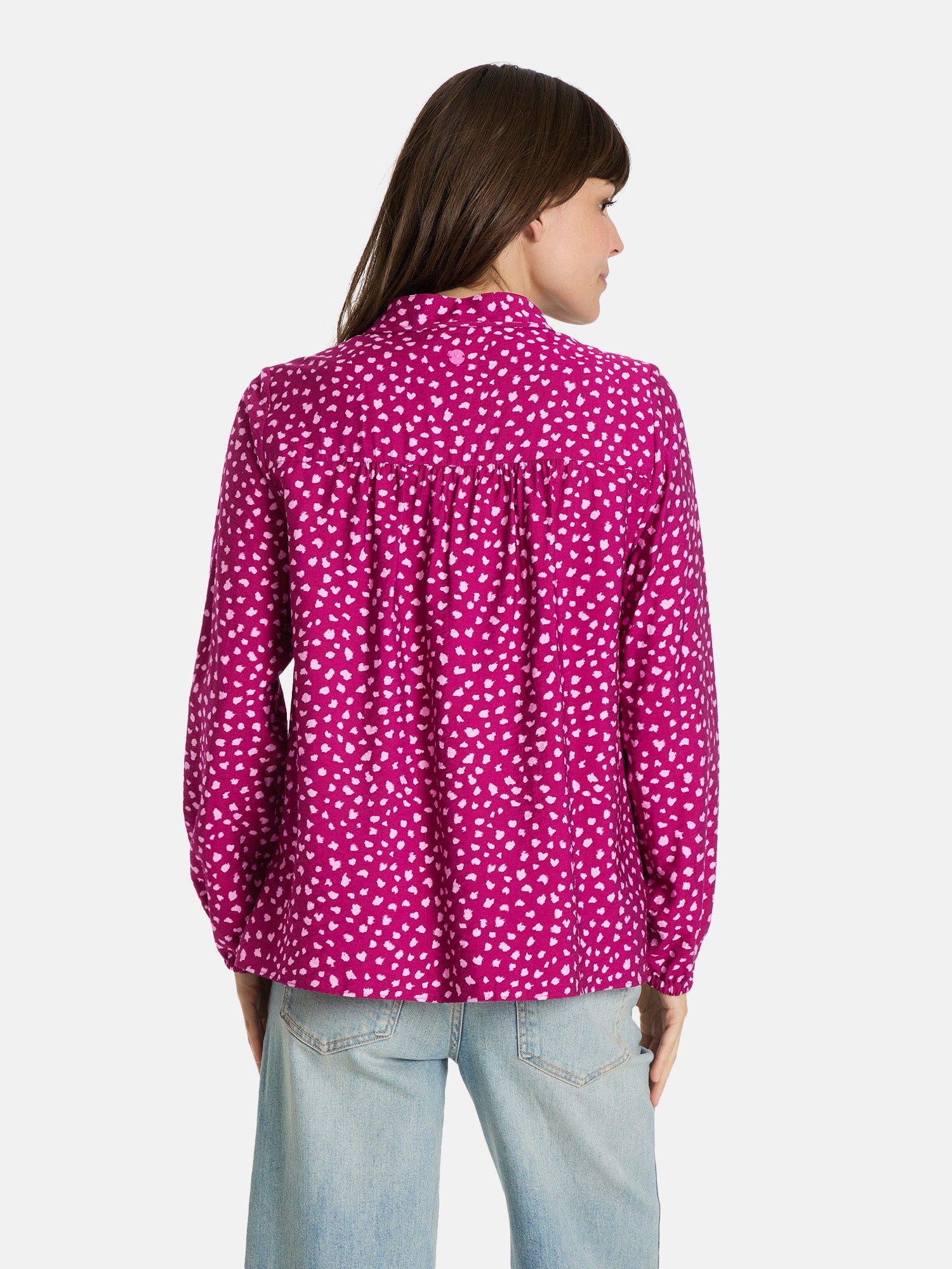 Diese Bluse zaubert Dir schon beim Anziehen ein Lächeln ins Gesicht! Das verspielte Muster und das süße Bindedetail am Ausschnitt machen sie zu einem echten Hingucker, der Deinem Look eine romantische Leichtigkeit verleiht. Die fließende Viskose sorgt dafür, dass Du Dich den ganzen Tag wohlfühlst – ob im Büro oder beim Kaffeetrinken mit Freundinnen. Ein kleines Stylingwunder, das zu Jeans genauso toll aussieht wie zum Rock.