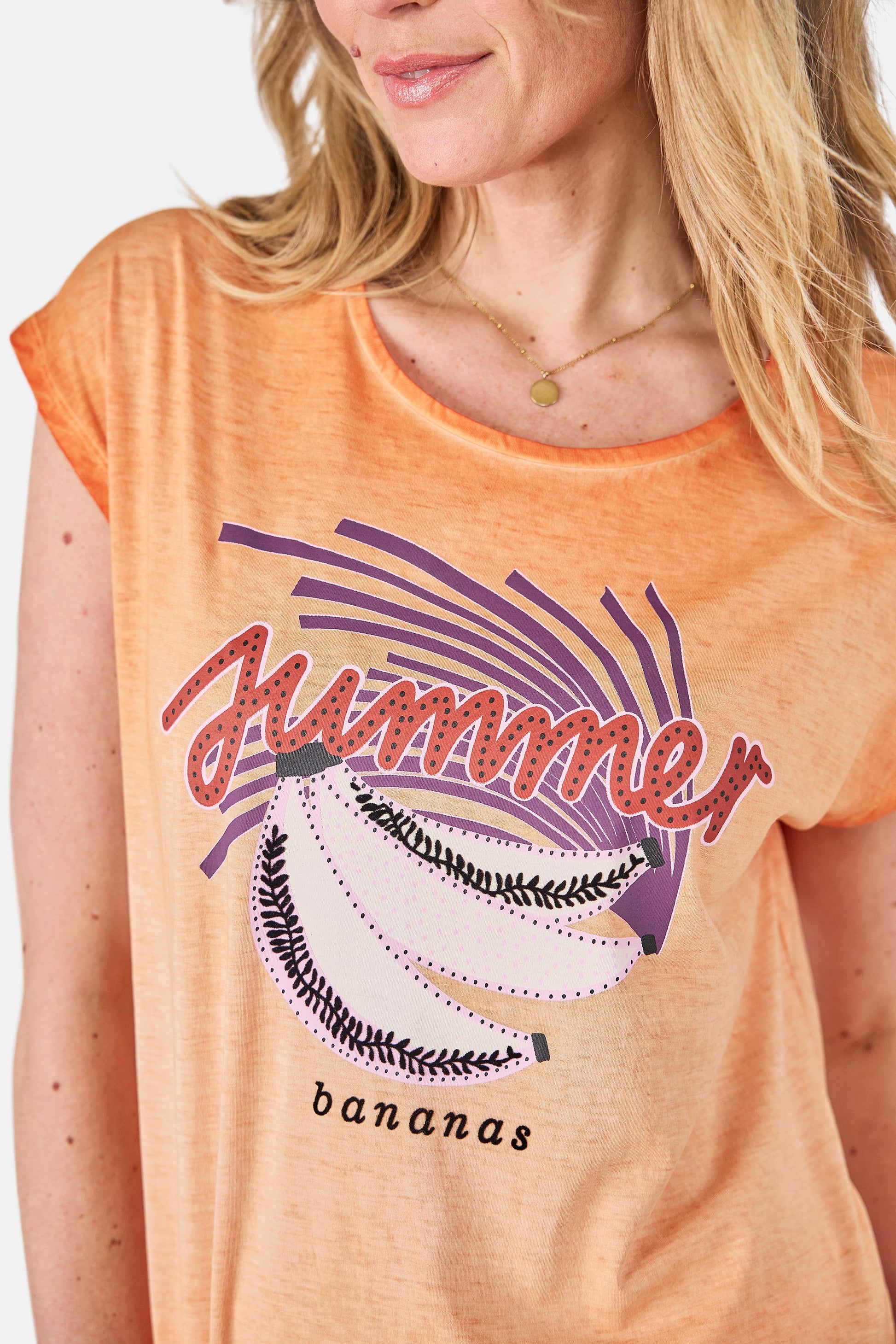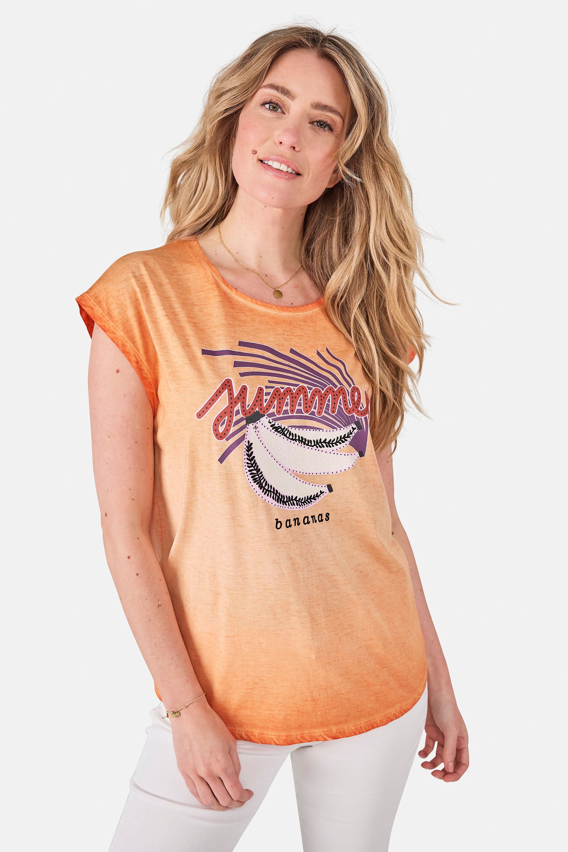 Oh Sweet Summer! Mit einem zauberhaften Bananenmotiv entführt Dich das Shirt Cathalin ins tropische Paradies. Aus hochwertiger Baumwolle liegt das Shirt angenehm weich auf der Haut, während die überschnittenen kurzen Ärmel ein luftiges Tragegefühl verleihen.