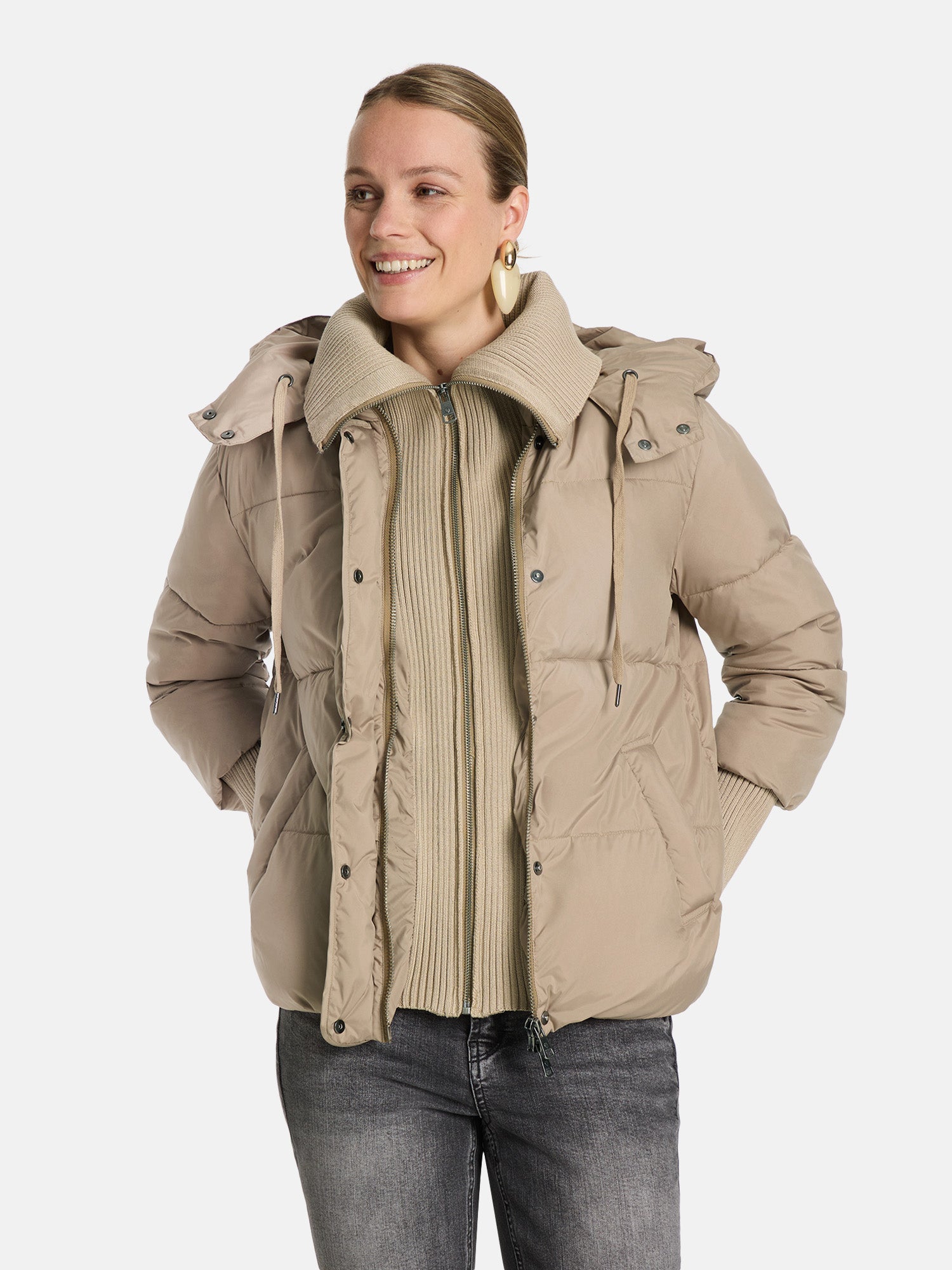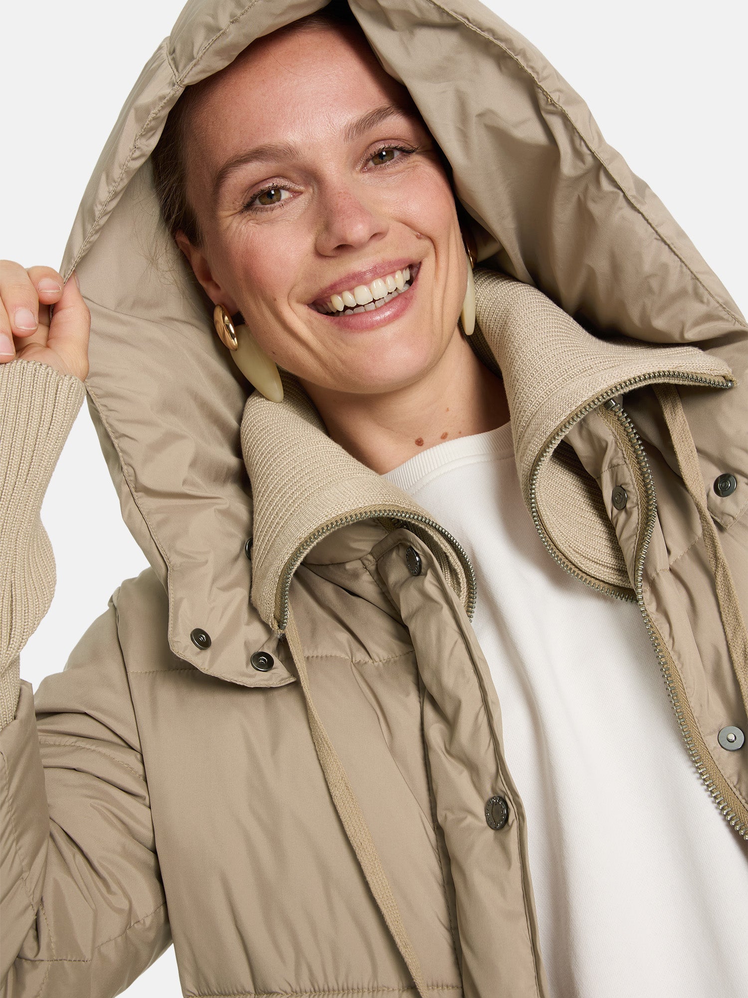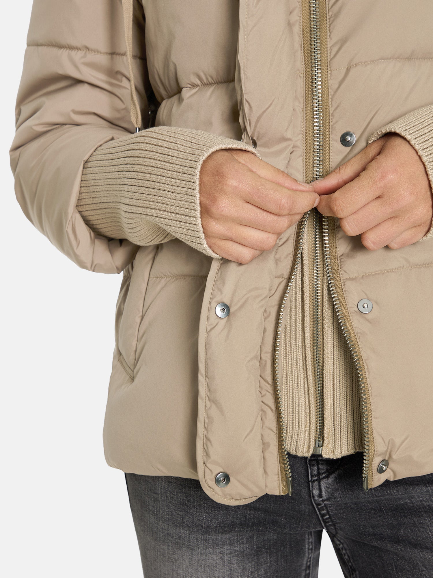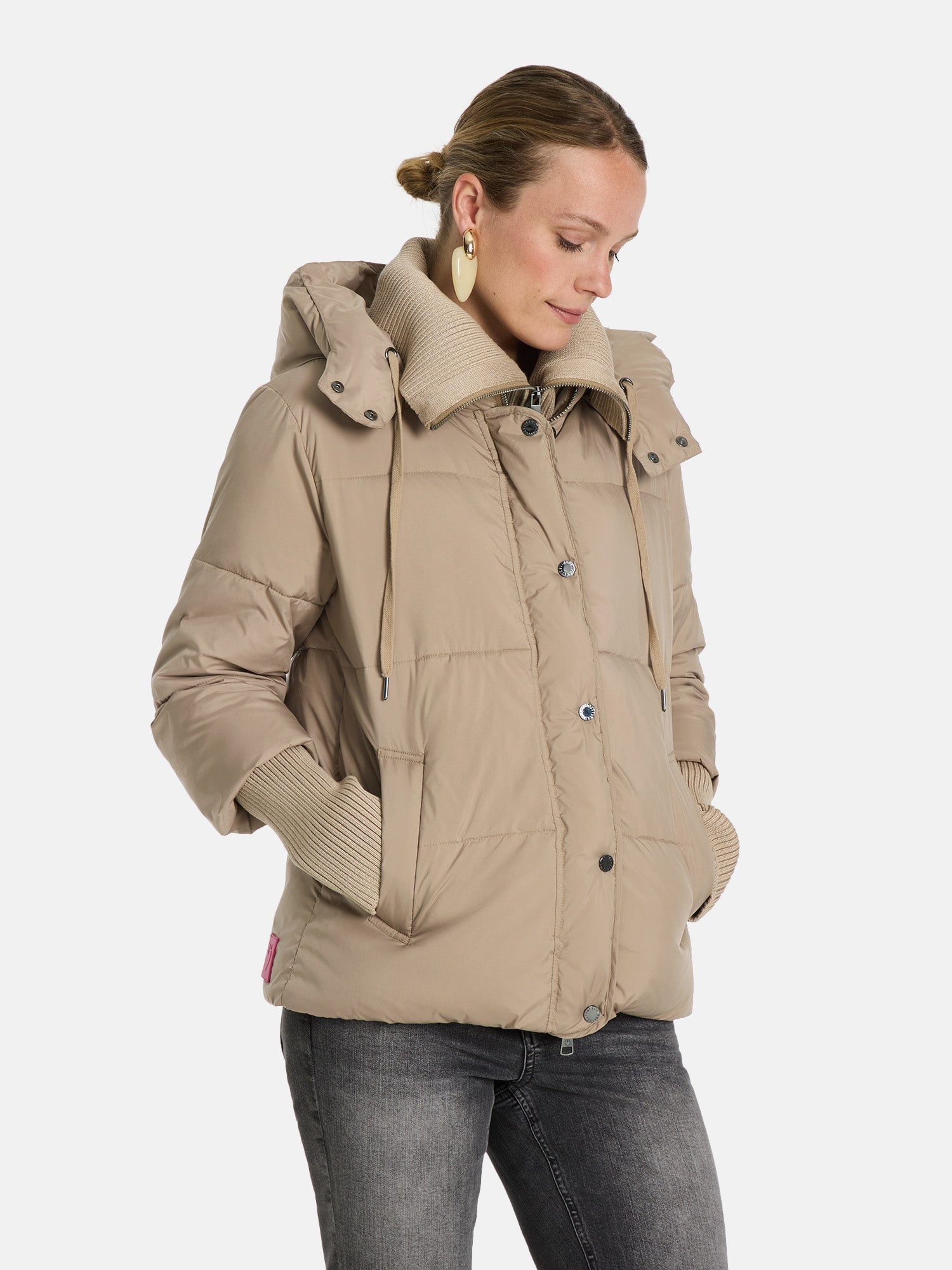 Diese wattierte Jacke ist Dein neuer Lieblingsbegleiter für kalte Tage! Der große Strickkragen schmiegt sich herrlich weich um Deinen Hals, während die Kapuze mit Reißverschluss und Druckknöpfen einfach praktisch und stylisch zugleich ist. Strickbündchen an den Ärmeln machen den Kuschel-Look perfekt!
