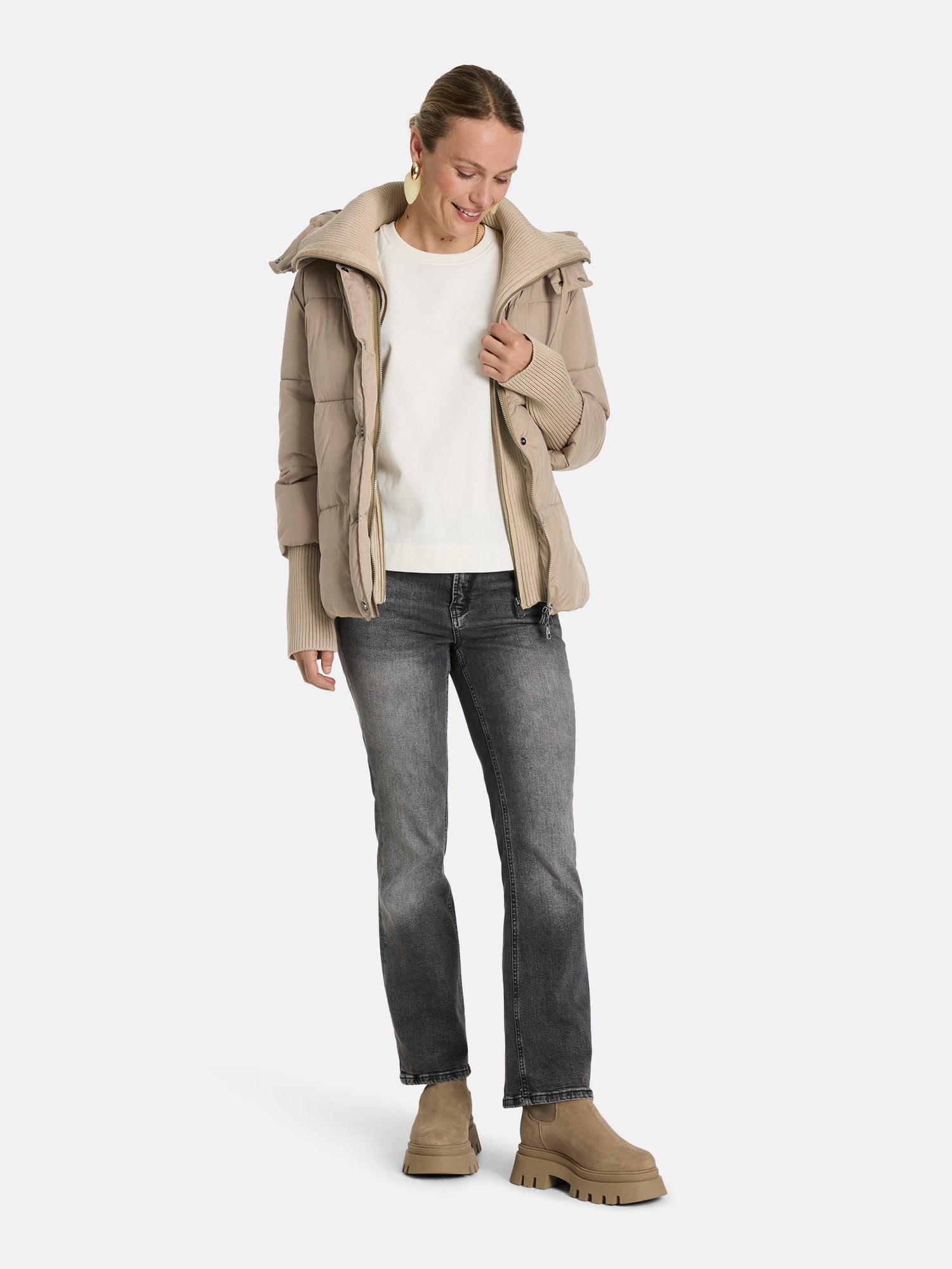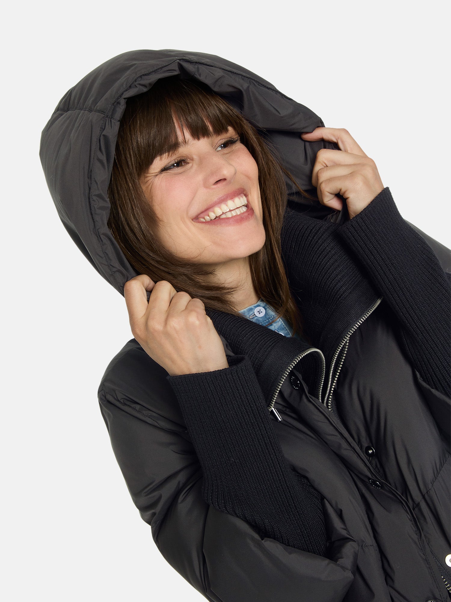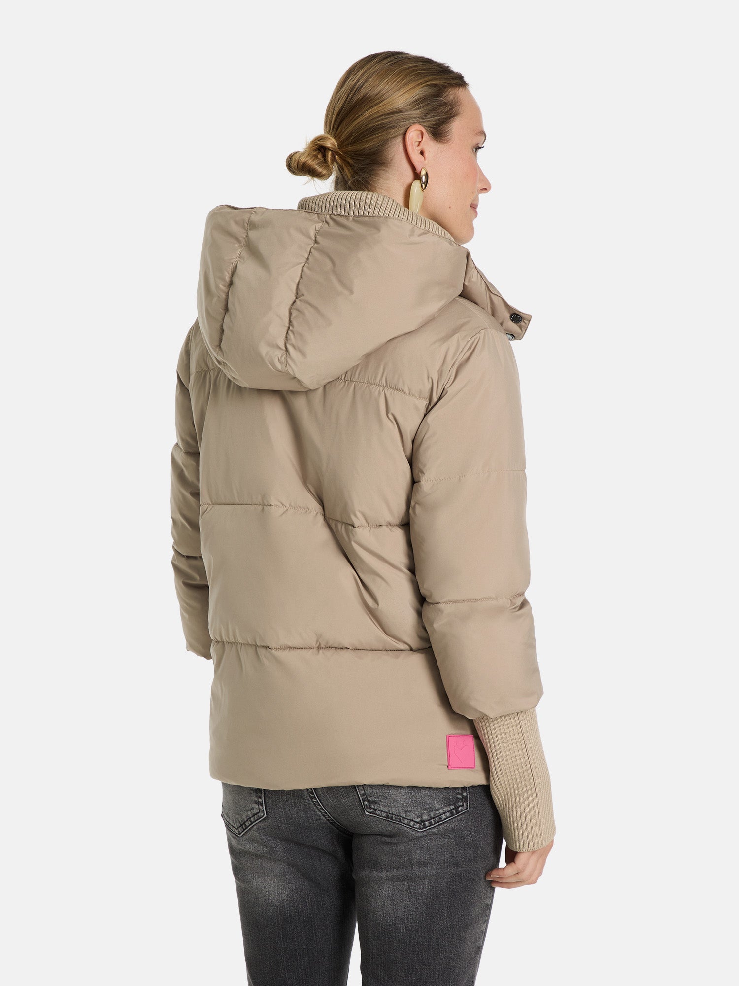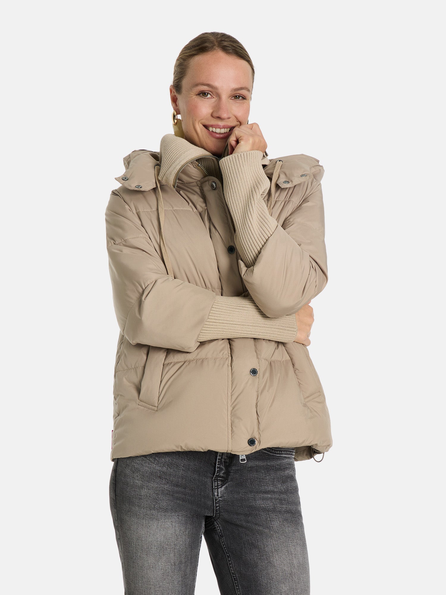 Diese wattierte Jacke ist Dein neuer Lieblingsbegleiter für kalte Tage! Der große Strickkragen schmiegt sich herrlich weich um Deinen Hals, während die Kapuze mit Reißverschluss und Druckknöpfen einfach praktisch und stylisch zugleich ist. Strickbündchen an den Ärmeln machen den Kuschel-Look perfekt!