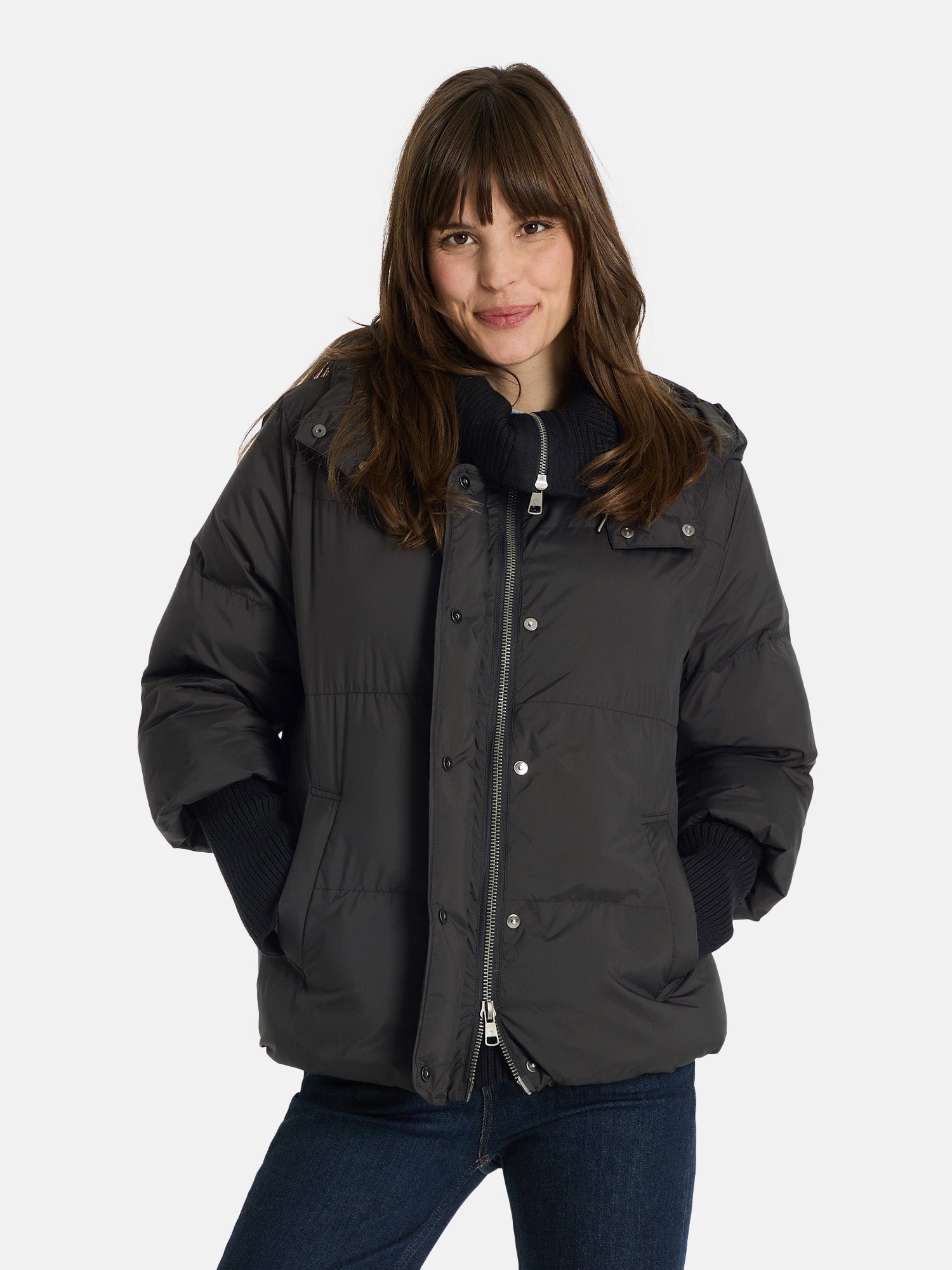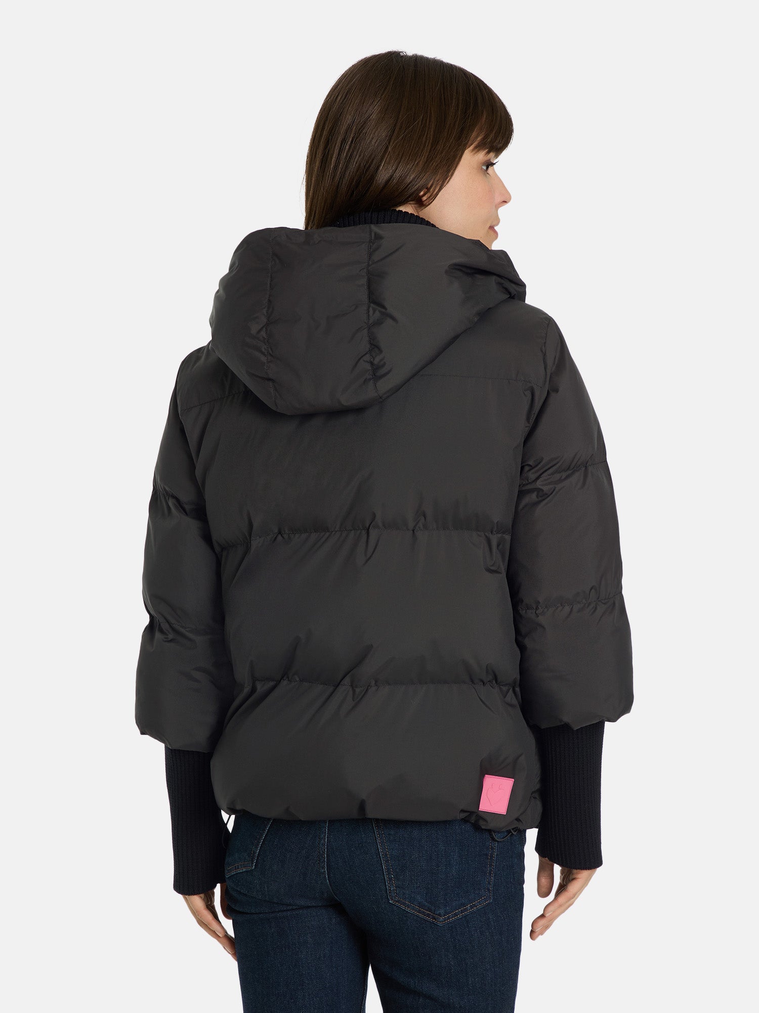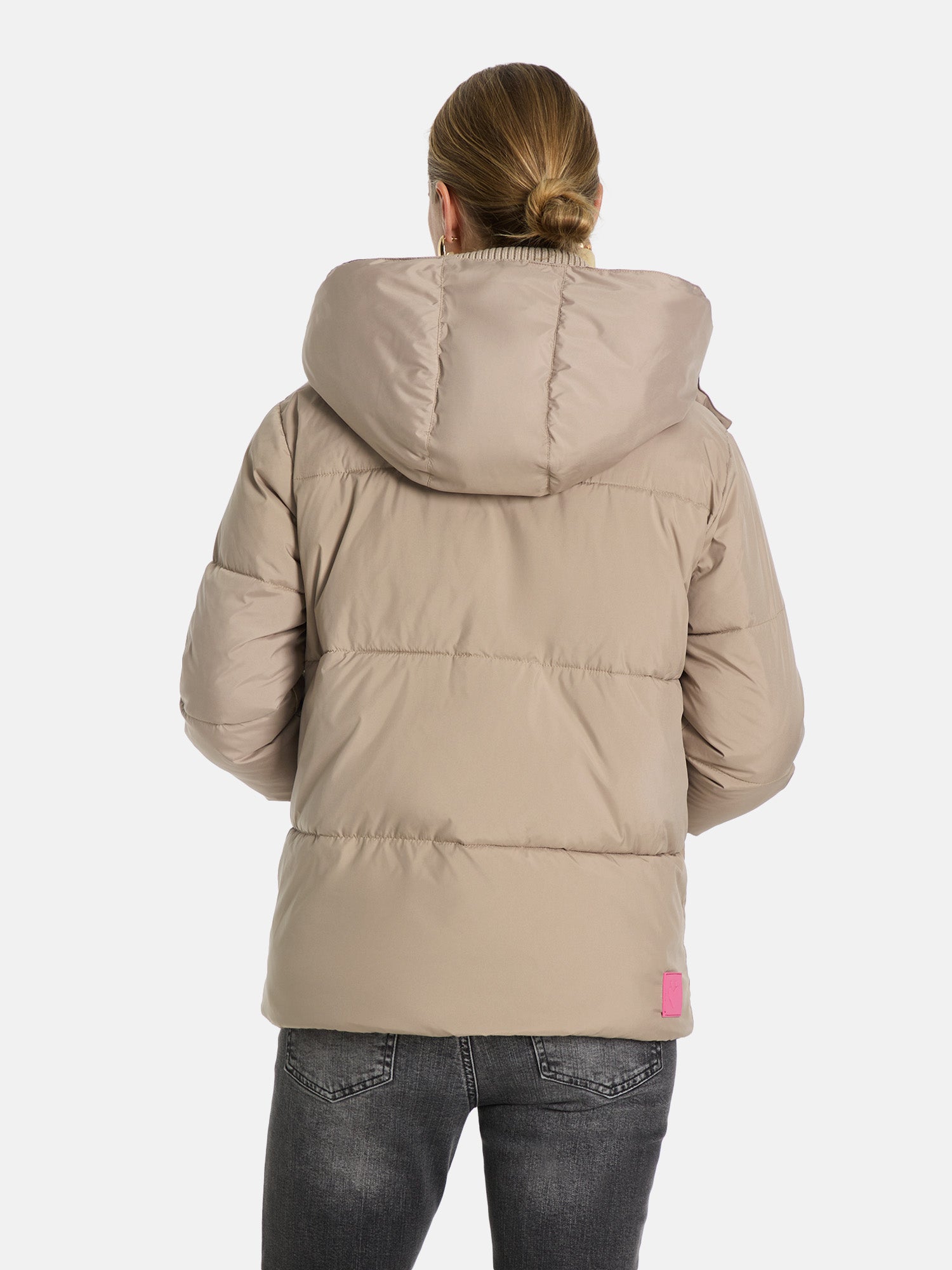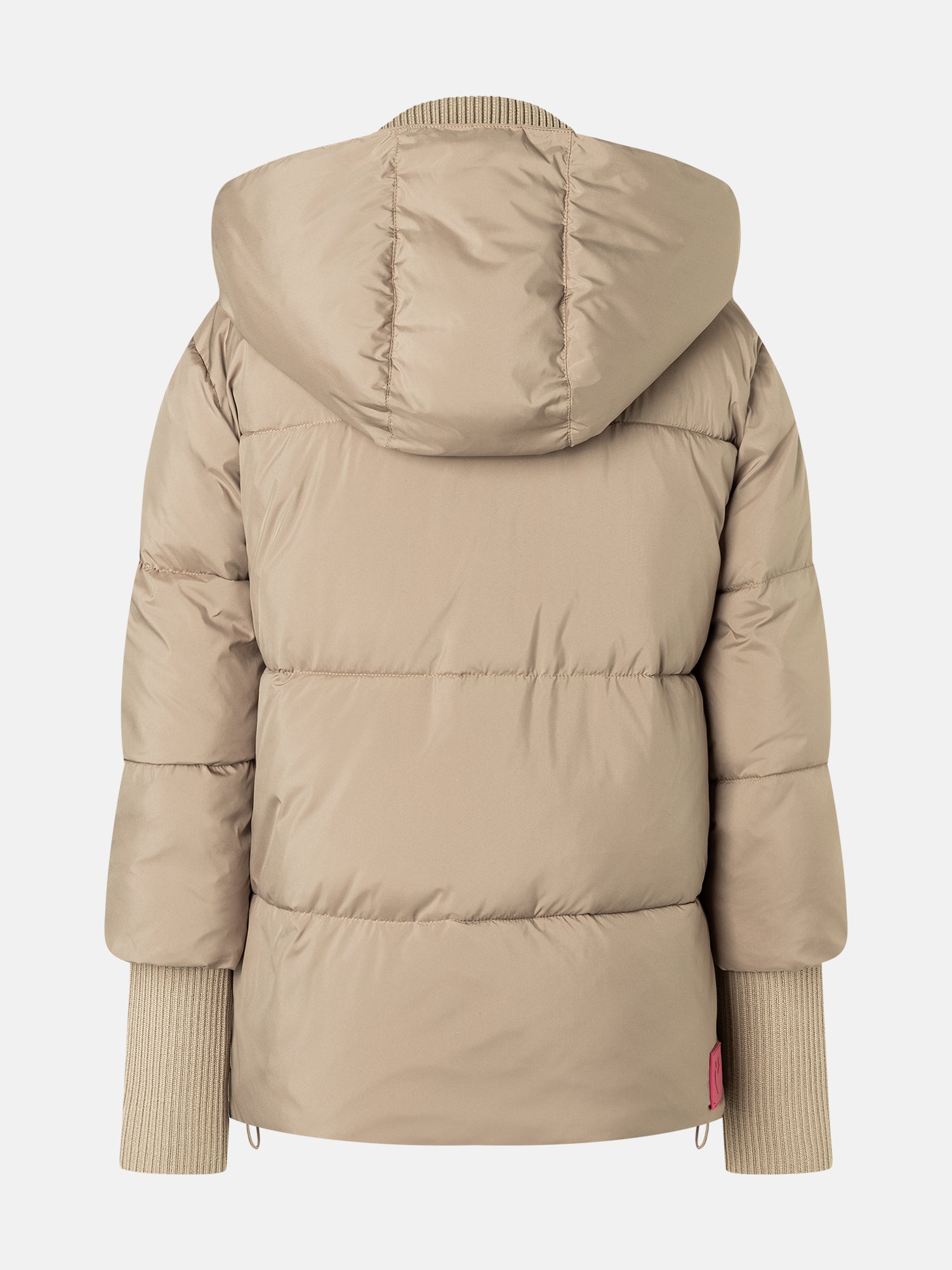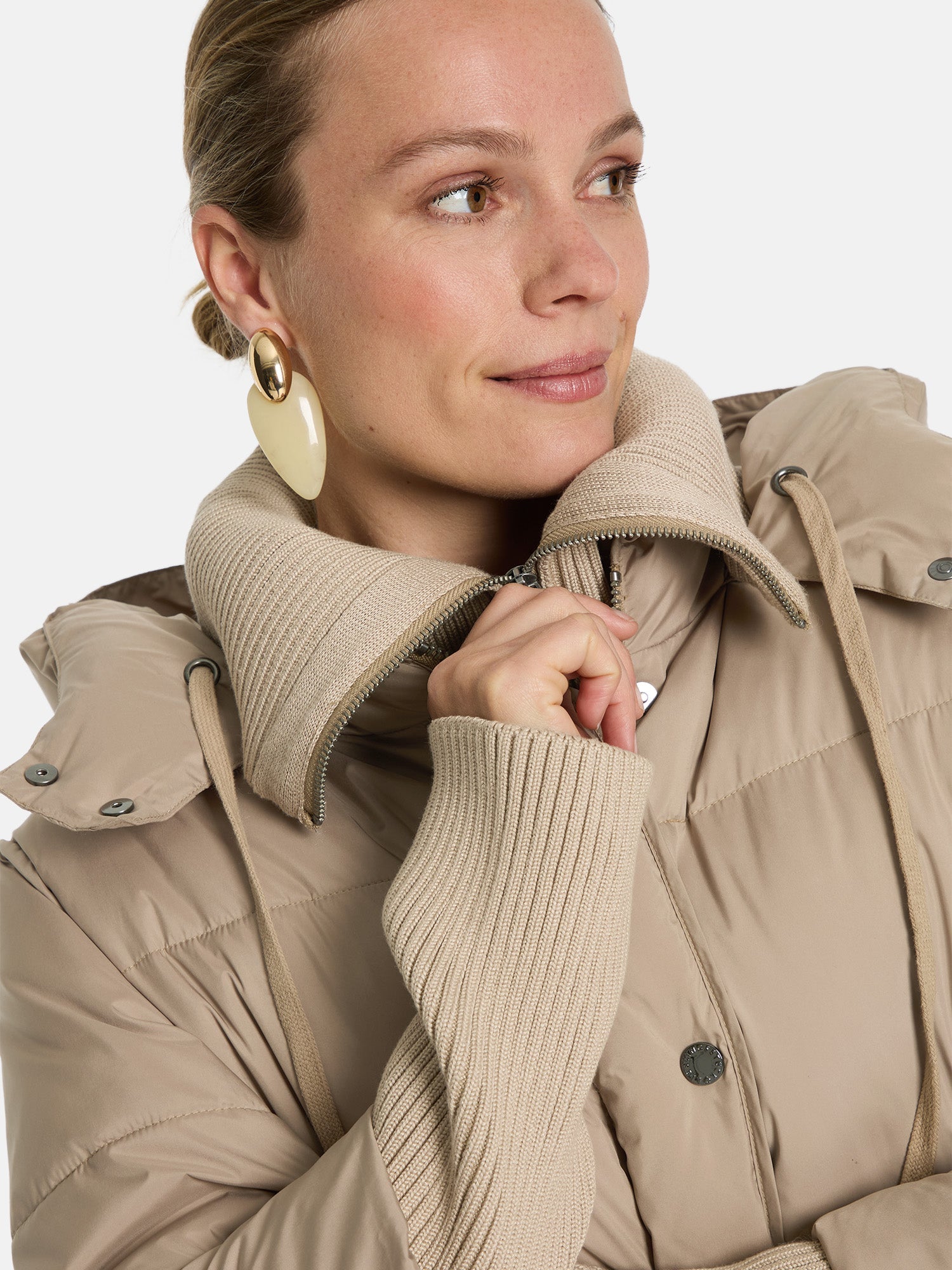 Diese wattierte Jacke ist Dein neuer Lieblingsbegleiter für kalte Tage! Der große Strickkragen schmiegt sich herrlich weich um Deinen Hals, während die Kapuze mit Reißverschluss und Druckknöpfen einfach praktisch und stylisch zugleich ist. Strickbündchen an den Ärmeln machen den Kuschel-Look perfekt!