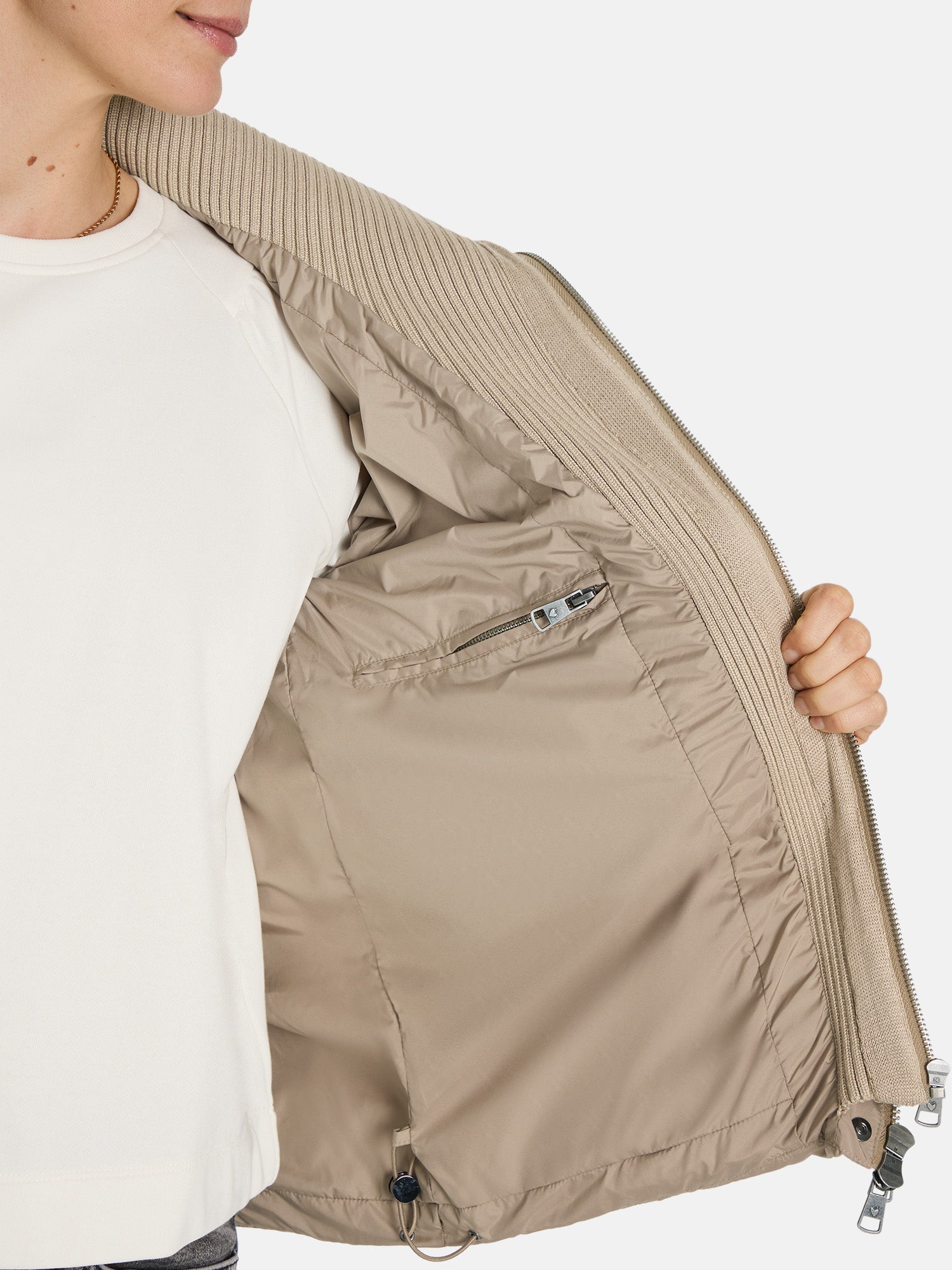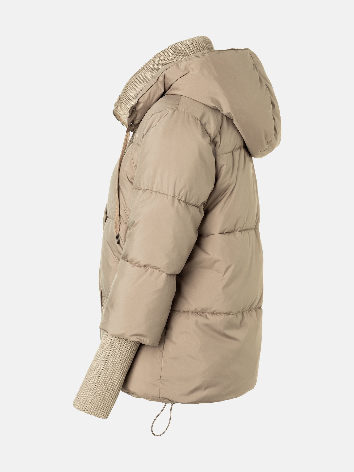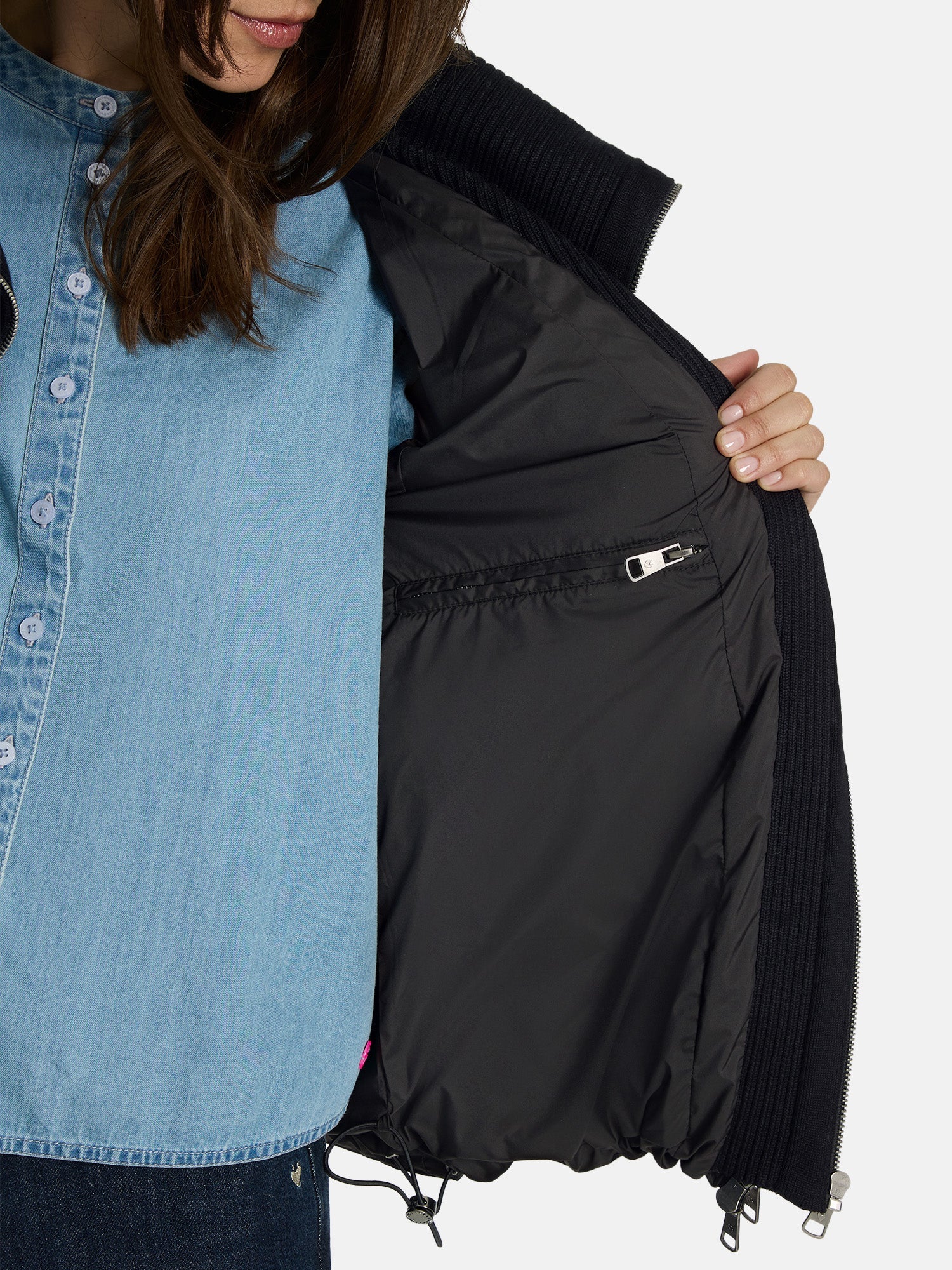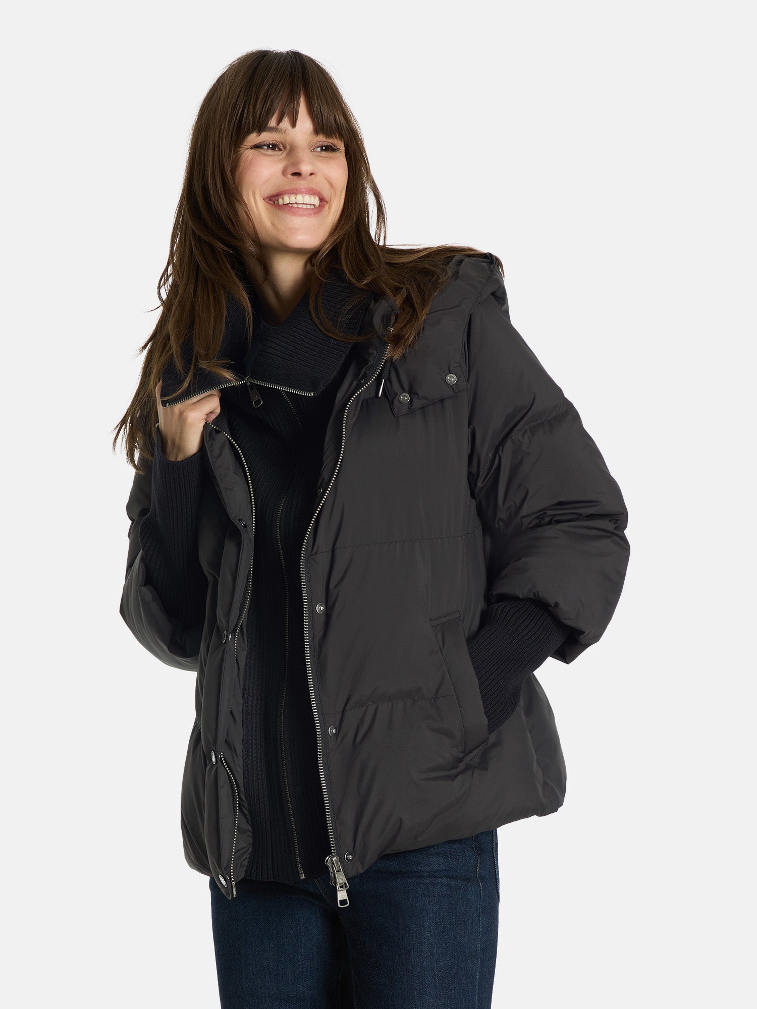 Diese wattierte Jacke ist Dein neuer Lieblingsbegleiter für kalte Tage! Der große Strickkragen schmiegt sich herrlich weich um Deinen Hals, während die Kapuze mit Reißverschluss und Druckknöpfen einfach praktisch und stylisch zugleich ist. Strickbündchen an den Ärmeln machen den Kuschel-Look perfekt!