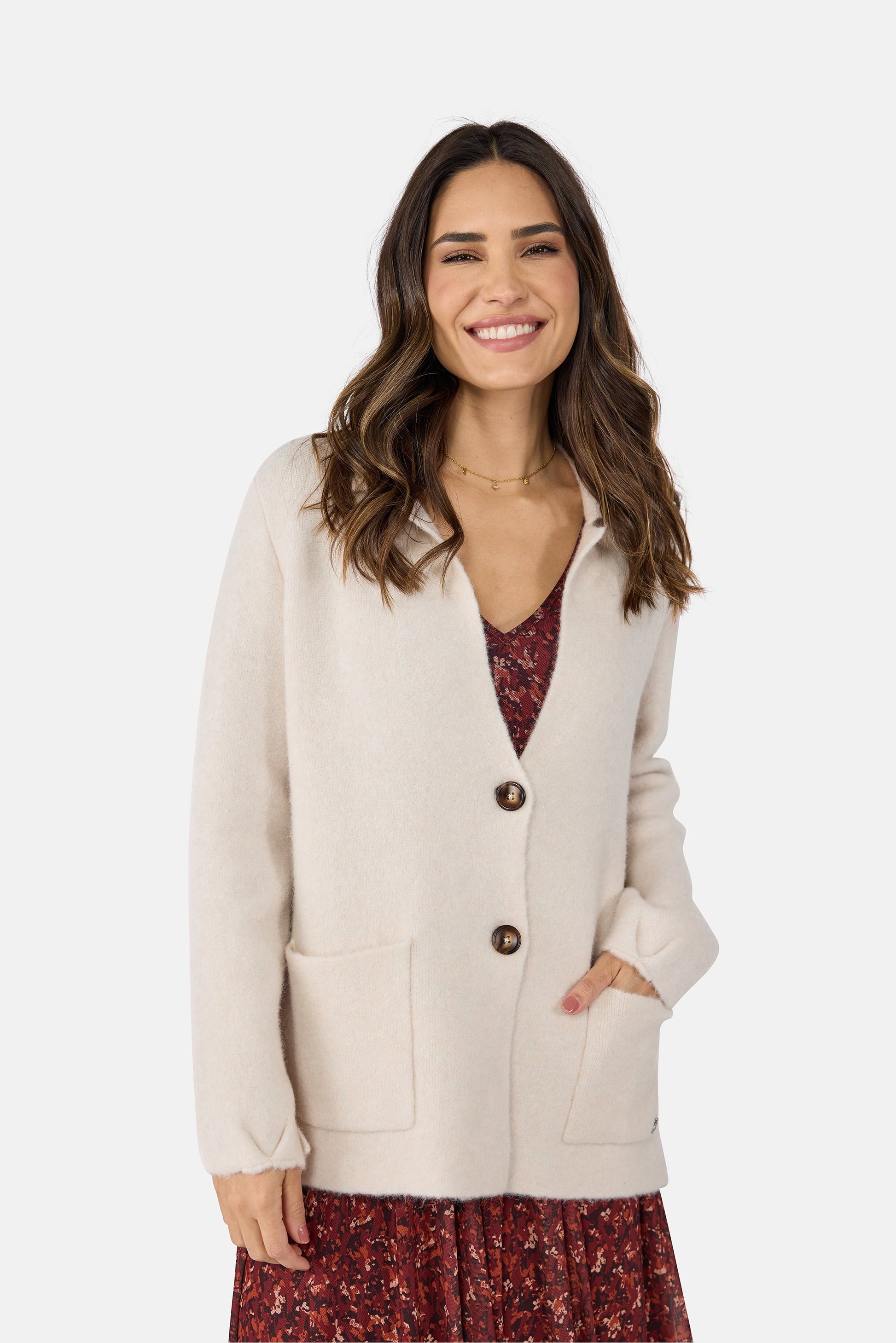 Diese Strickjacke ist der ideale Begleiter für Deine Herbstspaziergänge. Wenn die Blätter unter Deinen Füßen rascheln und die kühle Brise Dir um die Nase weht, gibt es nichts Schöneres, als sich in eine gemütliche Strickjacke zu kuscheln. Unsere Strickjacke mit Reverskragen und Knopfleiste ist genau dafür gemacht – für die besonderen Momente, in denen Du Dich dabei wohlig warm und stilvoll angezogen fühlst.