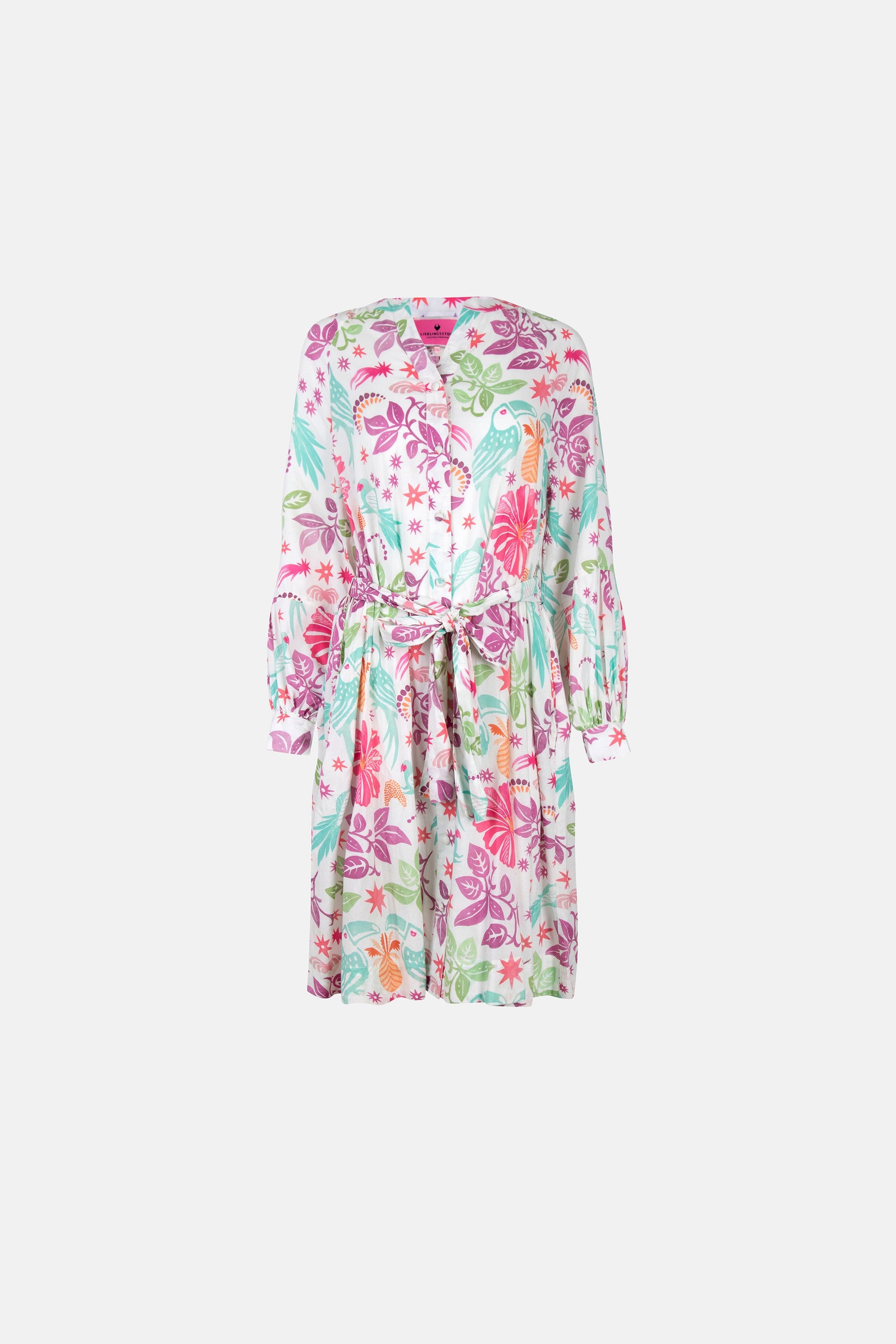 Follow me to paradise, ruft Dir dieser wunderschöne Tropenprint förmlich entgegen. Und nicht nur das, das Kleid lockt mit tollen Puffärmeln, V-Ausschnitt und einem Bindegürtel, der die Taille schmeichelhaft betont. Ein echtes LIEBLINGSSTÜCK.
