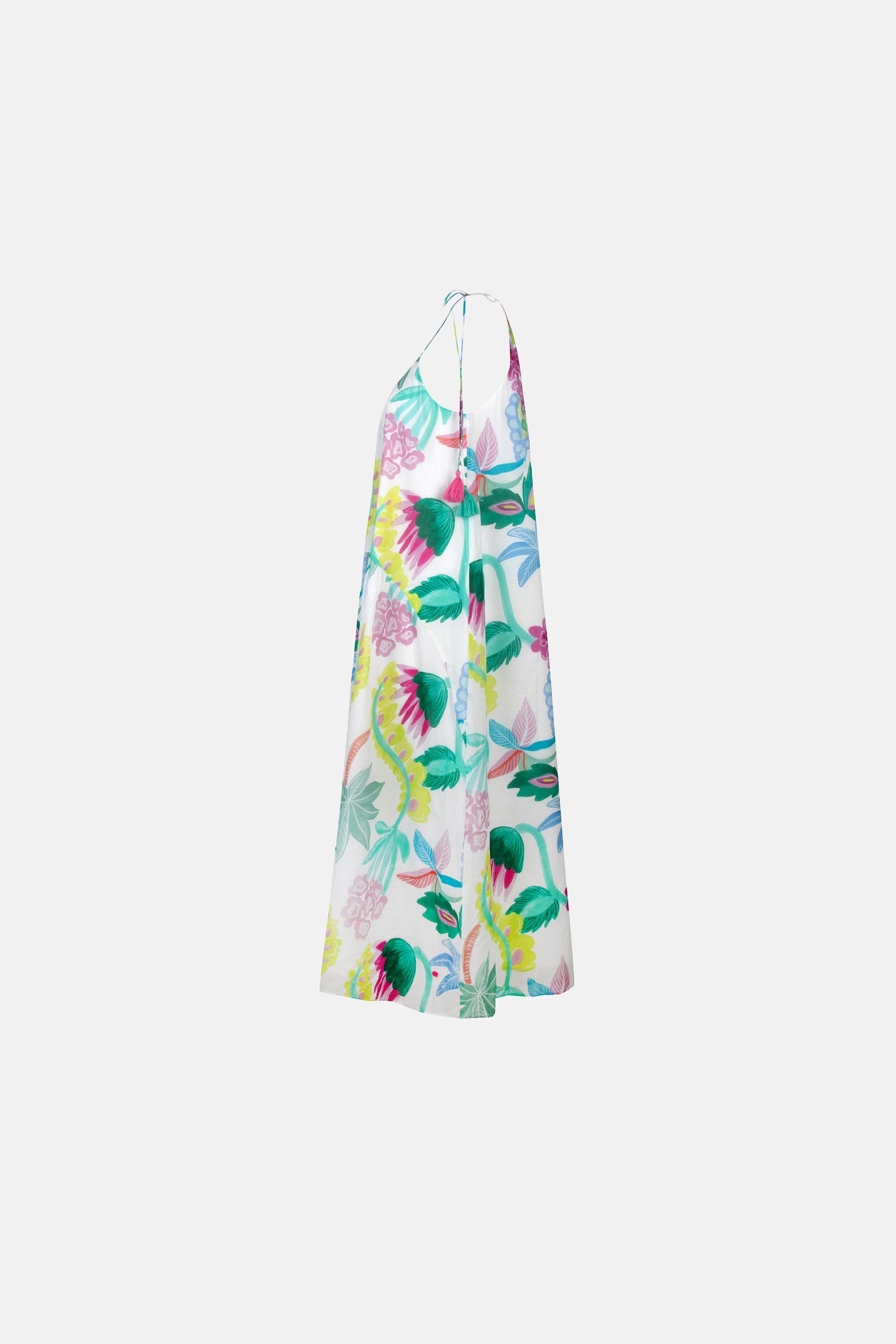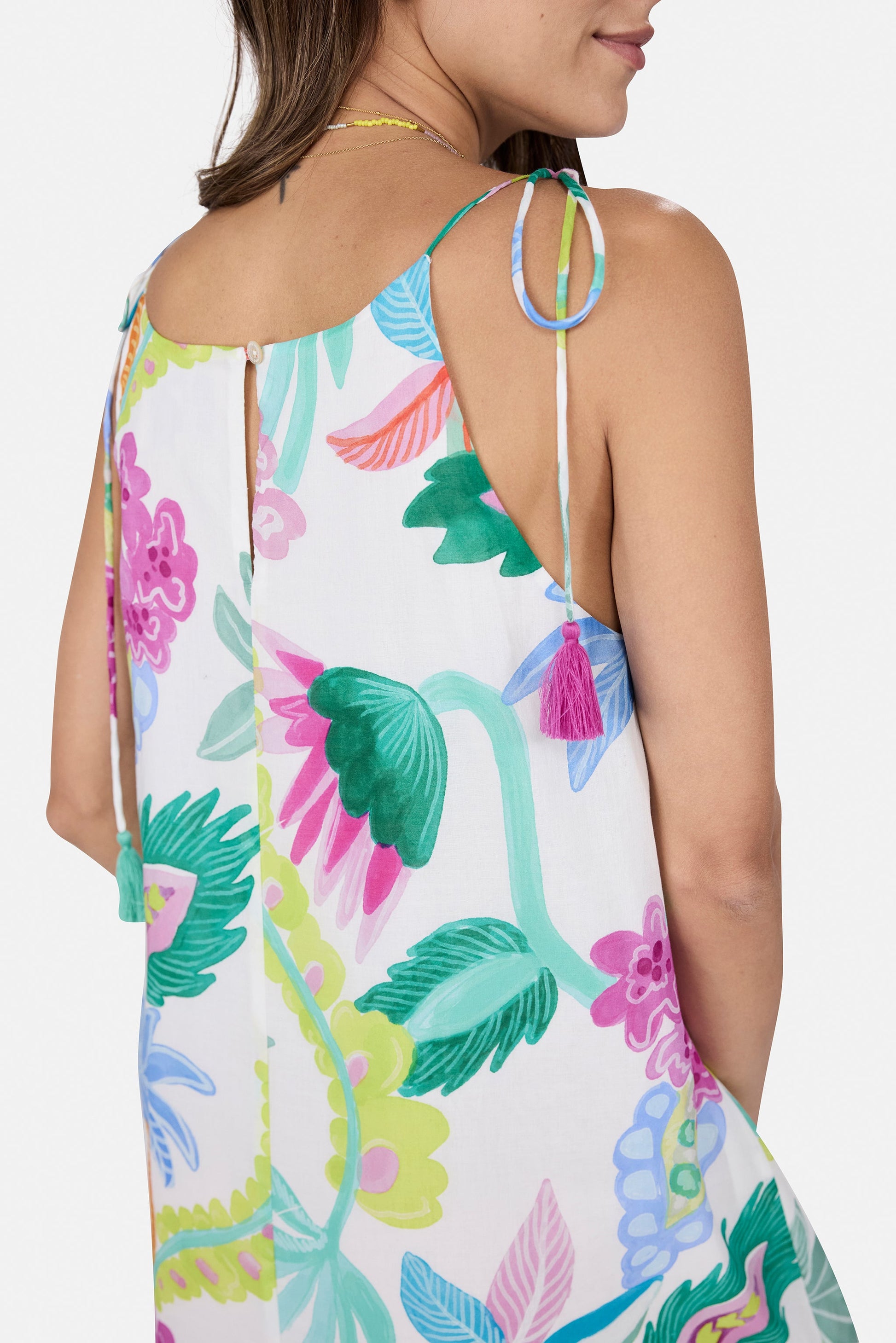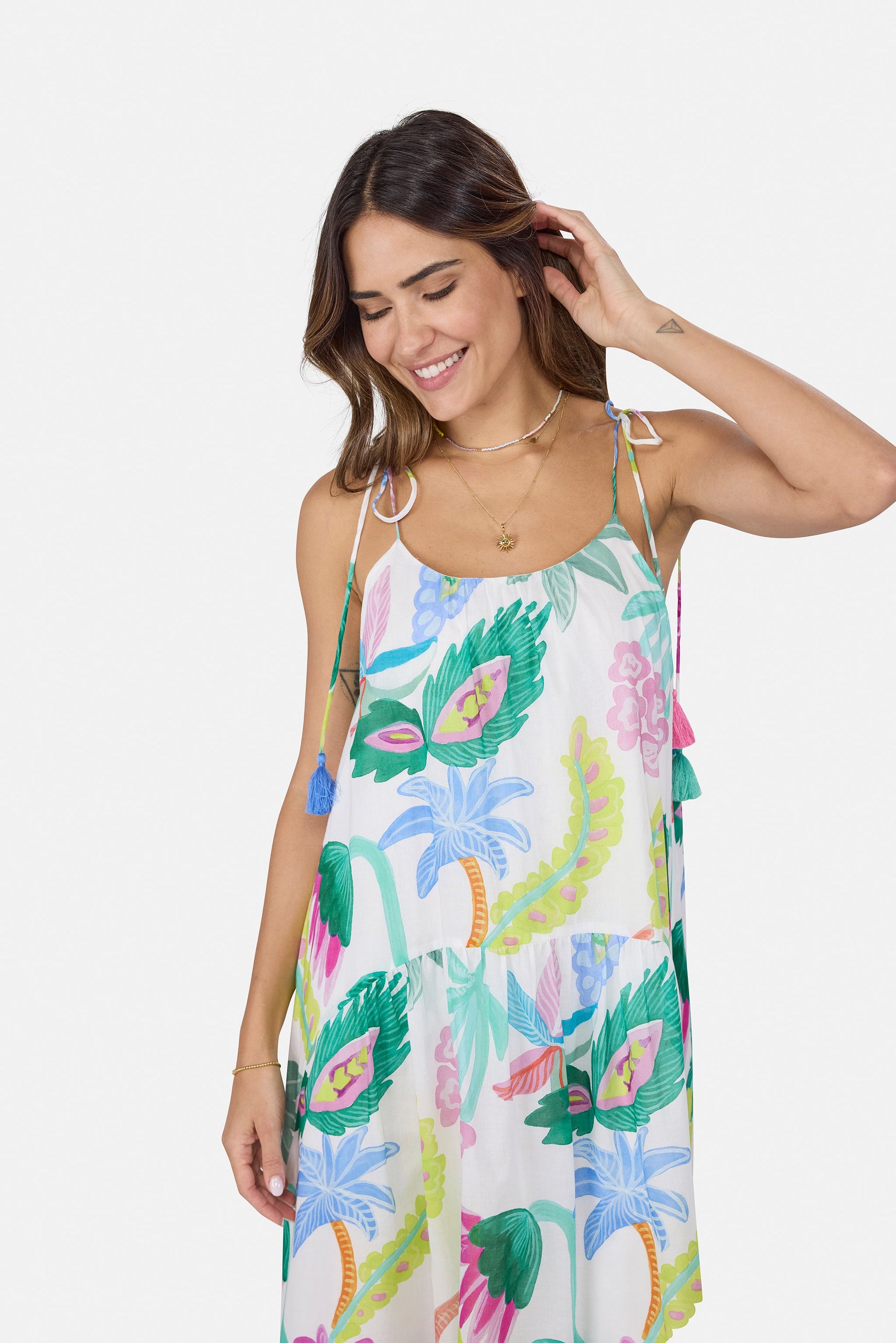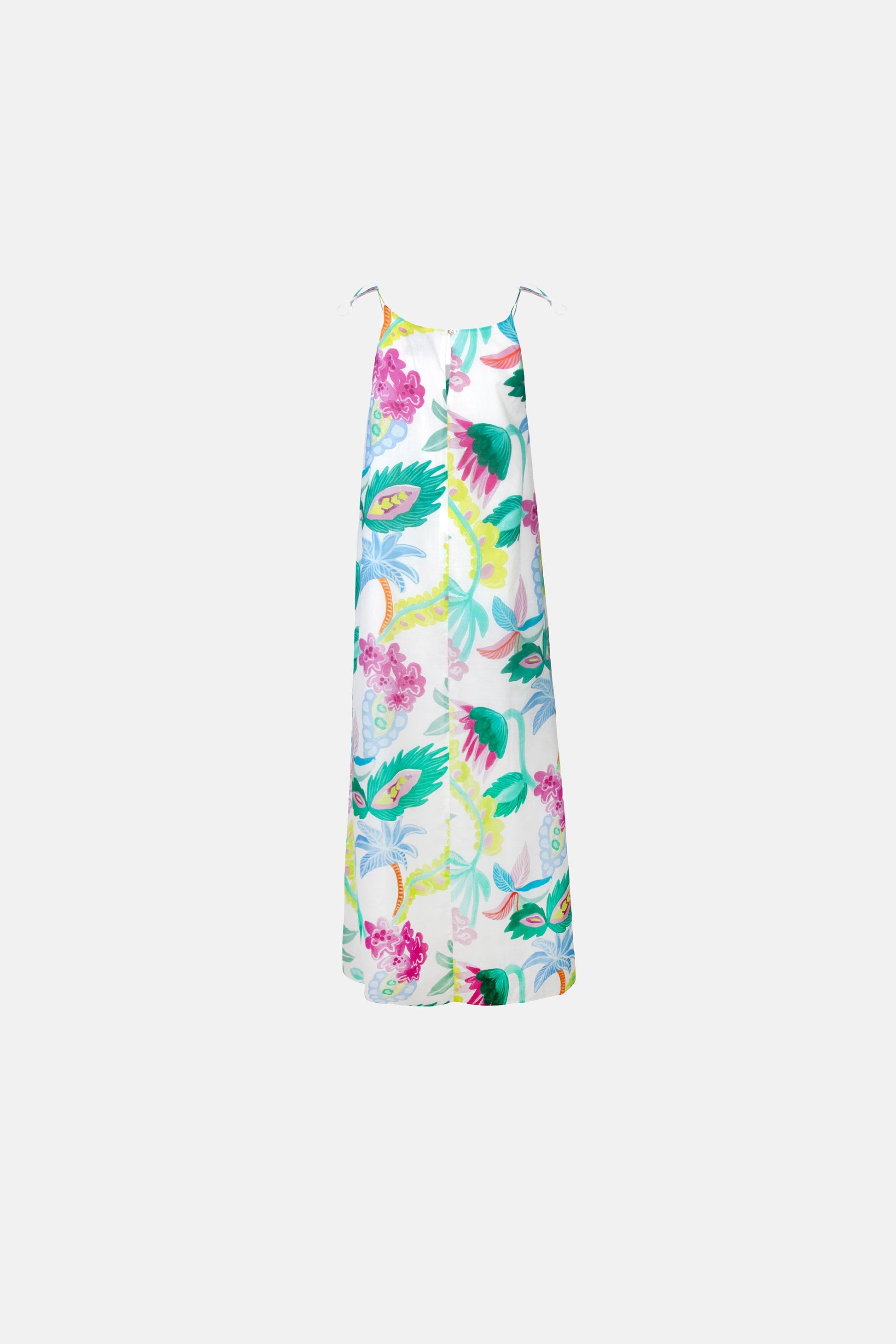 Zart und sommerlich: Dieses Kleid mit feinen Trägern und buntem Print bringt Leichtigkeit in jeden warmen Tag.