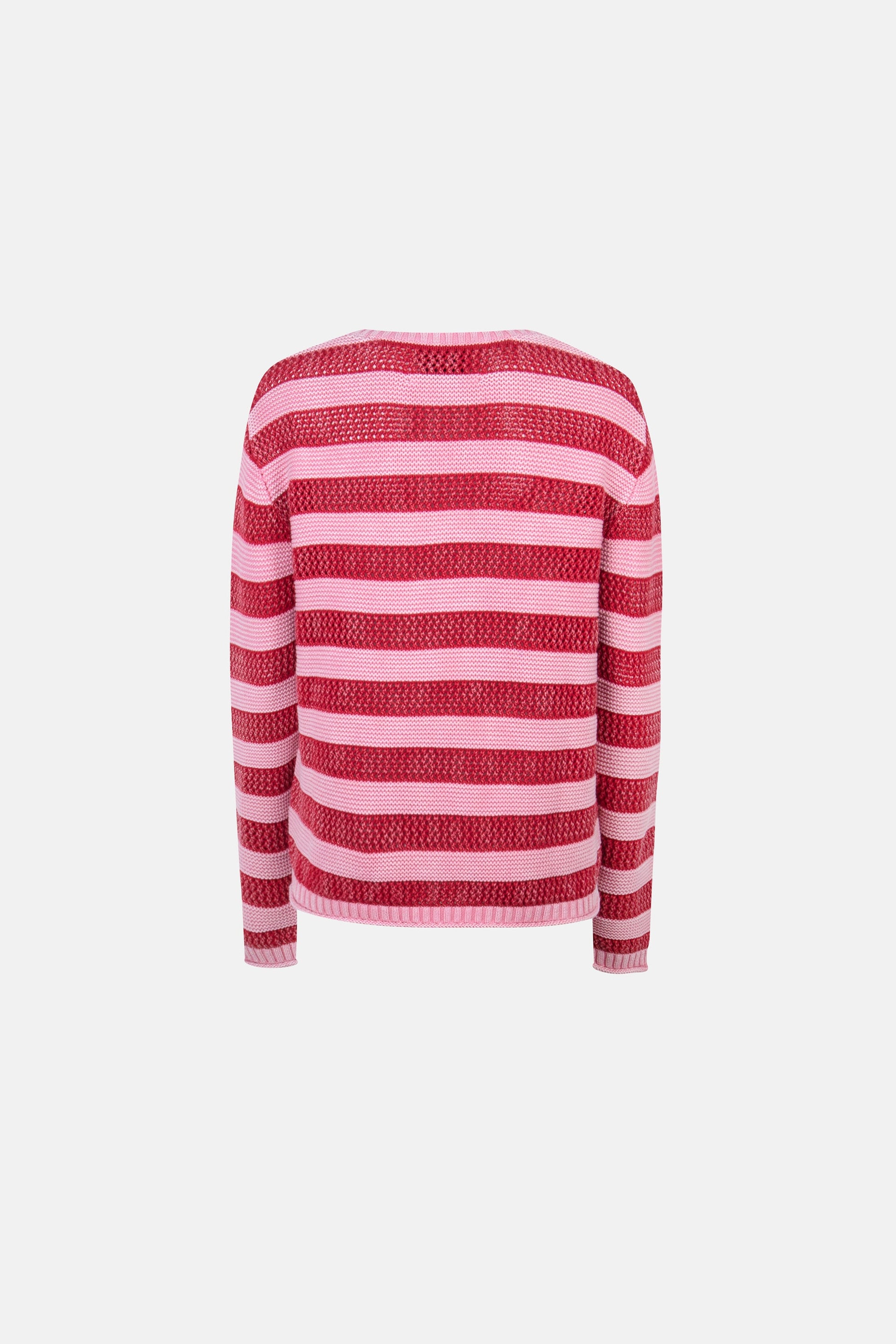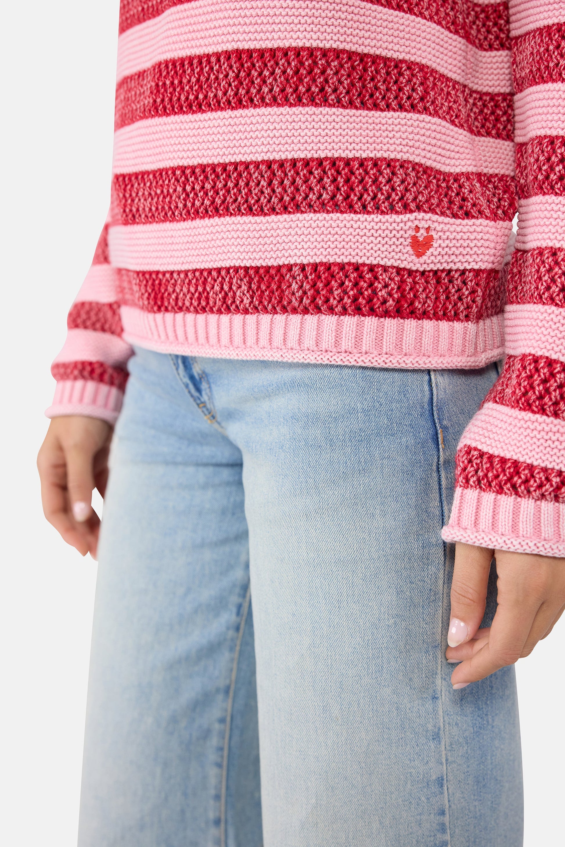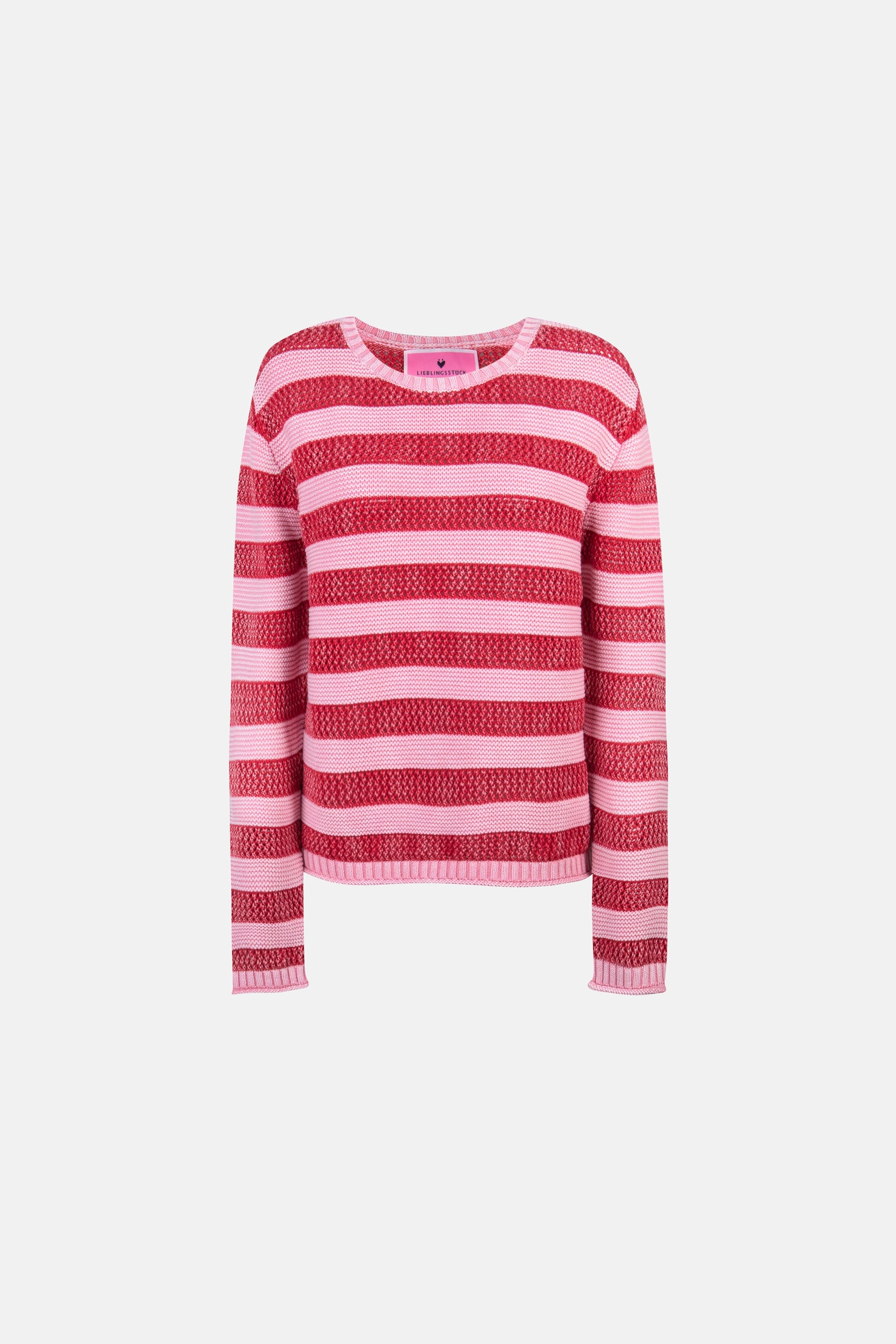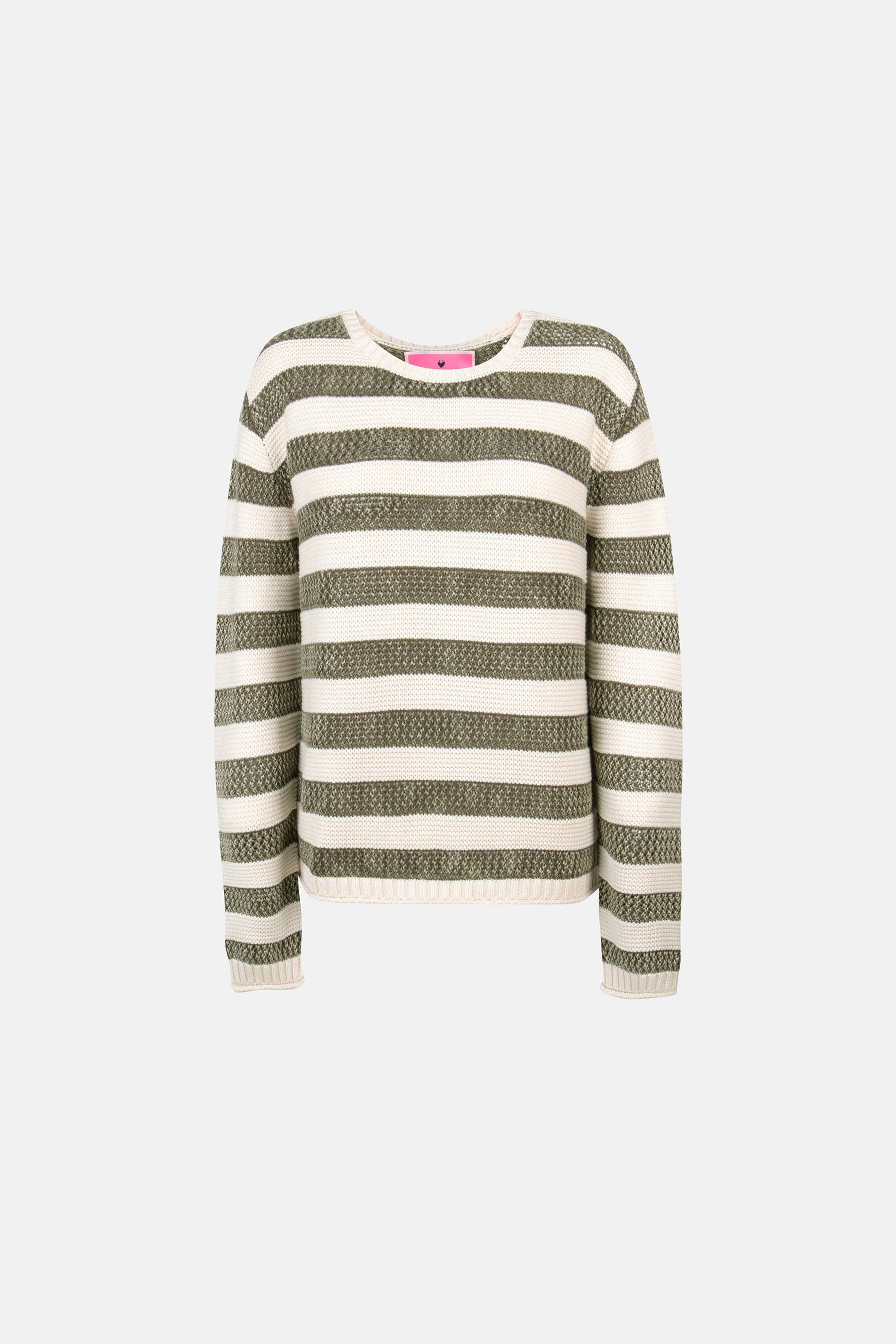 Ein Klassiker mit modernem Twist: Dieser Streifenpullover besticht durch seinen unkomplizierten Look und die feinen Lochstickereien, die ihm eine subtile, feminine Note verleihen. Der Rundhalsausschnitt sorgt für einen lässigen, aber dennoch eleganten Look, der wunderbar durch den Alltag begleitet.
