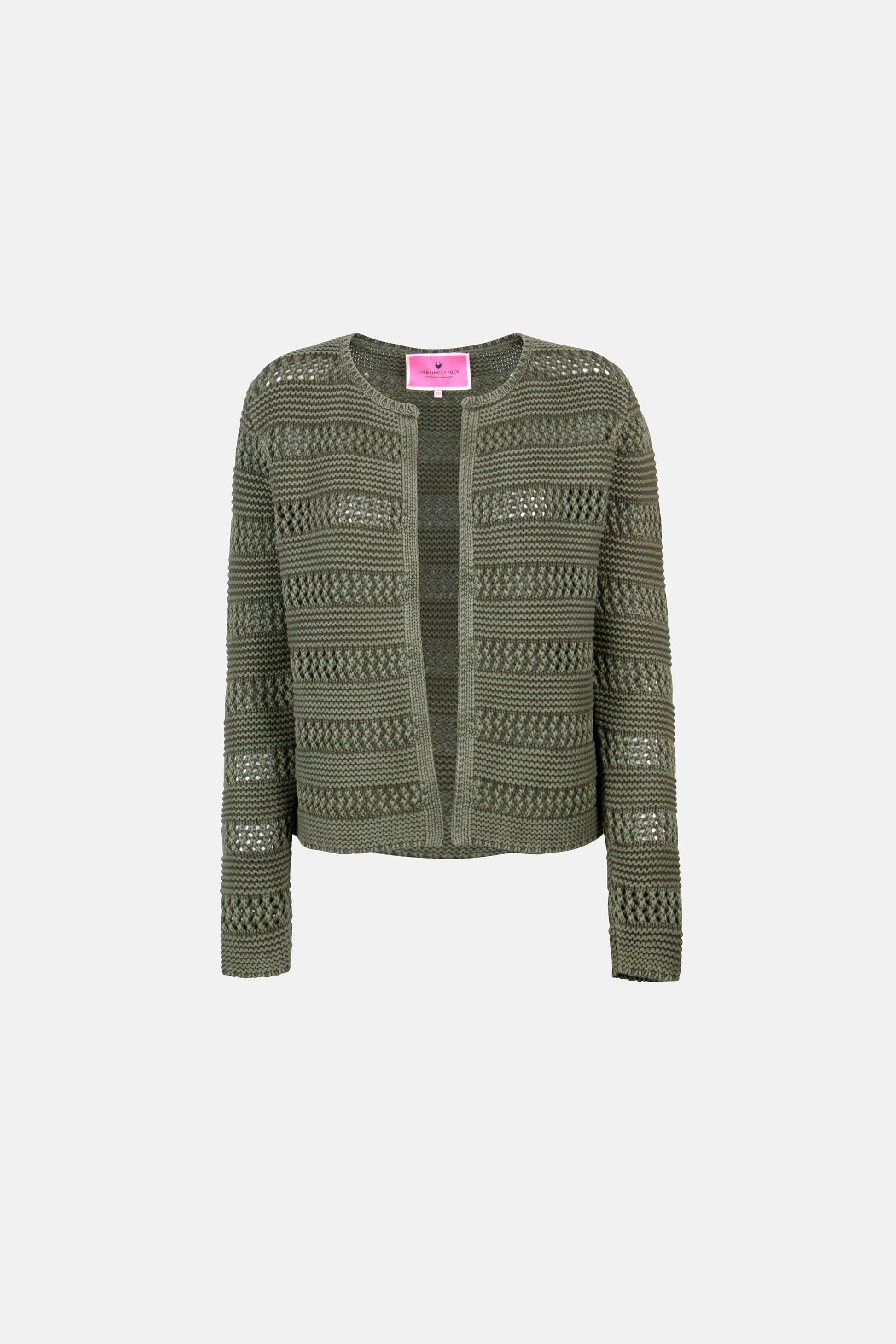Ein Hauch von Frische und Raffinesse: Dieses kürzere Strickjäckchen in sanfter Thymian-Farbe bringt natürliche Eleganz in deinen Kleiderschrank. Das zarte Pointelle-Muster verleiht dem Jäckchen eine besondere Struktur und macht es zu einem echten Blickfang und zu Deinem neuen LIEBLINGSSTÜCK.