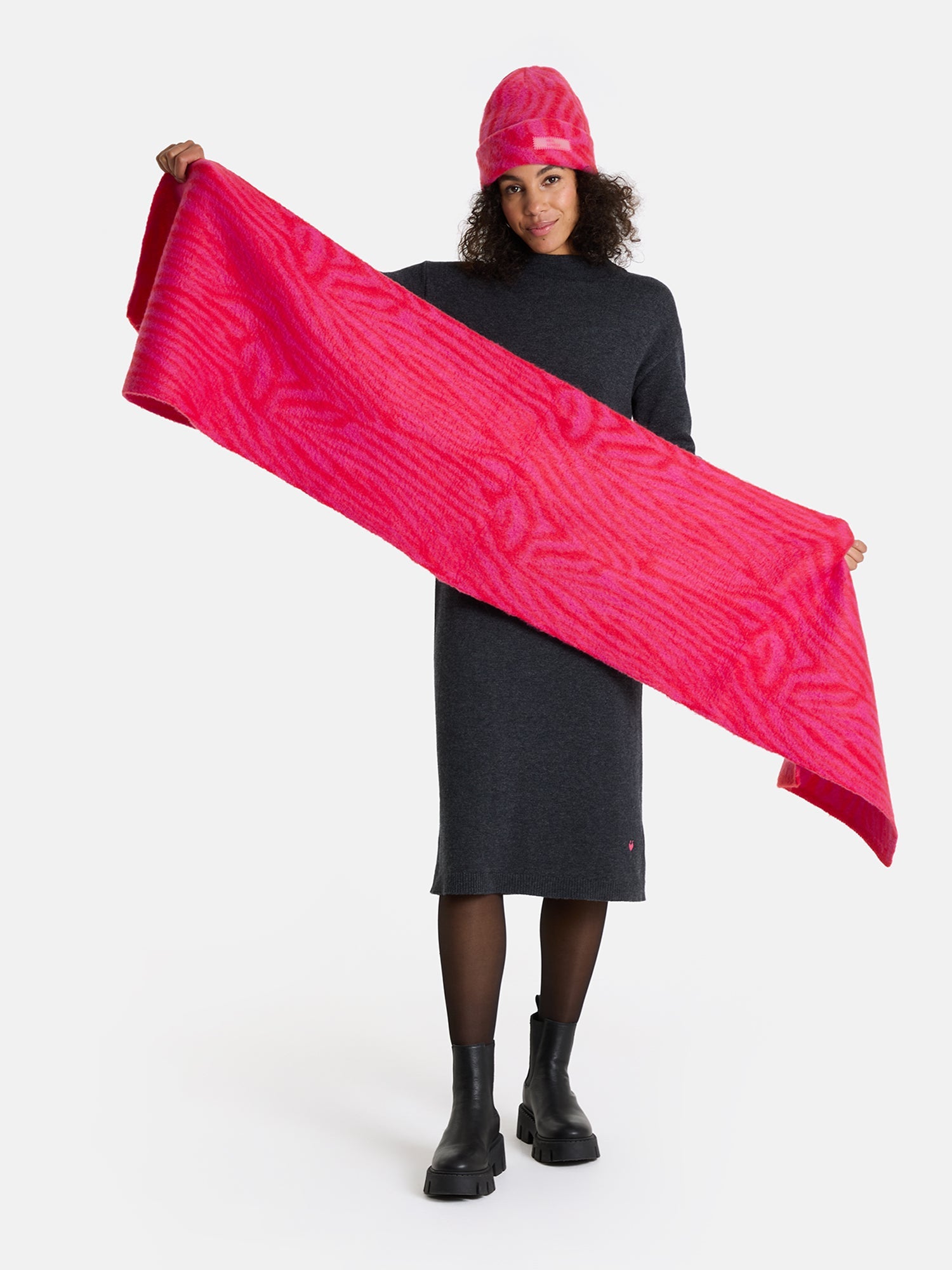 Dieser Schal ist Dein perfekter Begleiter für kalte Tage. Das weiche Strickmaterial hält Dich warm und fühlt sich angenehm auf der Haut an. Das harmonische Muster macht das Duo zu einem stylischen Lieblingsstück, das Deinen Winter-Look komplett macht.
