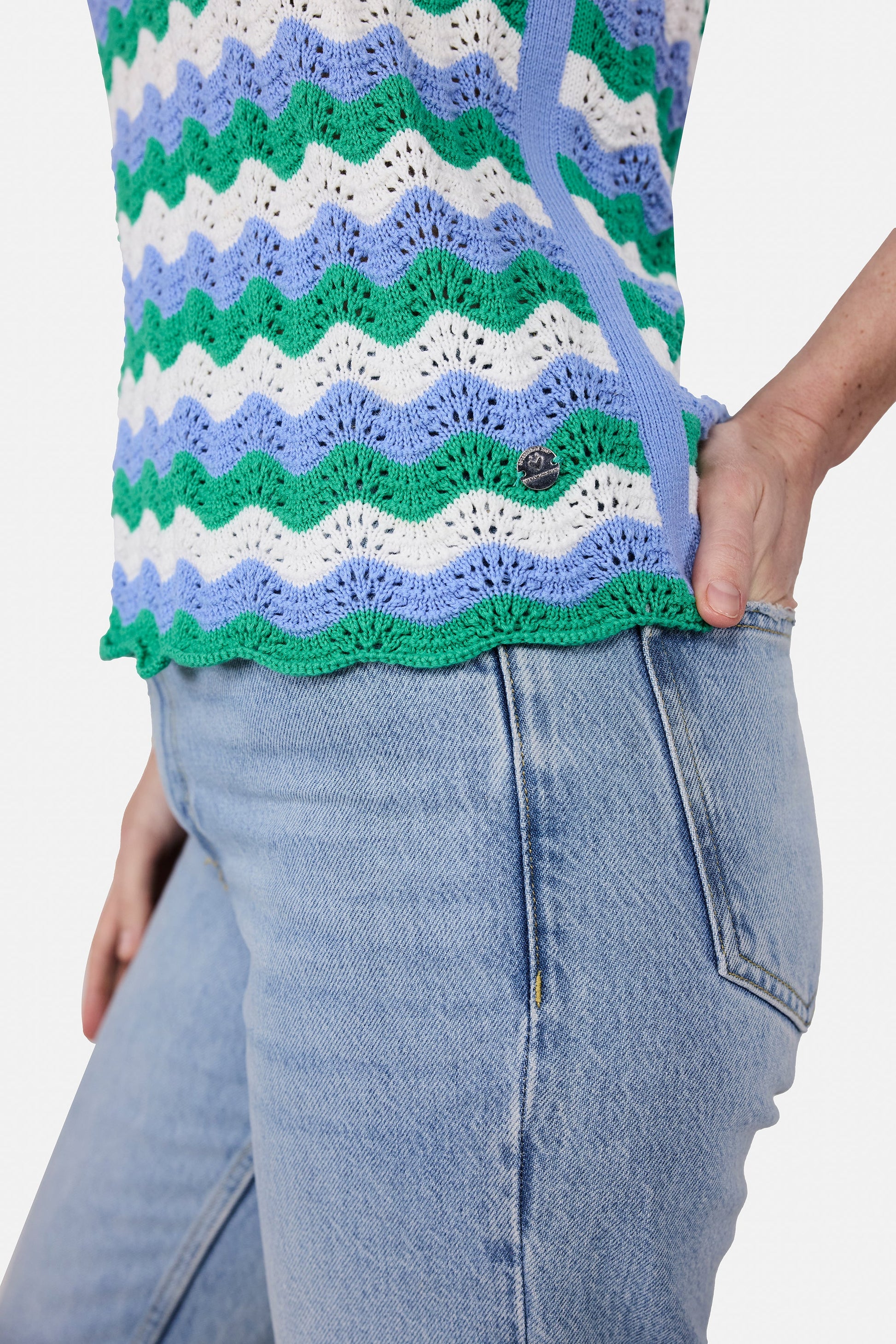 Ein echtes Fashion-Highlight! Dieses ärmellose Stricktop begeistert mit seiner einzigartigen Wellenstruktur, die Deinem Look eine besondere, stilvolle Note verleiht. Das leichte, anschmiegsame Material sorgt für höchsten Tragekomfort – perfekt für warme Tage oder als trendiges Layering-Piece.
