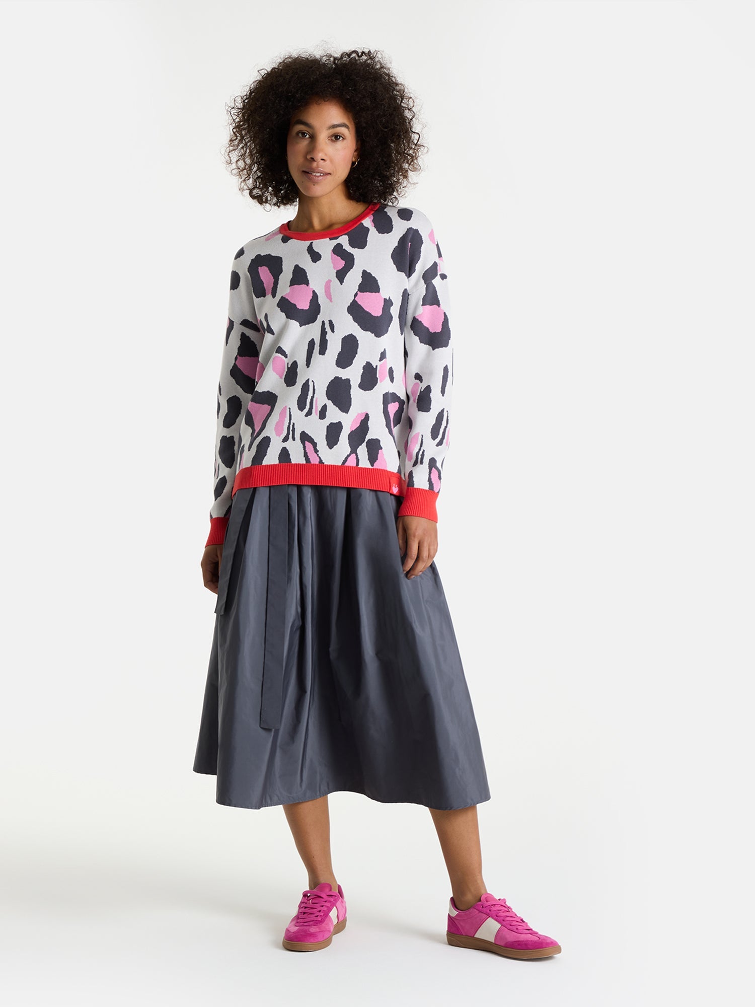 Dieser Pullover von LIEBLINGSSTÜCK zieht mit seinem auffälligen Animal-Print garantiert alle Blicke auf sich. Die kräftigen Farben bringen gute Laune in Deinen Look und machen das Design zu einem echten Highlight. Der kontrastfarbene Rundhalsausschnitt und die farblich abgesetzten Bündchen setzen moderne Akzente. Dank der bequemen Passform trägt er sich wunderbar angenehm und lässt sich vielseitig stylen – ob casual zur Jeans oder als Eyecatcher im Büro. Ein Piece, das Modebewusstsein und Wohlfühlen perfekt verbindet. Mit diesem Pullover bringst Du frischen Wind in Deine Garderobe.