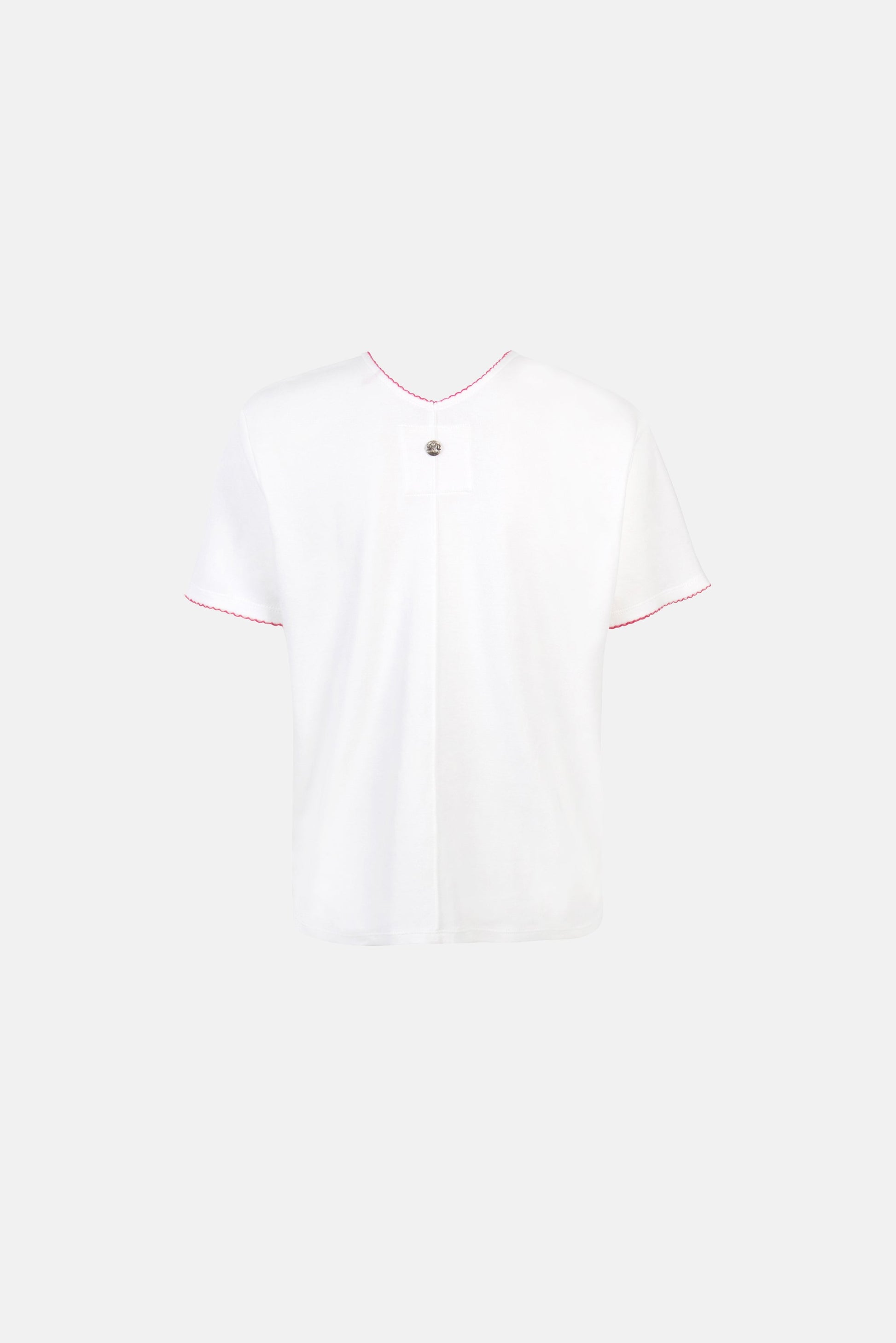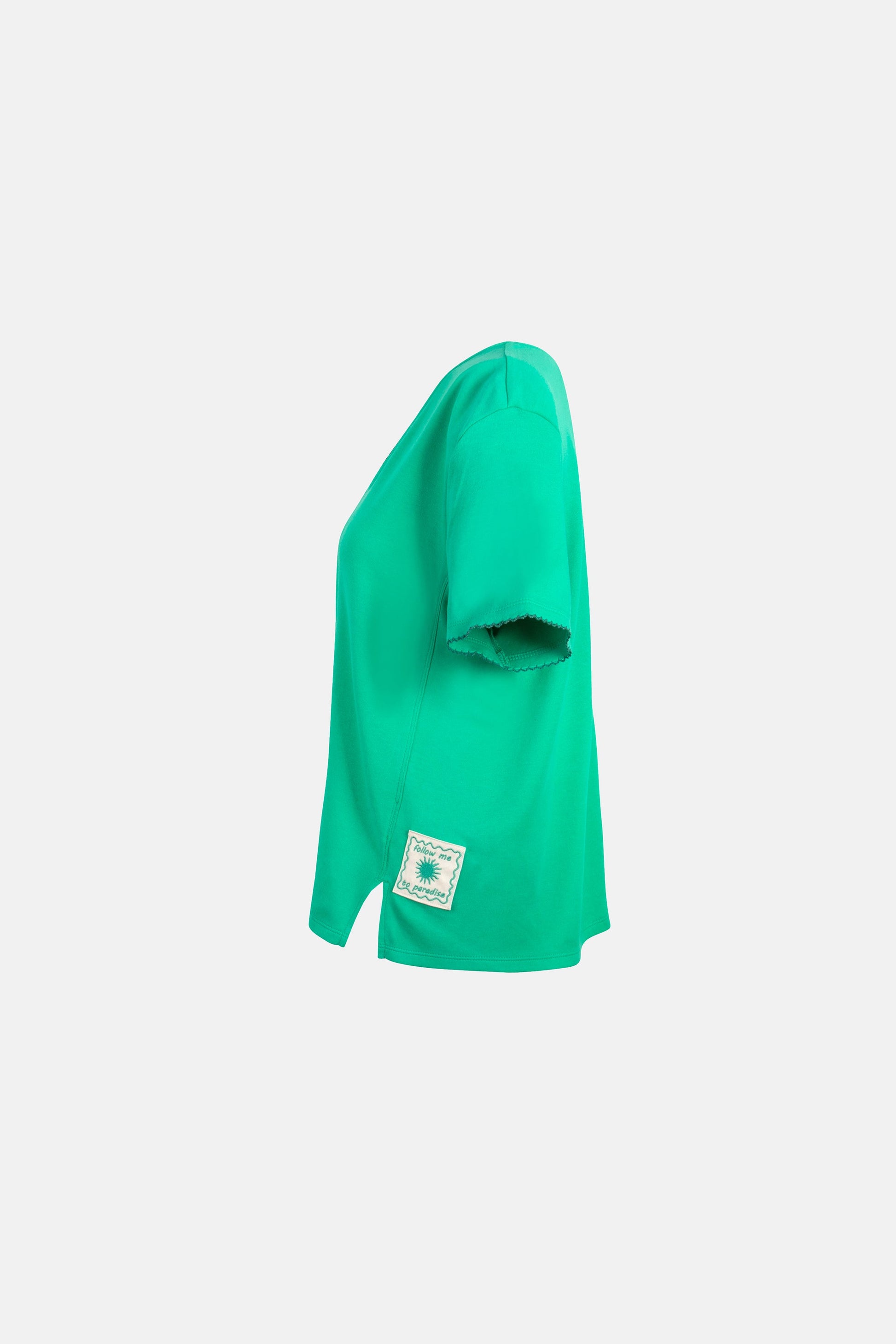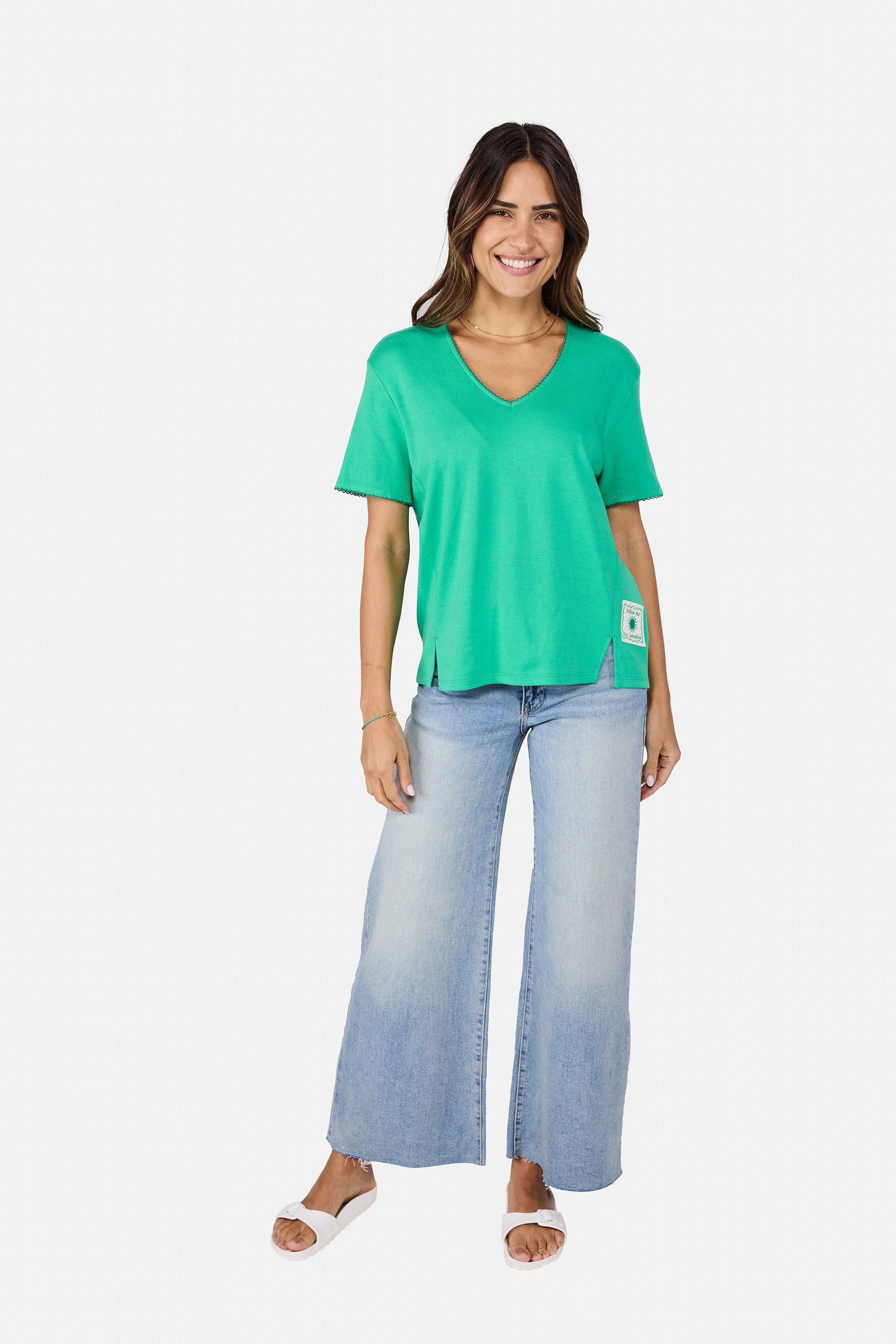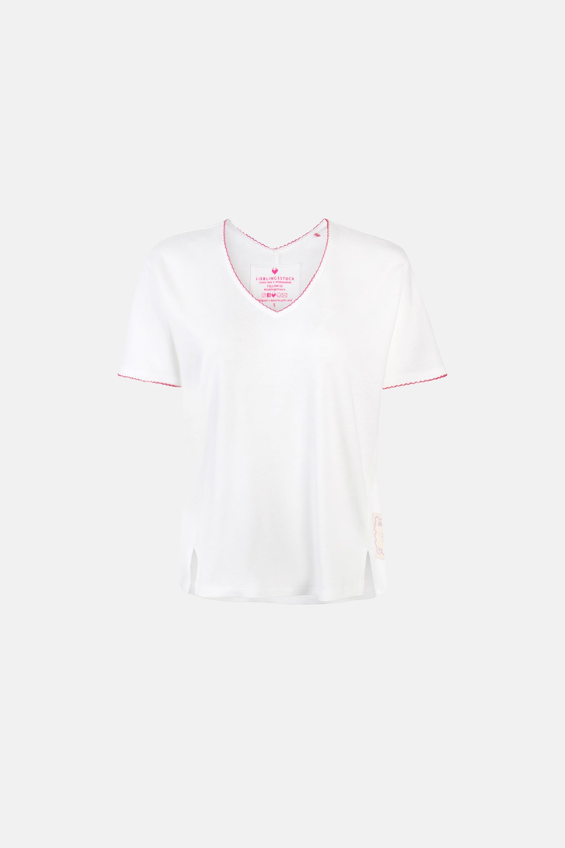 Lässig, modern und superbequem! Dieses T-Shirt überzeugt mit einem femininen V-Ausschnitt und einem stylischen Badge am Saum, das für einen besonderen Hingucker sorgt. Der lockere Schnitt und das weiche Material machen es zum perfekten Begleiter für entspannte, aber trendige Looks.
