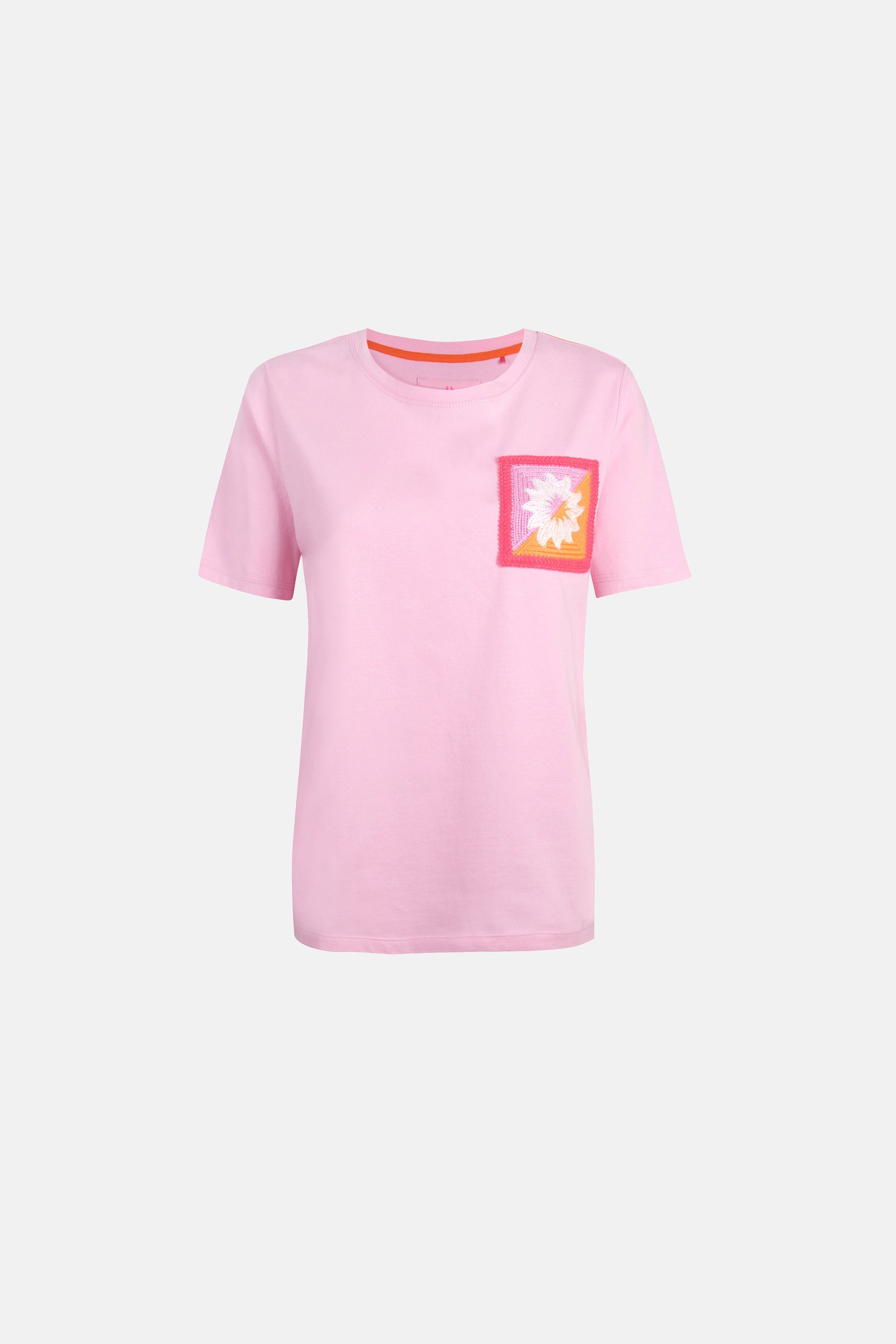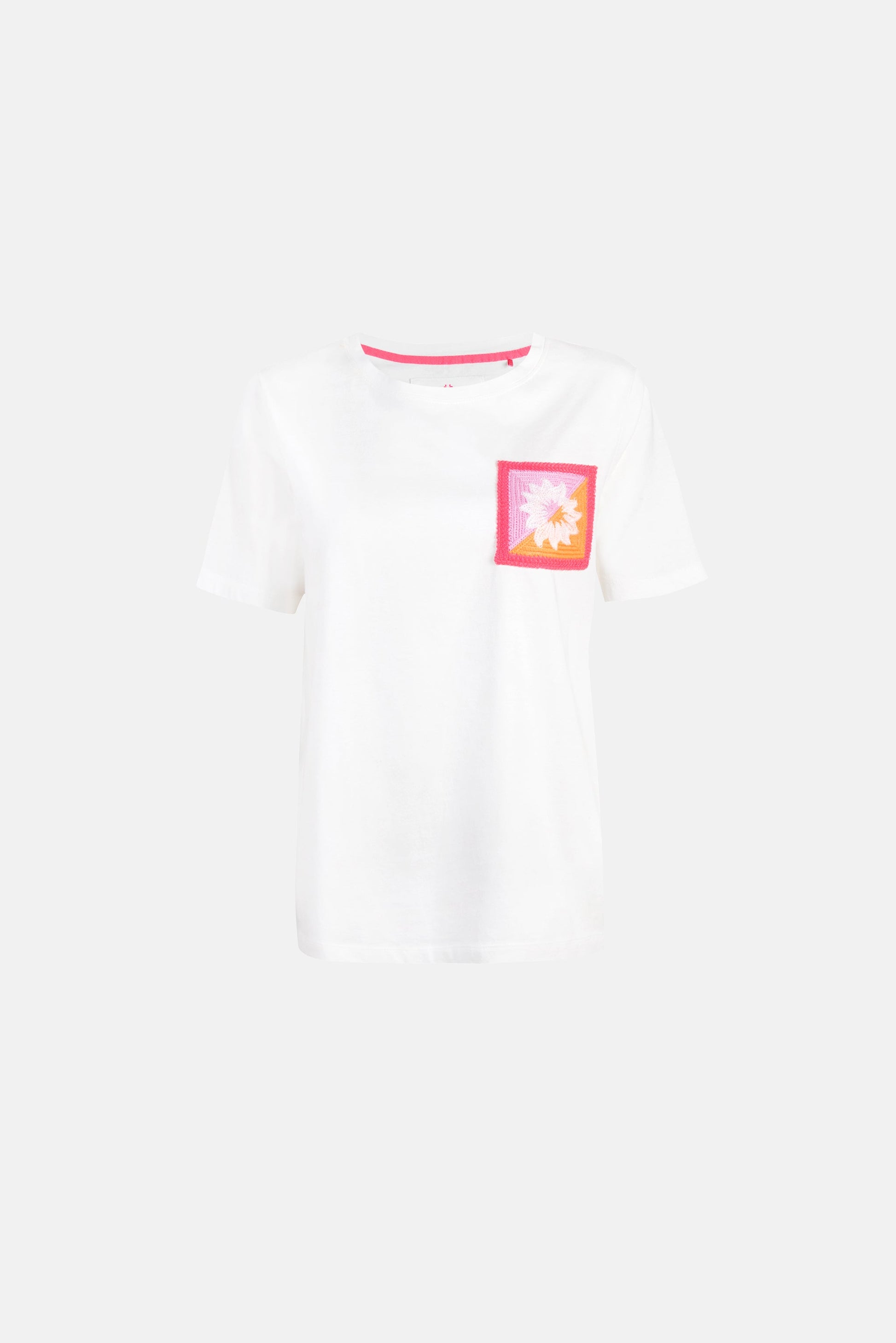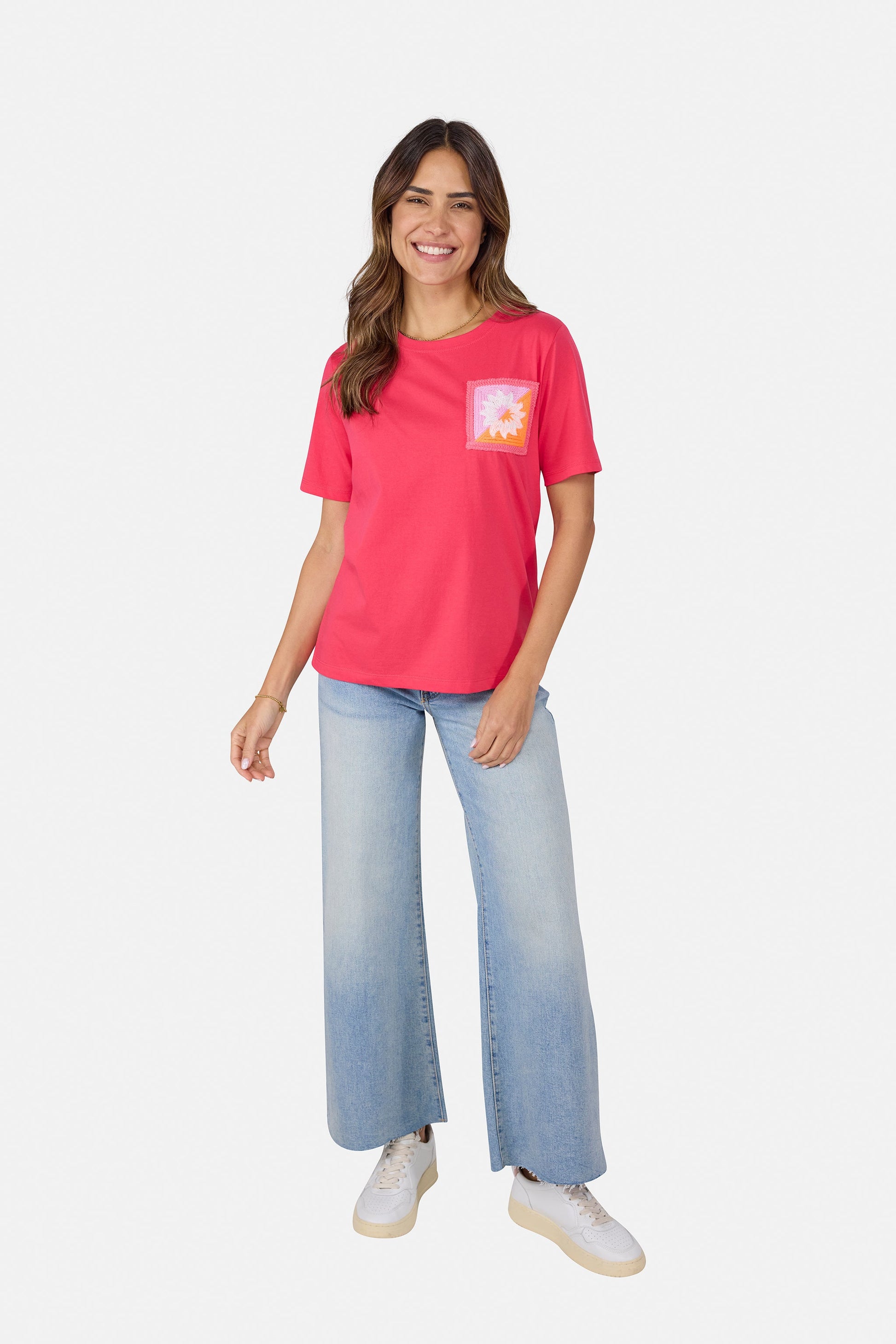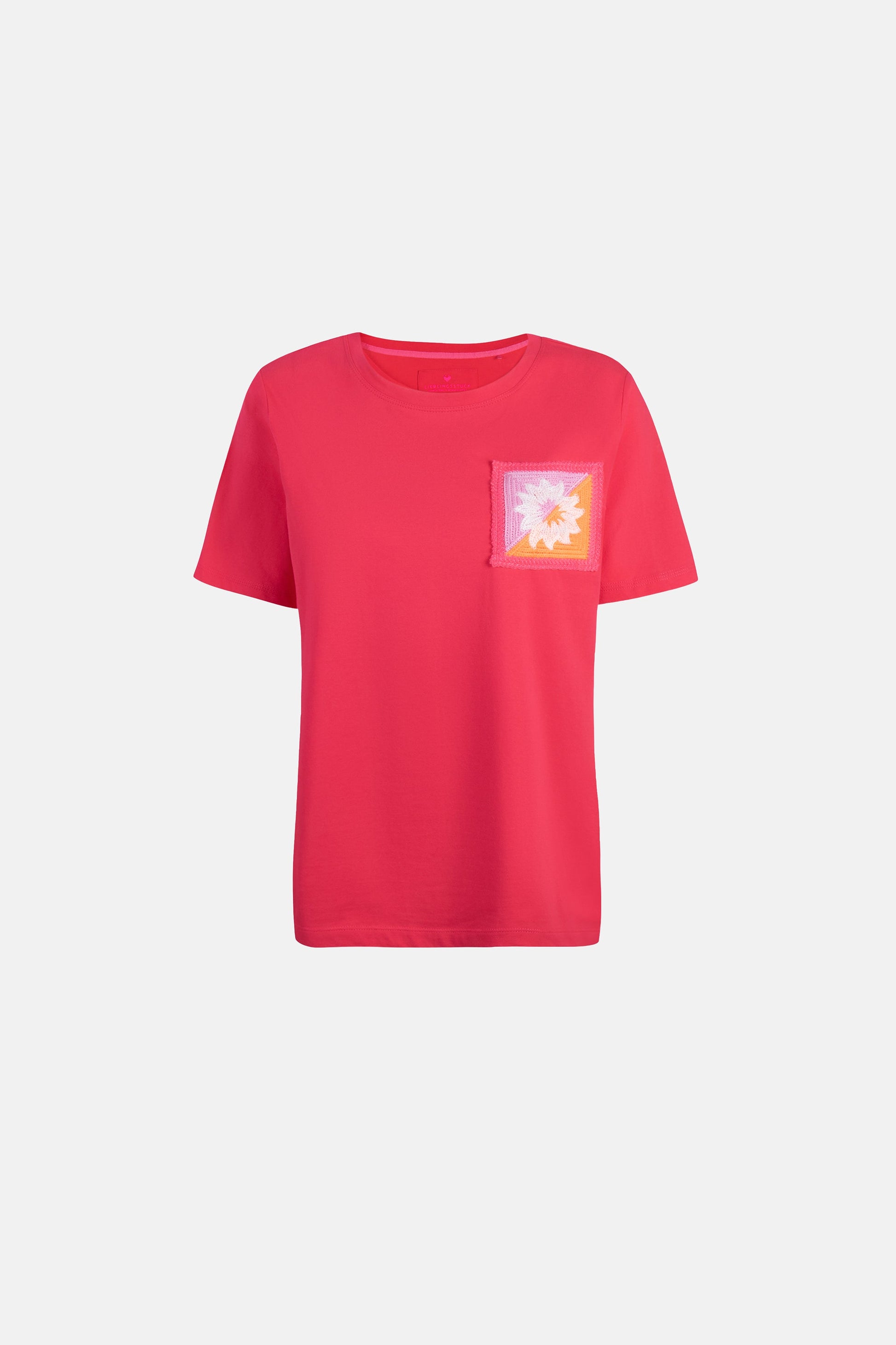 Dieses T-Shirt vereint schlichte Eleganz mit liebevollen Details. Das zarte Häkelmotiv auf der Brust verleiht dem klassischen Rundhals-Schnitt eine feminine Note und macht es zu einem besonderen LIEBLINGSSTÜCK.