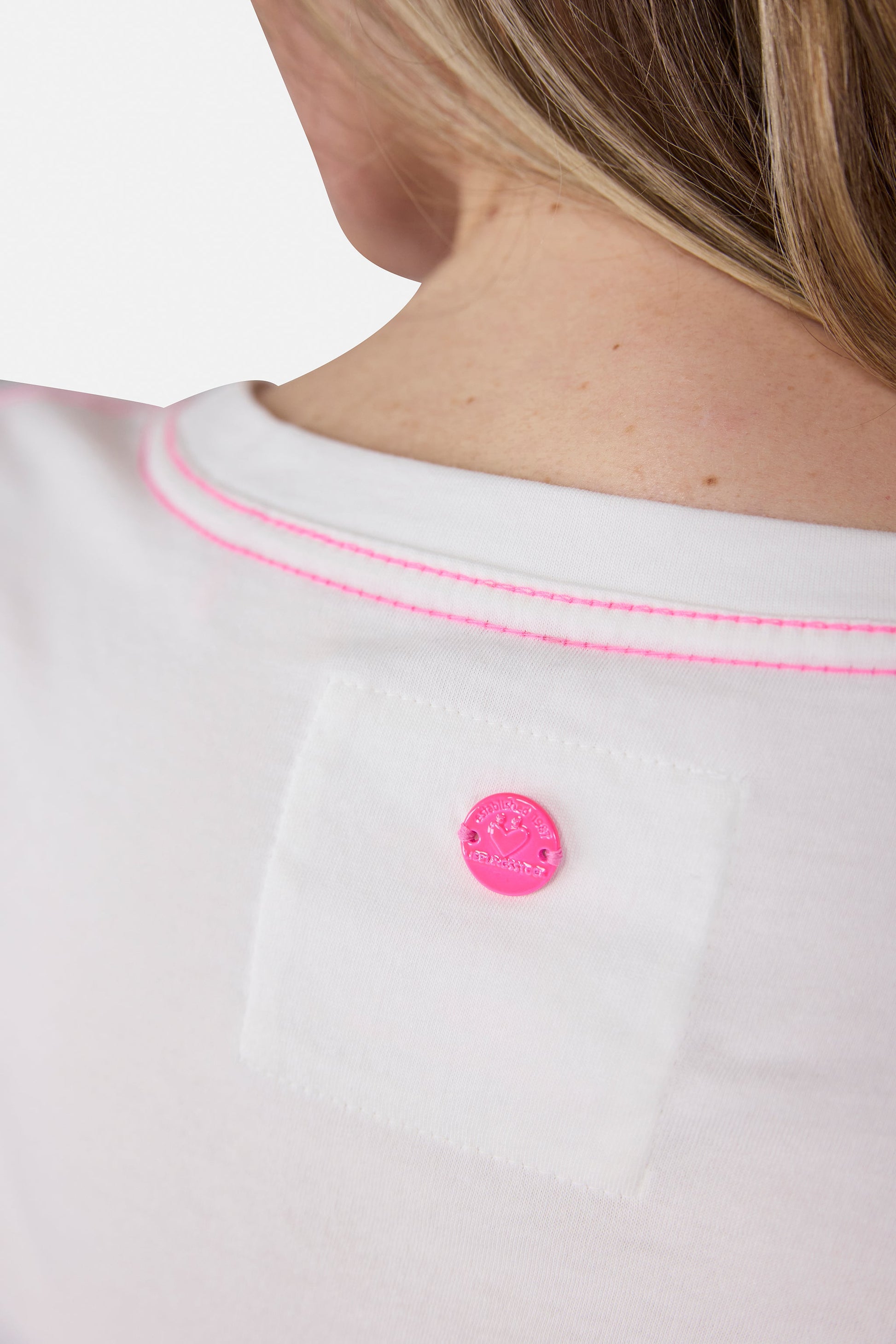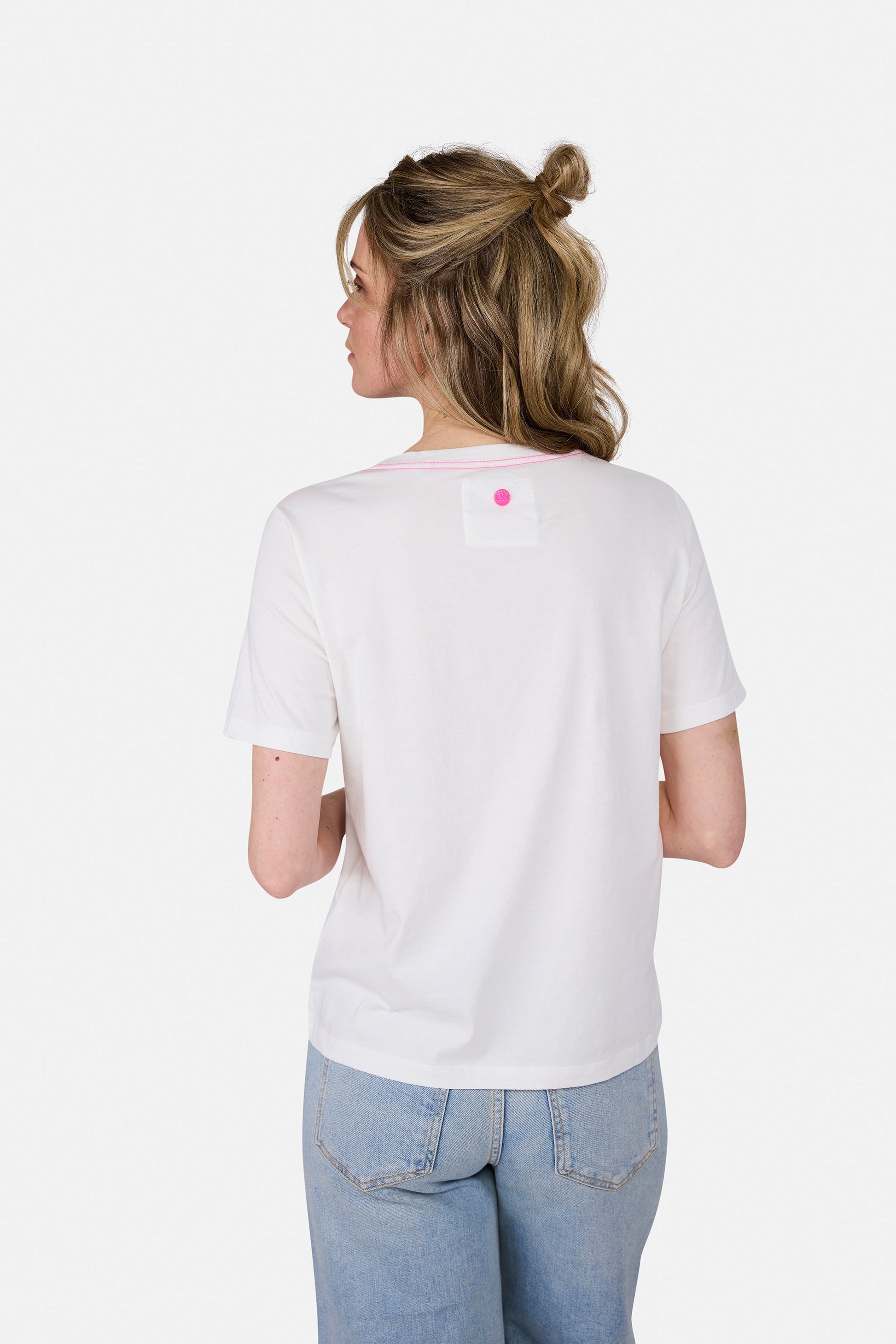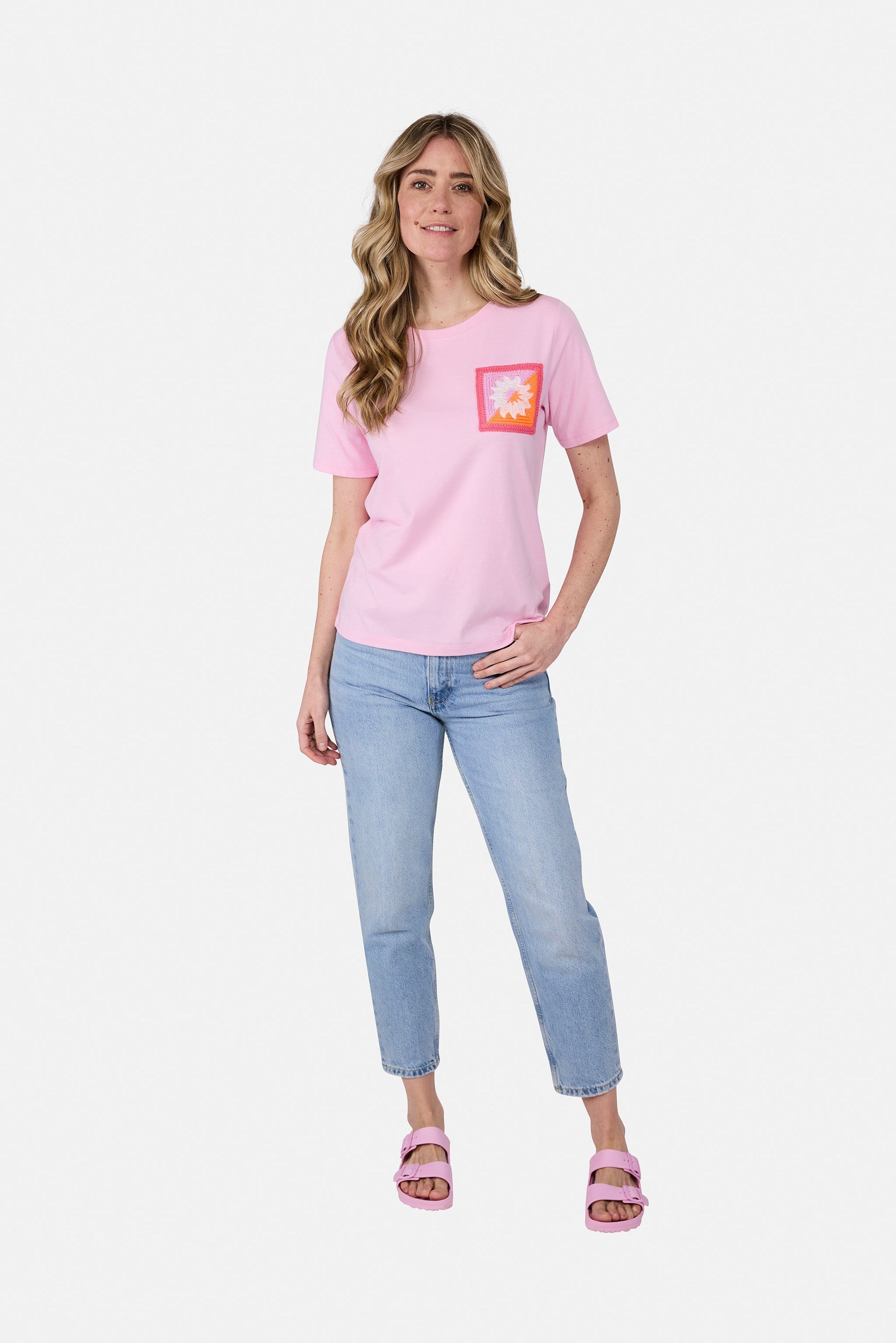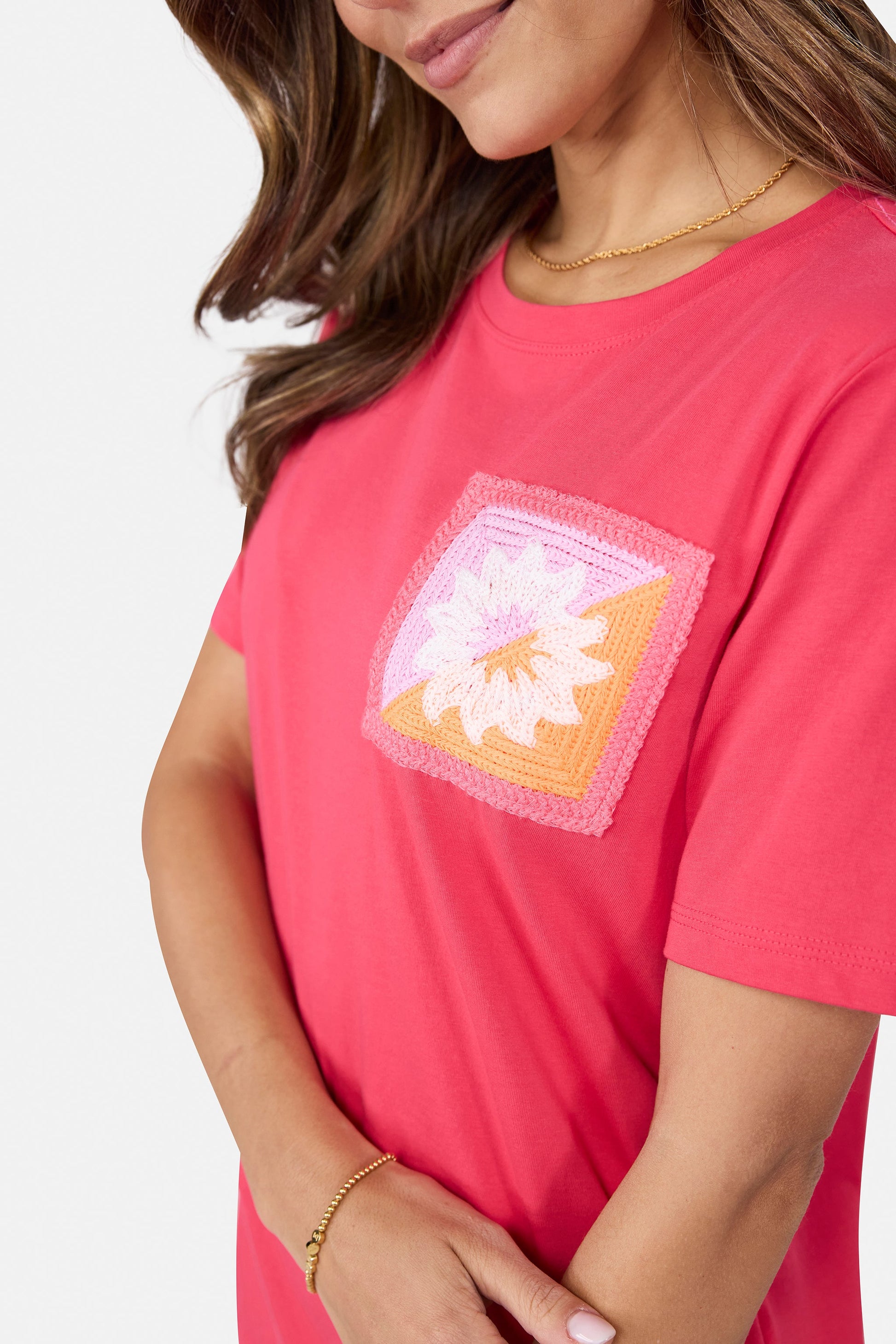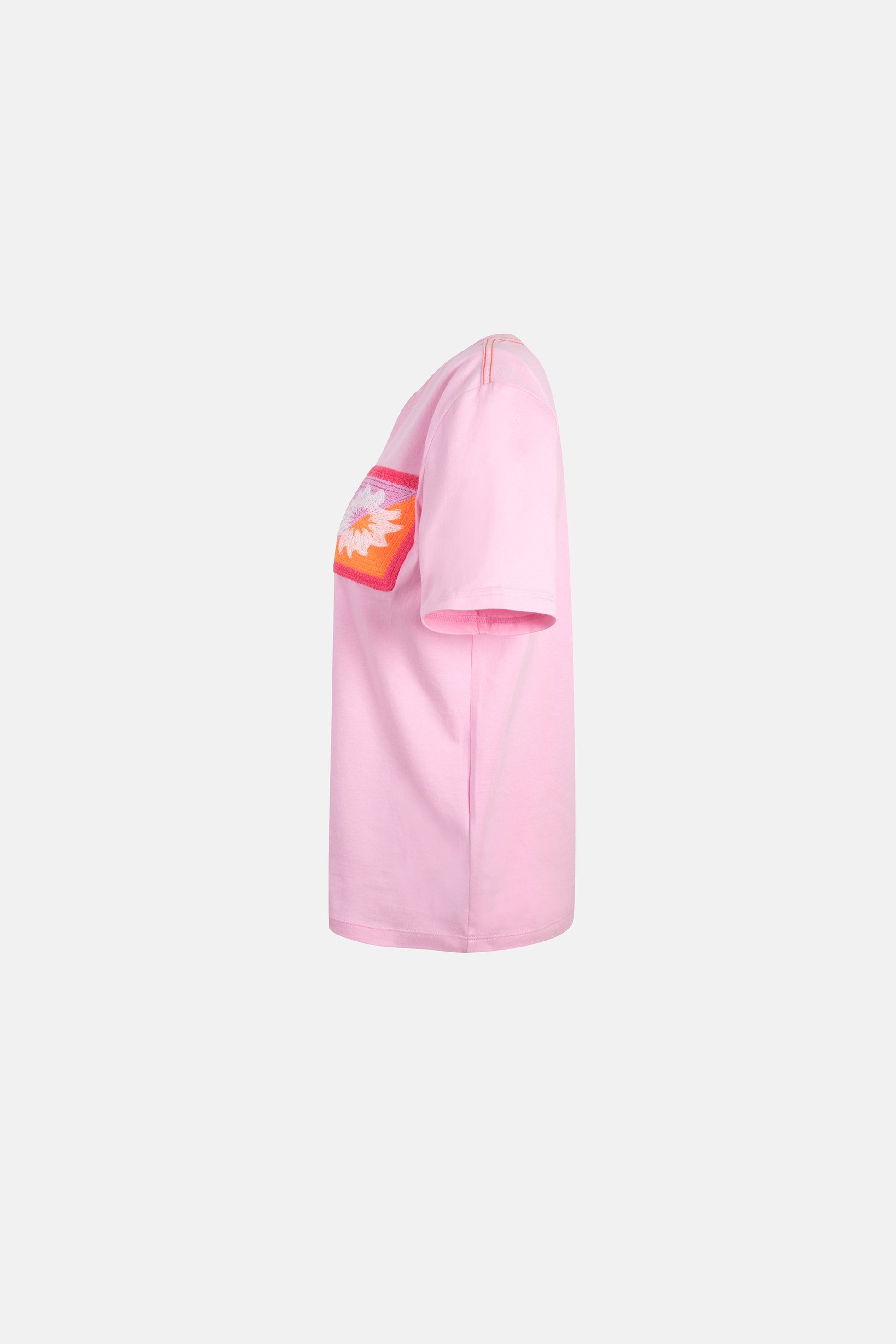 Dieses T-Shirt vereint schlichte Eleganz mit liebevollen Details. Das zarte Häkelmotiv auf der Brust verleiht dem klassischen Rundhals-Schnitt eine feminine Note und macht es zu einem besonderen LIEBLINGSSTÜCK.
