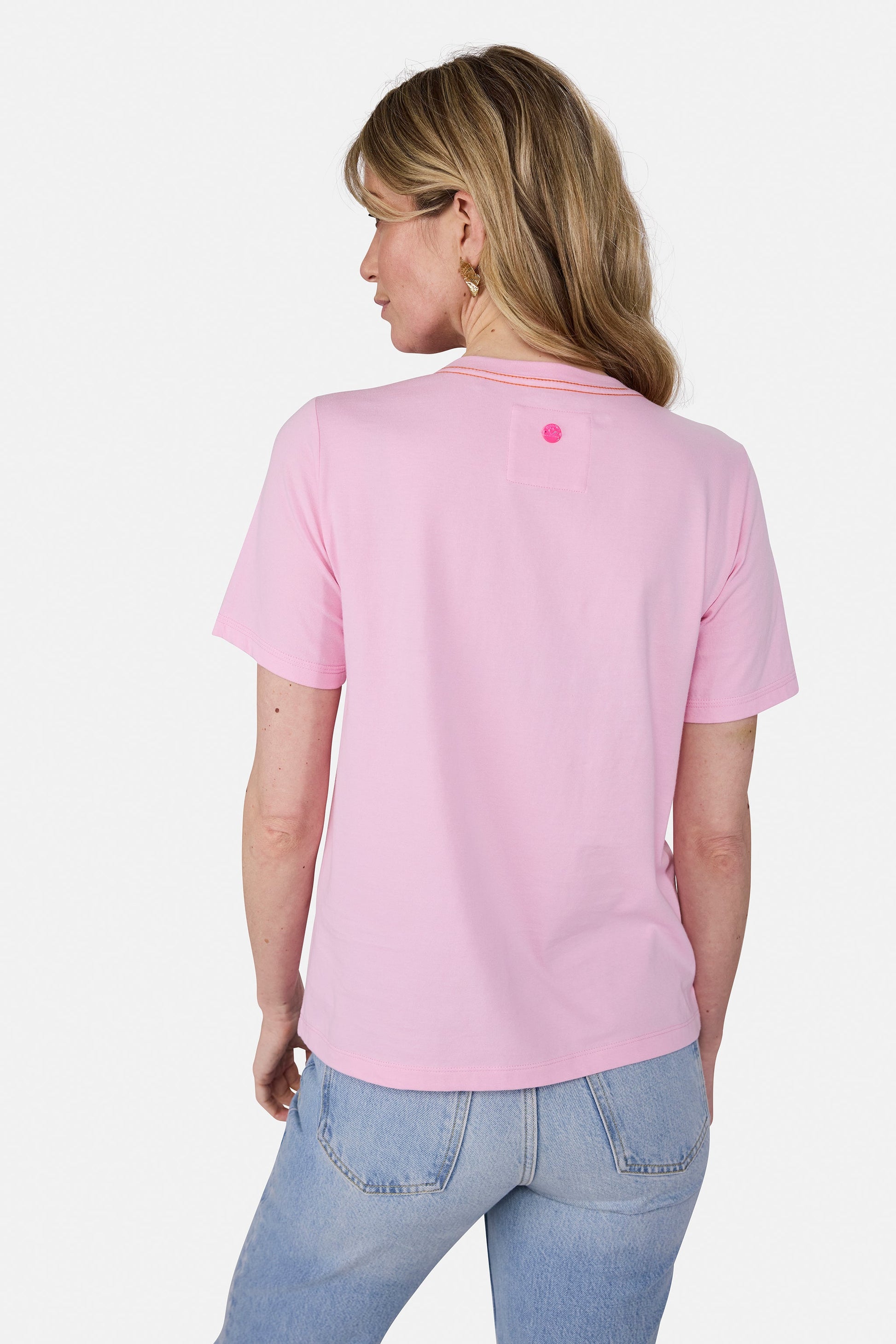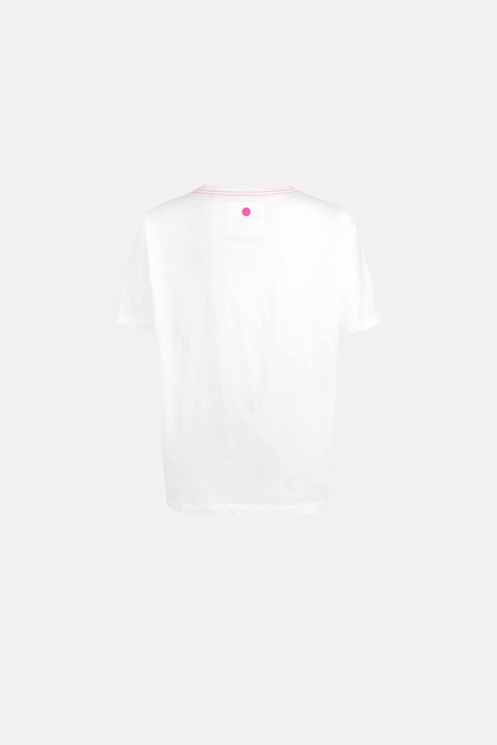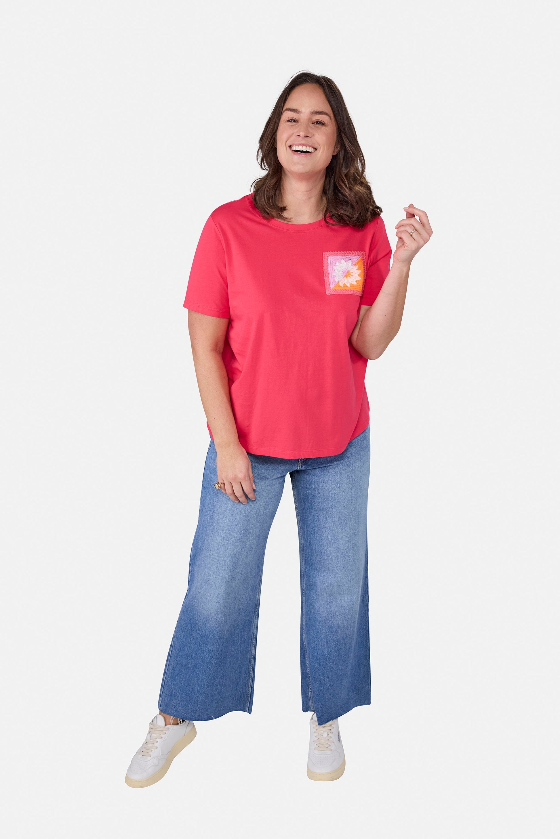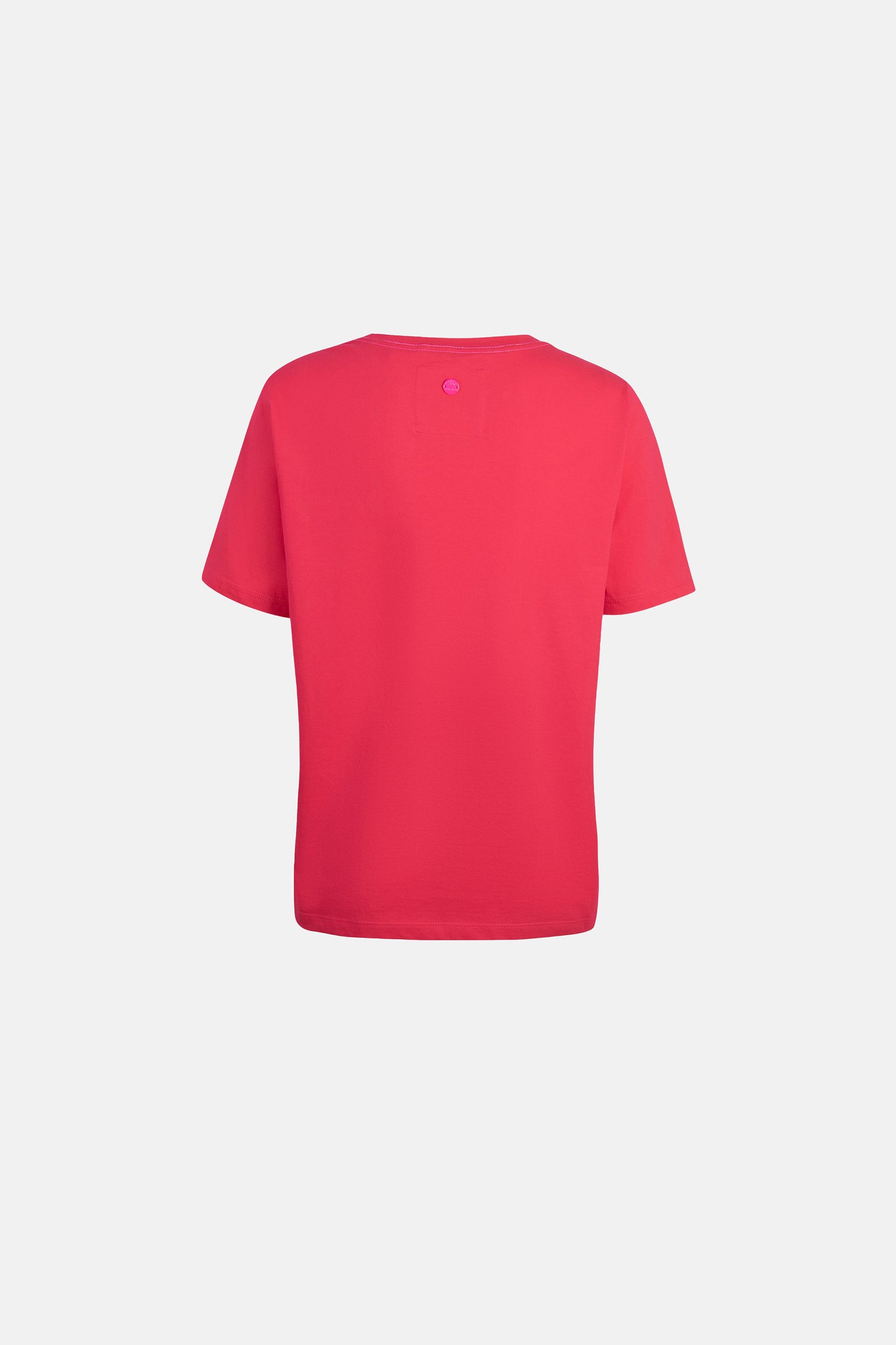 Dieses T-Shirt vereint schlichte Eleganz mit liebevollen Details. Das zarte Häkelmotiv auf der Brust verleiht dem klassischen Rundhals-Schnitt eine feminine Note und macht es zu einem besonderen LIEBLINGSSTÜCK.