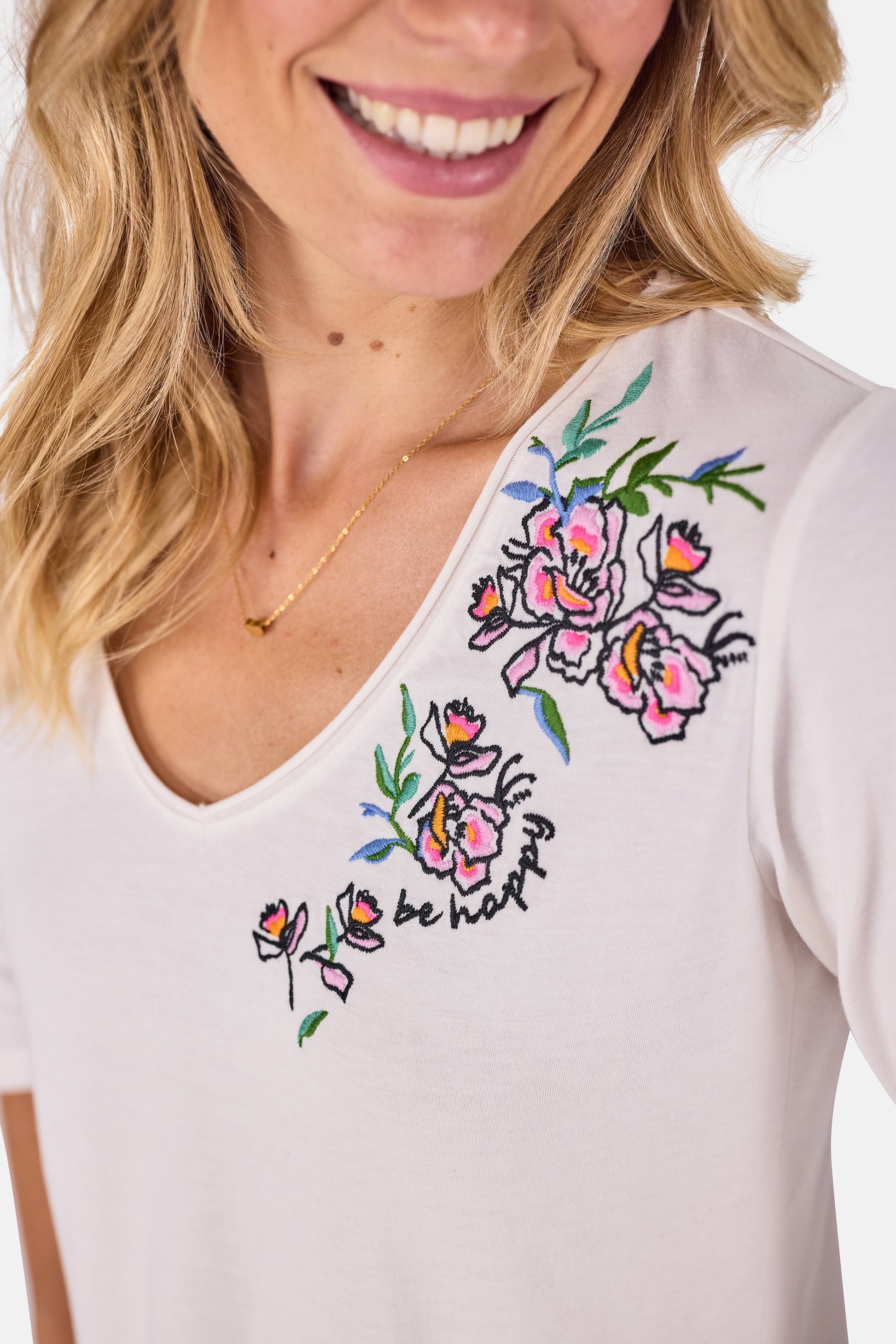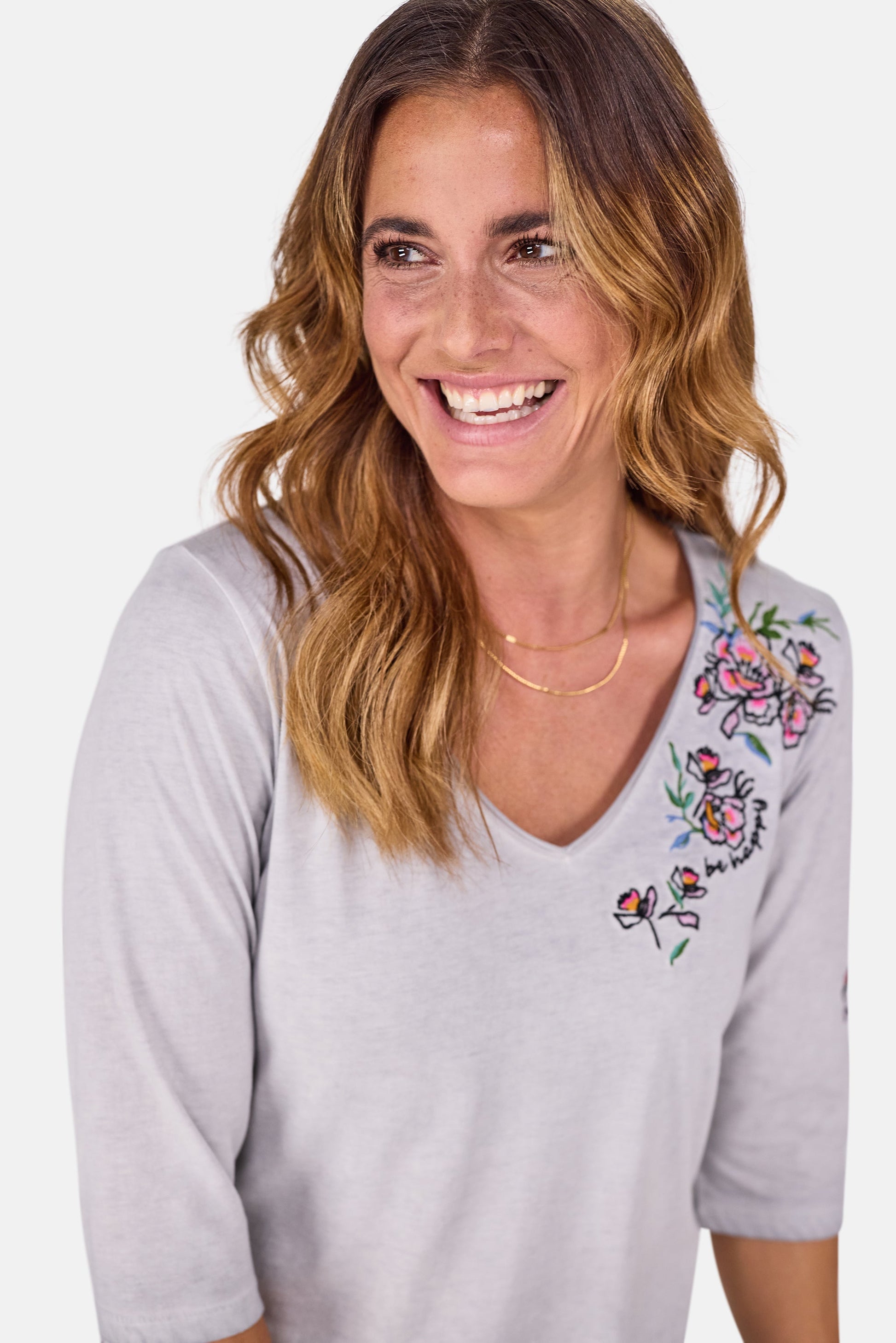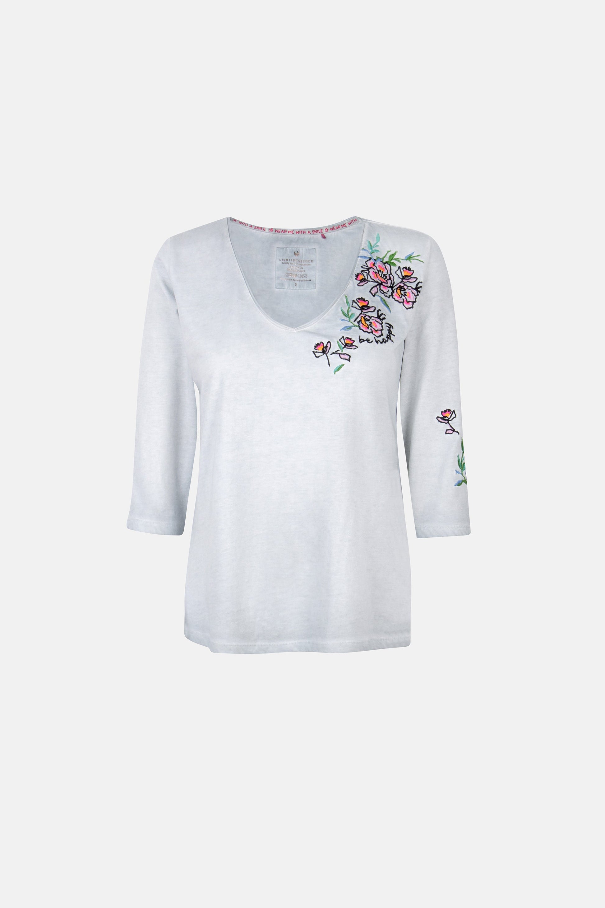 Dieses zauberhafte T-Shirt mit dem Motiv der Blumenstickerei bringt einen Hauch von Frische und Eleganz in Deinen Kleiderschrank. Die liebevoll gestalteten Blumen verleihen dem Shirt einen verspielten und femininen Look. Hergestellt aus softem Material, bietet es angenehmen Tragekomfort und ist perfekt für lässige Tage oder als stimmungsvolles Highlight in Deinem Outfit!