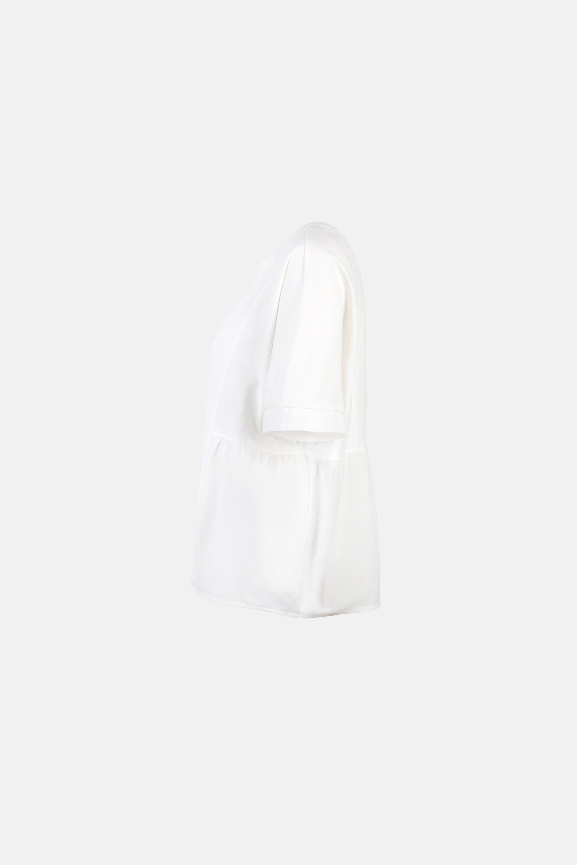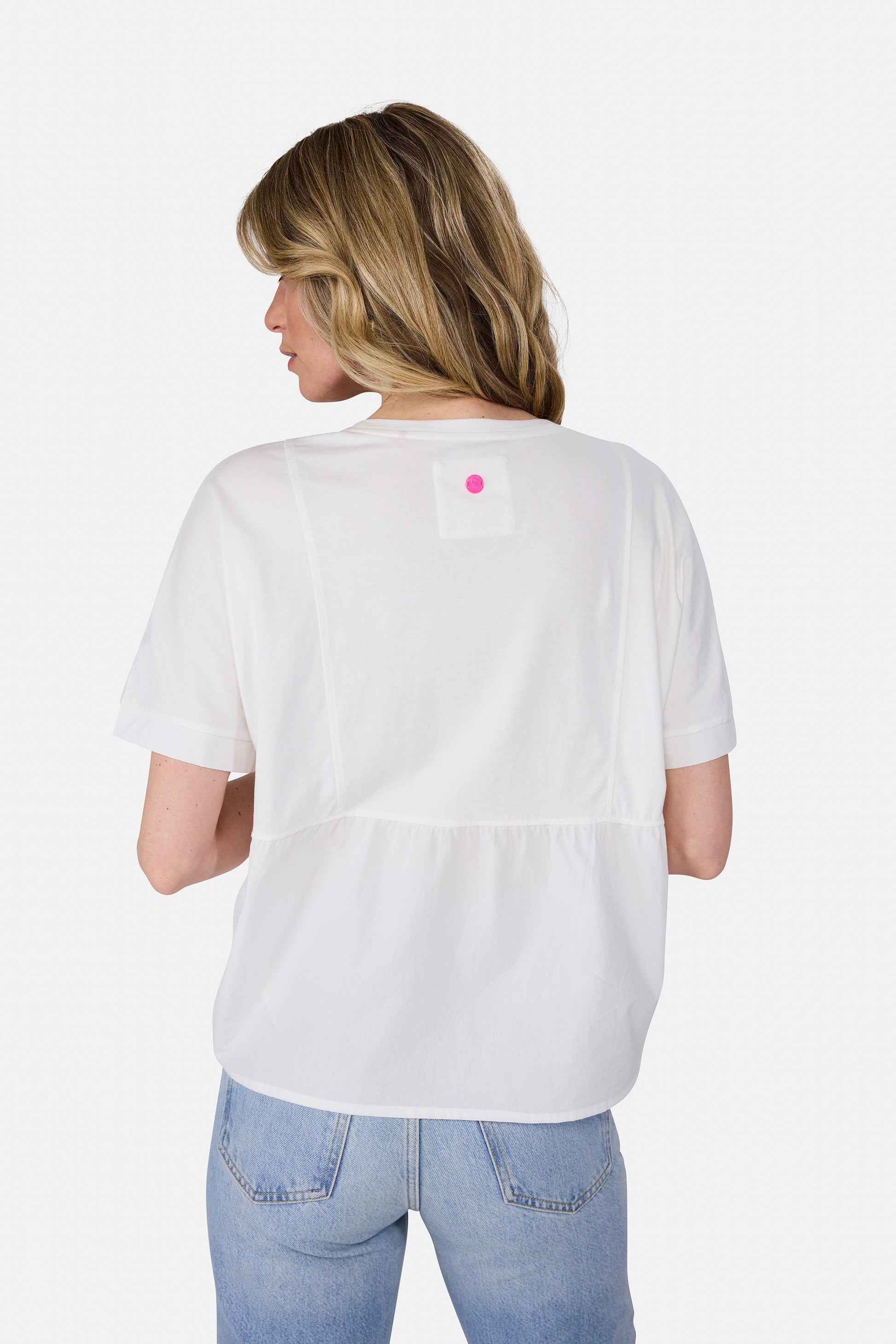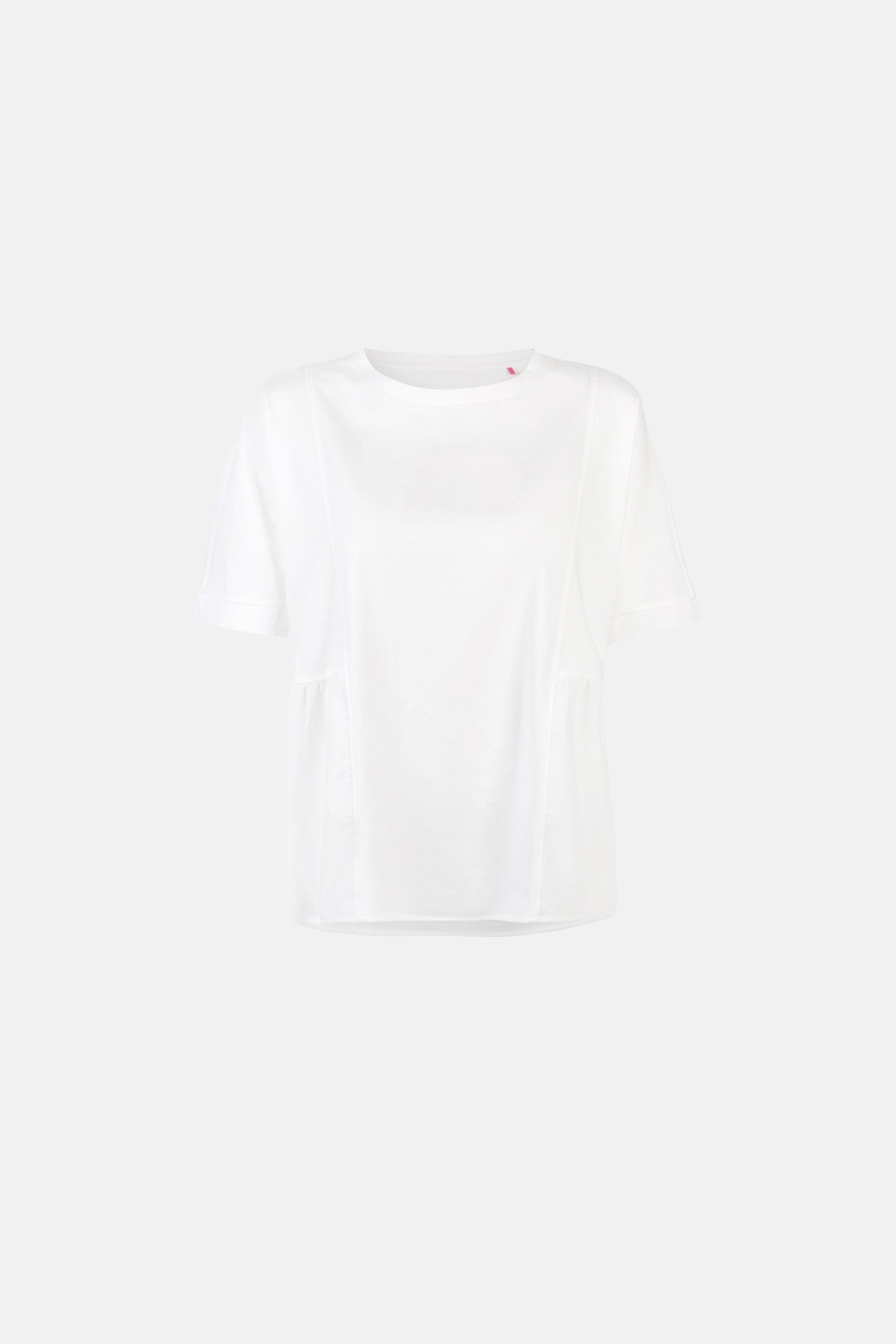 Ein modernes Basic mit besonderem Twist! Dieses T-Shirt begeistert mit stylischen seitlichen Webstoffeinsätzen, die für eine raffinierte Optik sorgen. Der klassische Rundhalsausschnitt und die überschnittene Schulter verleihen dem Design eine lässige, aber dennoch feminine Note – perfekt für entspannte Looks mit dem gewissen Etwas!