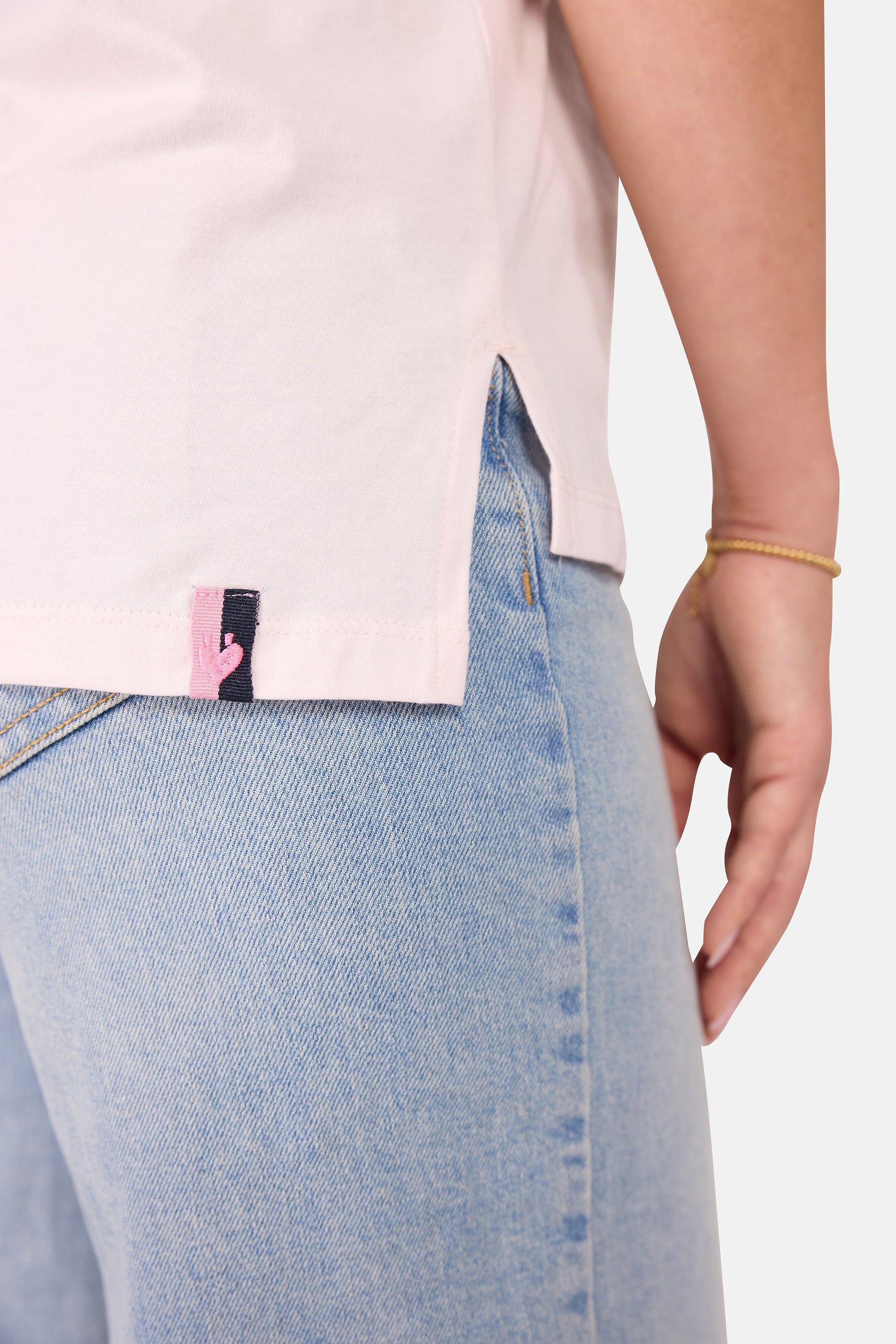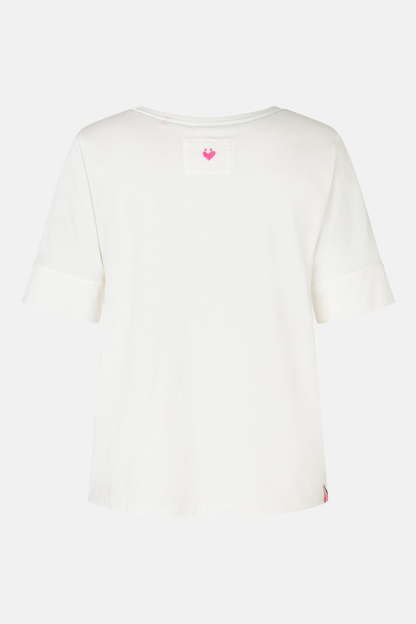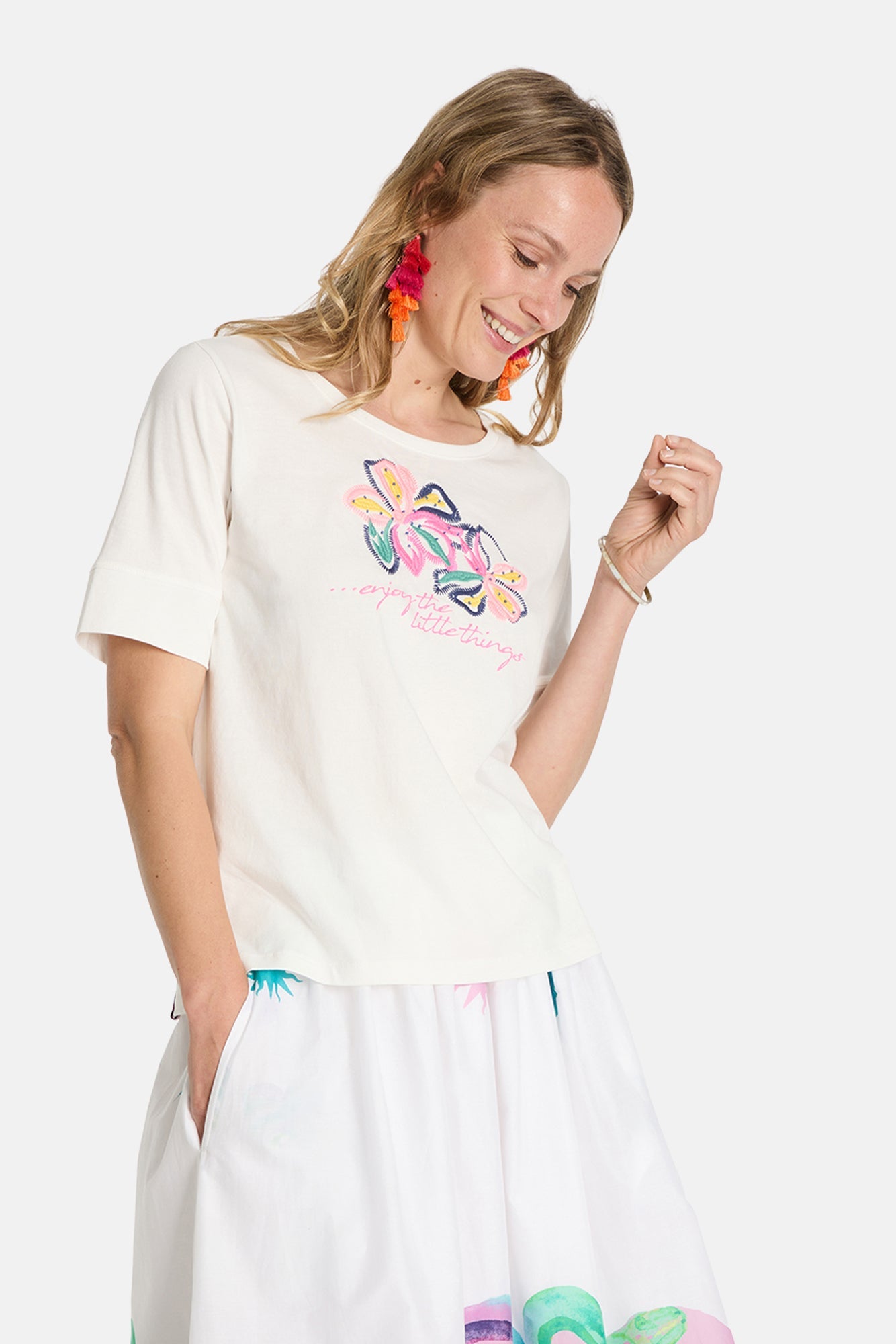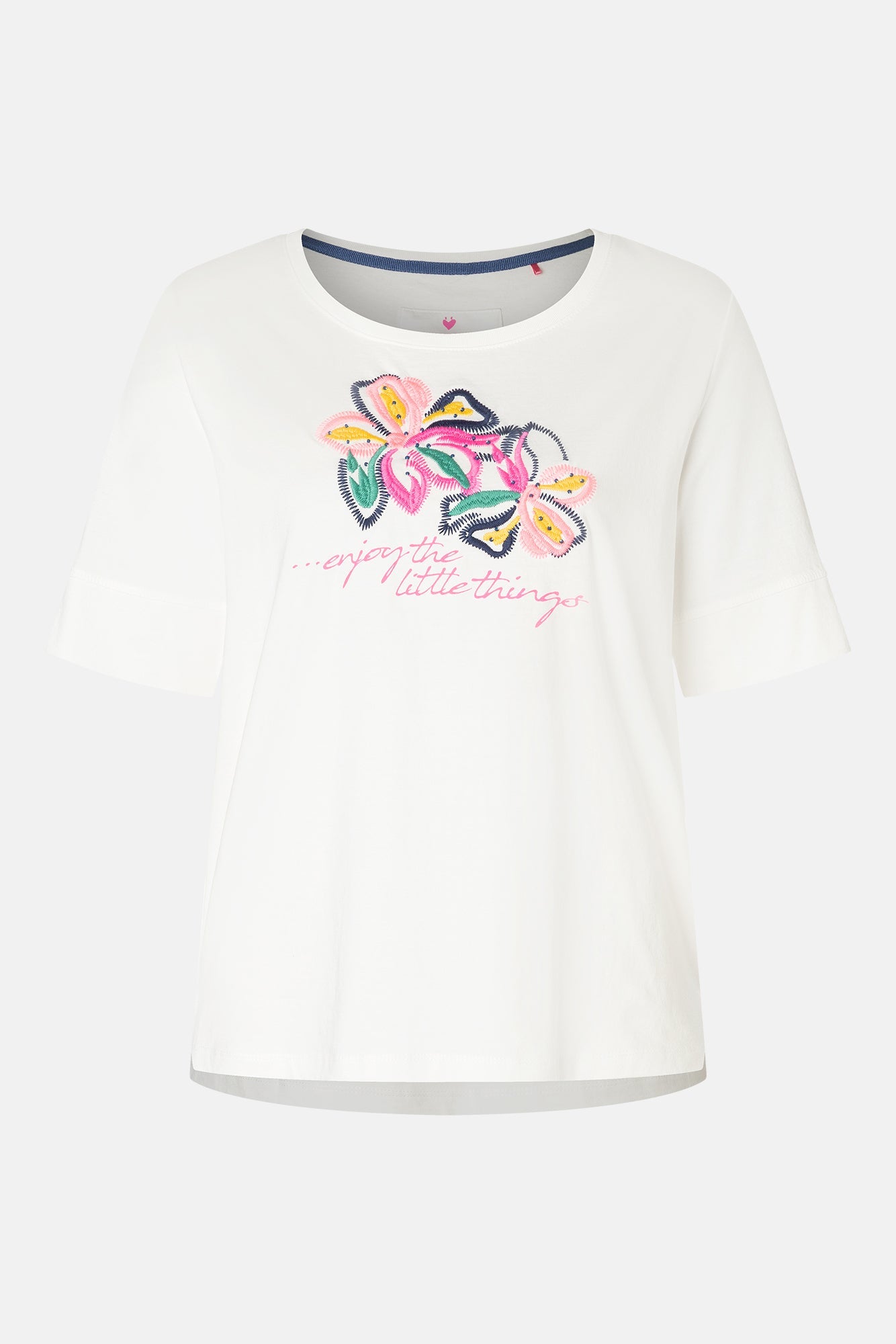 Dieses T-Shirt mit Rundhalsausschnitt und zauberhaftem Blumen-Frontmotiv ist ein echtes Wohlfühl-Highlight. Das verspielte Design bringt Leichtigkeit in Deinen Look, während der weiche Stoff Dir maximalen Komfort schenkt. Perfekt für den Alltag und mit toller Botschaft "enjoy the little things".