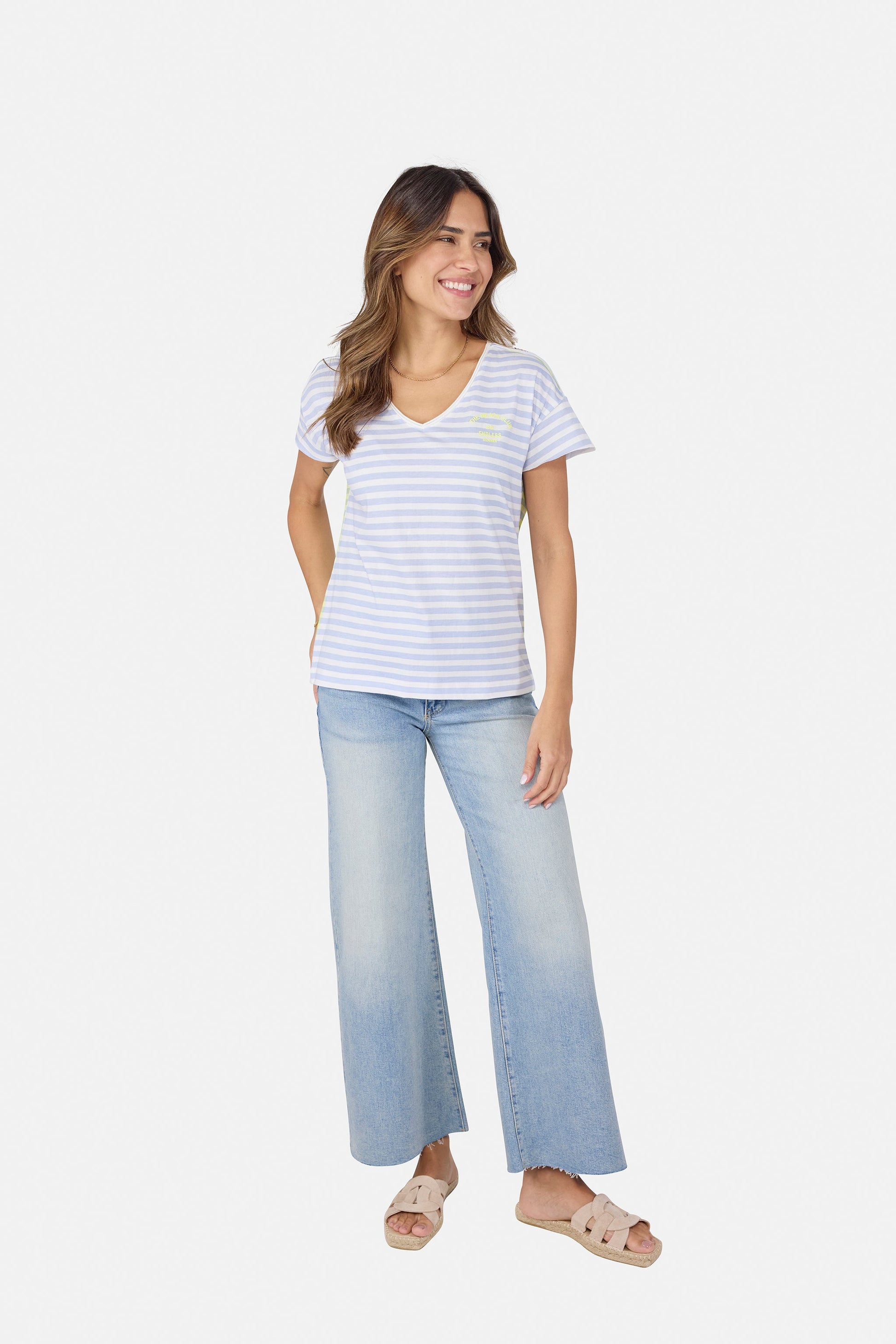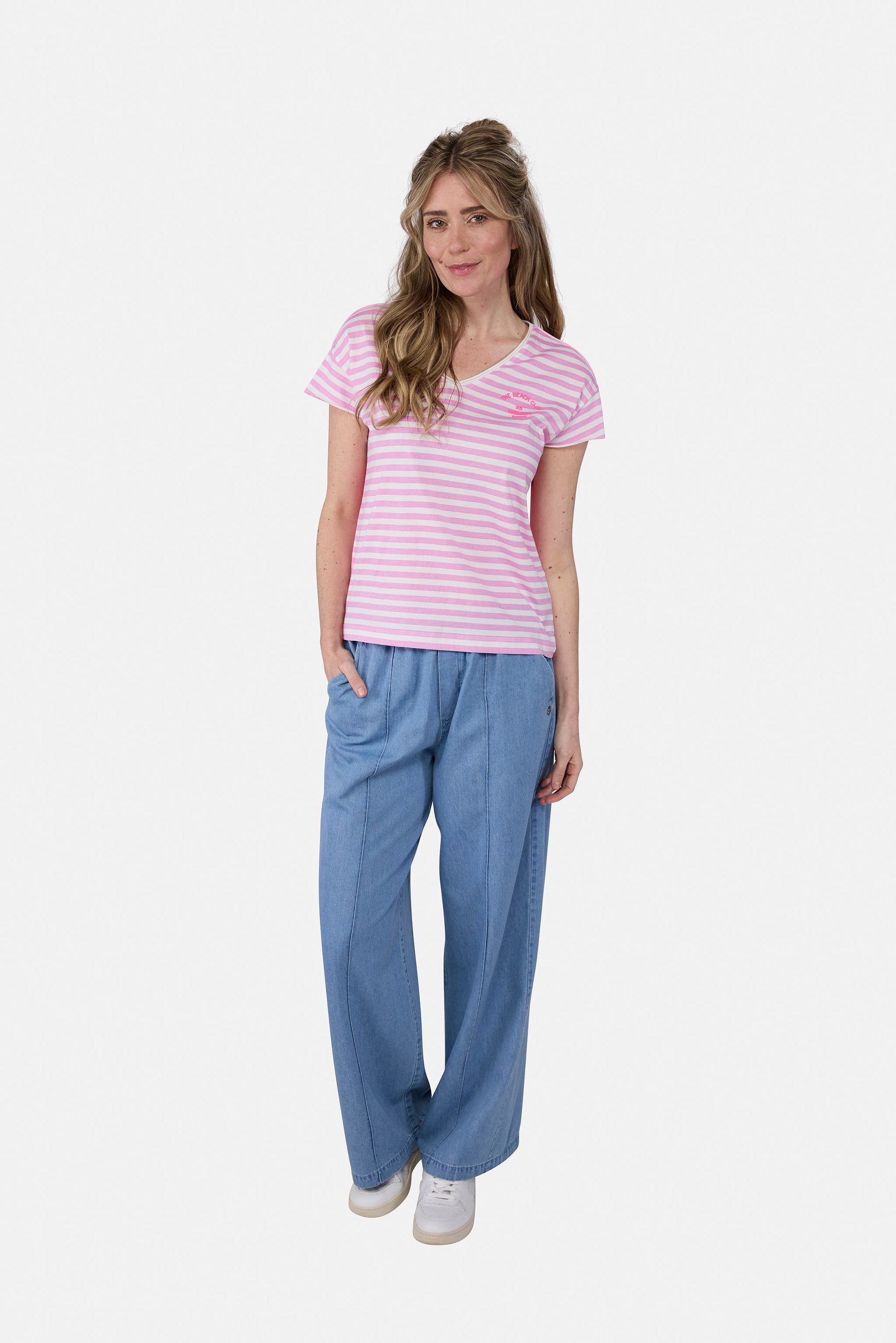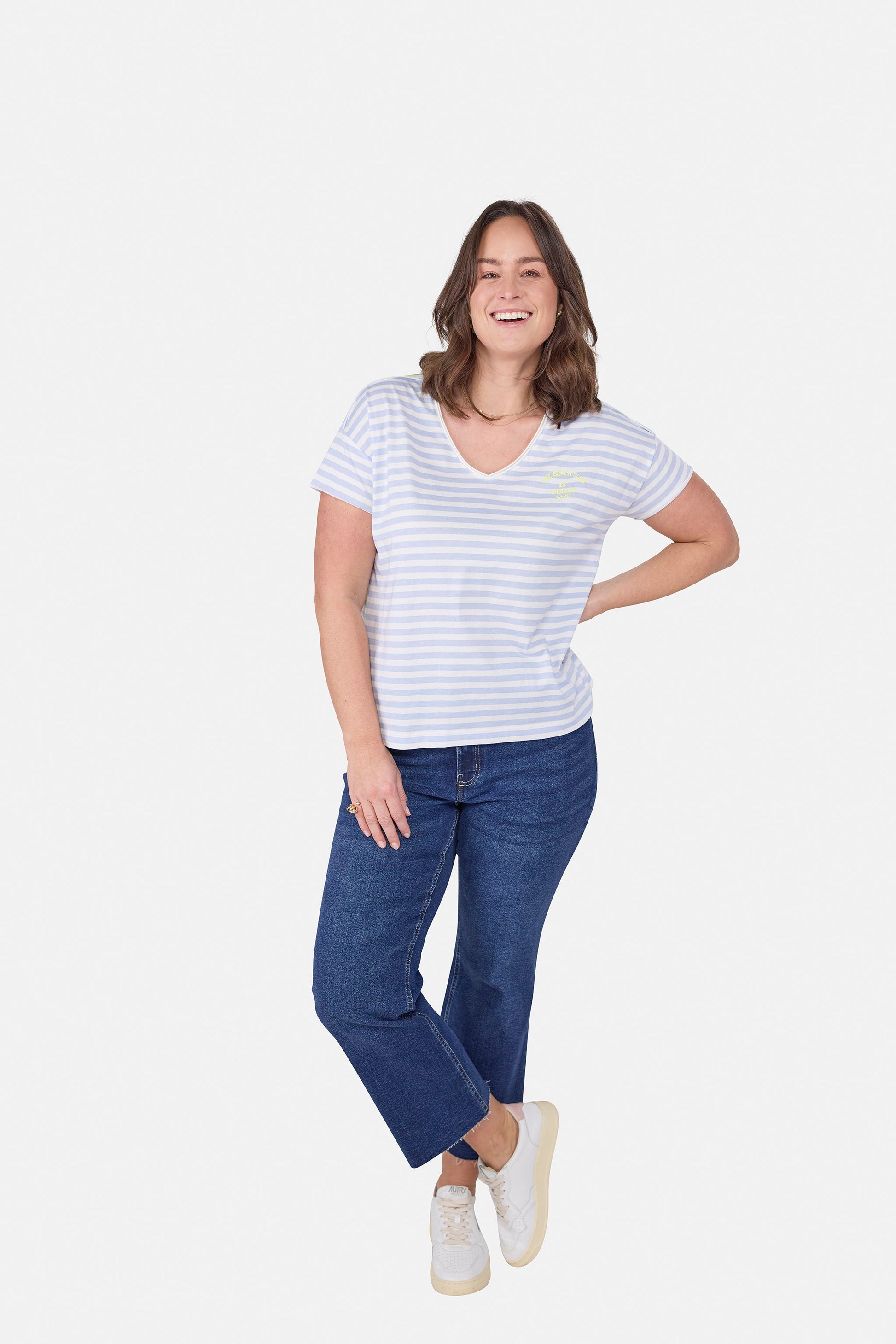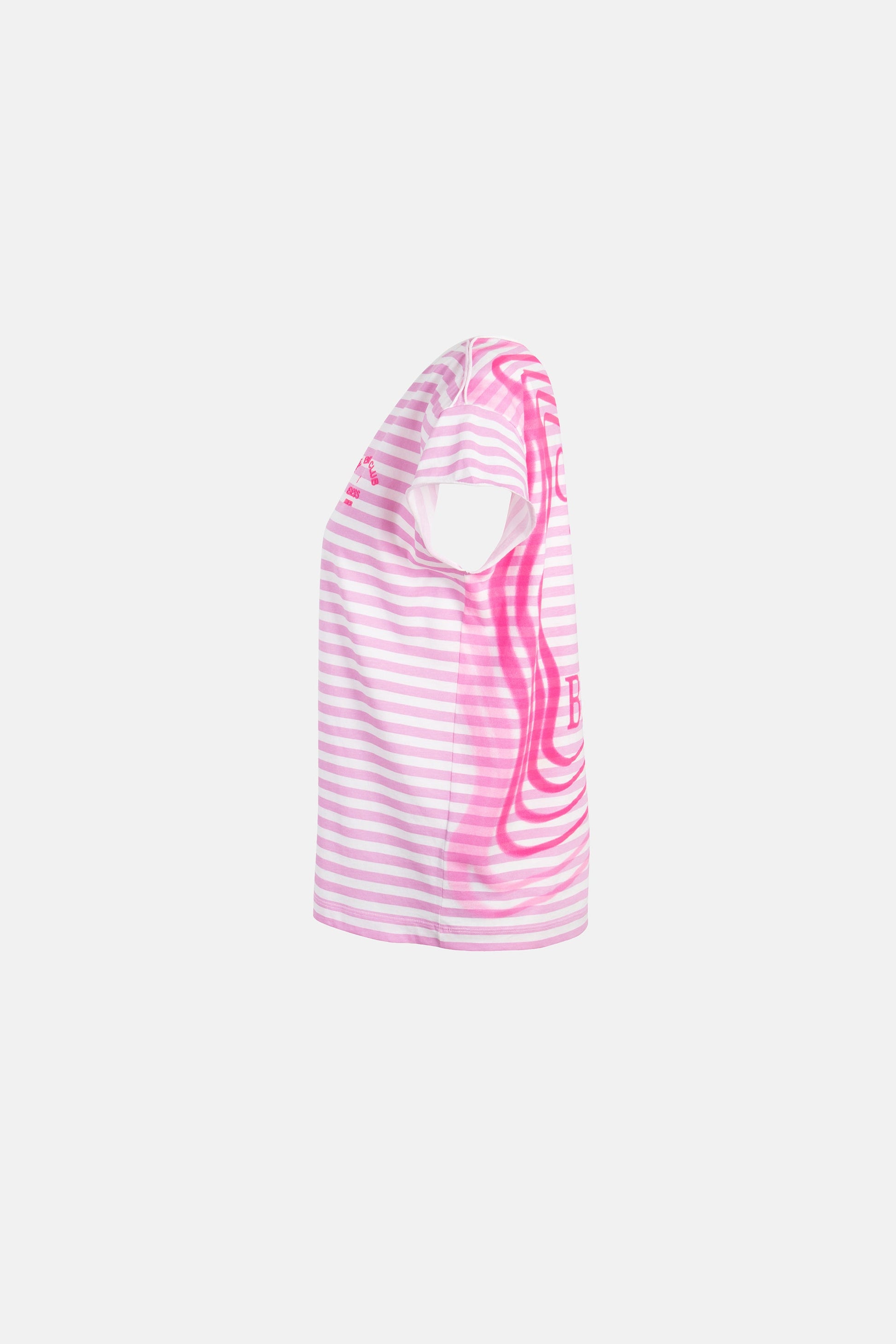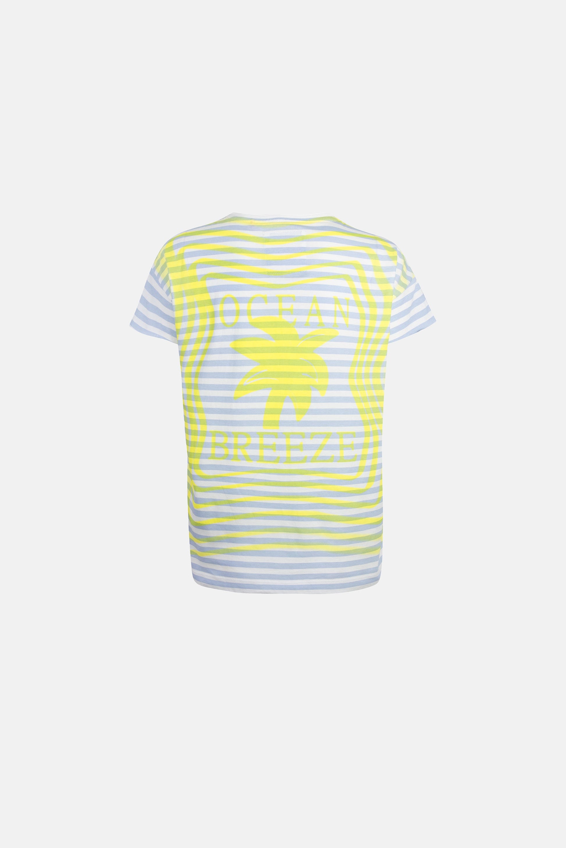 Vorne schlicht, hinten besonders: Dieses T-Shirt kombiniert Streifen mit einem raffinierten Rückenmotiv.