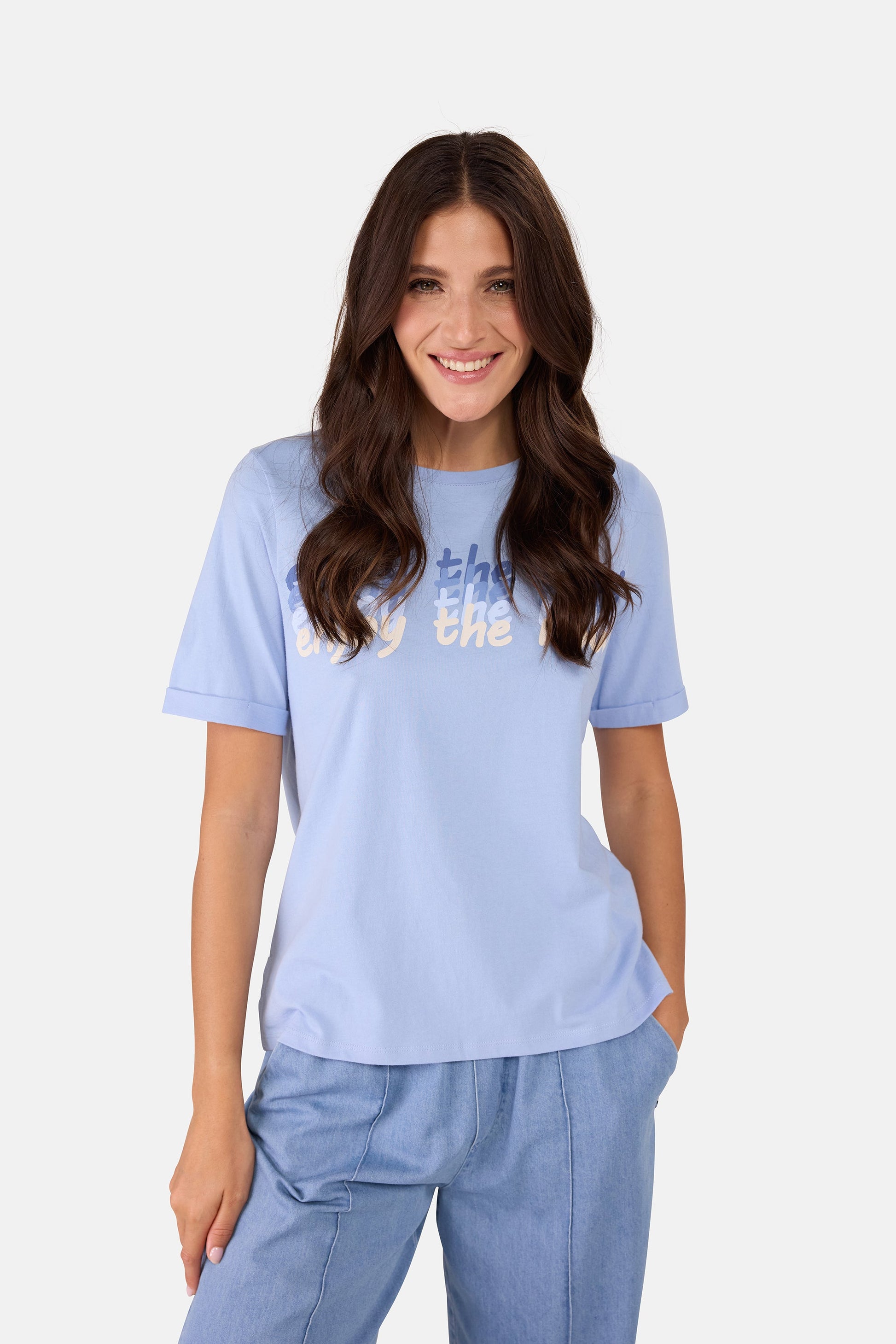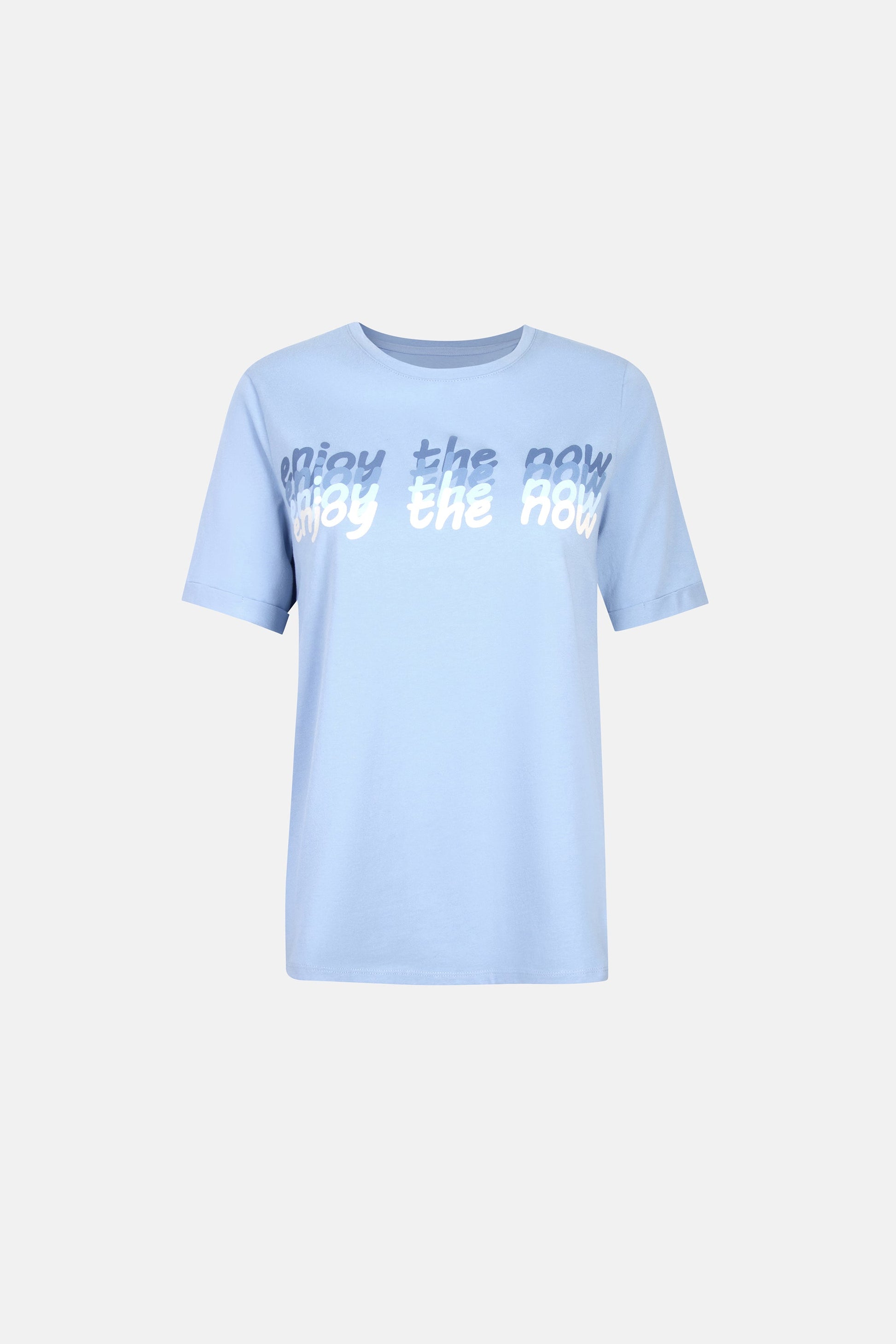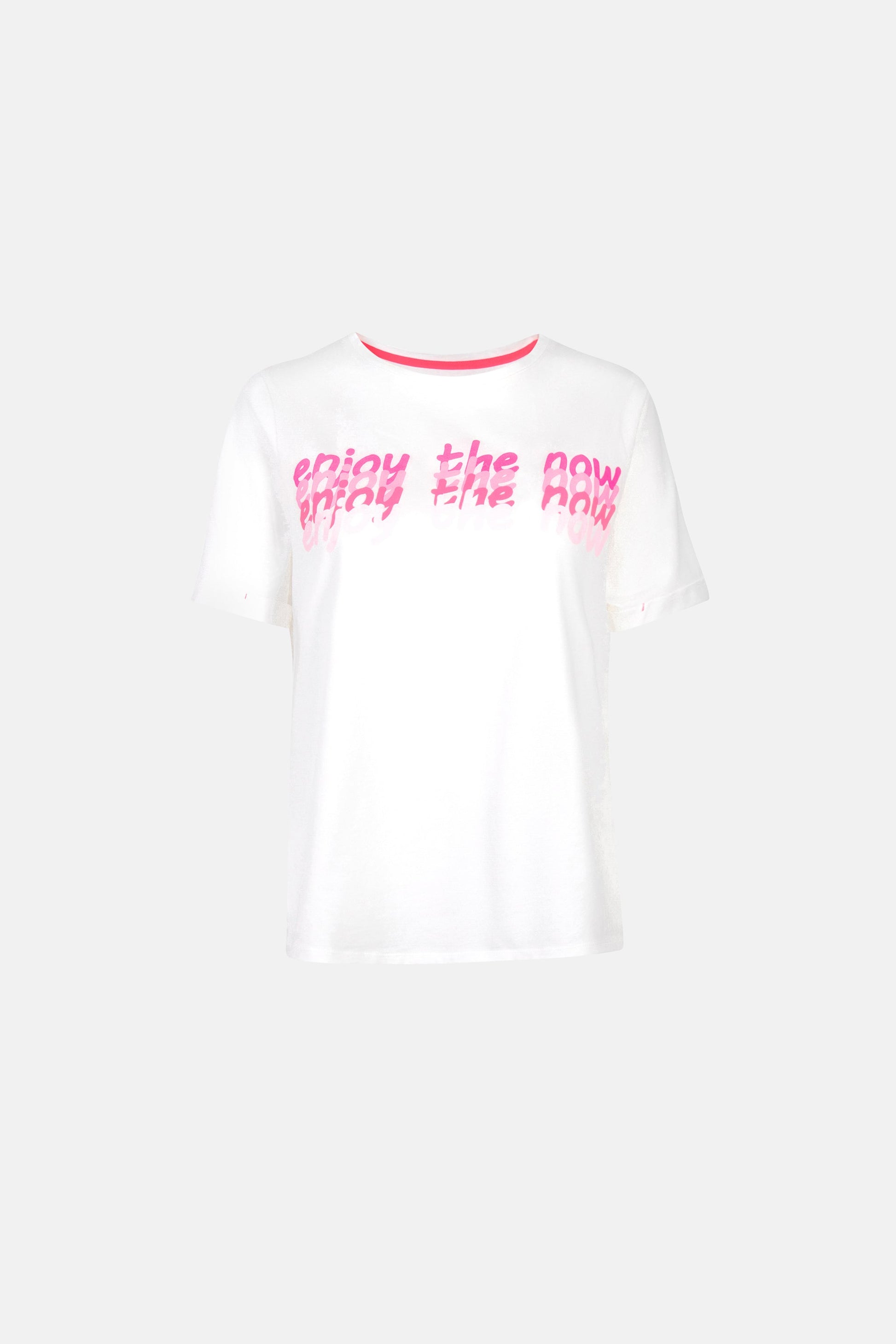 Dieses T-Shirt mit dem Wording "enjoy the now" vereint lässigen Komfort mit einem einzigartigen Motiv. Gefertigt aus weicher, hochwertiger Baumwolle, schmiegt es sich sanft an Deine Haut und sorgt für ein angenehmes Tragegefühl – den ganzen Tag über. Der liebevoll gestaltete Druck verleiht Deinem Outfit das gewisse Etwas und macht es zu einem echten LIEBLINGSSTÜCK. Perfekt für alle, die Mode mit Persönlichkeit lieben.
