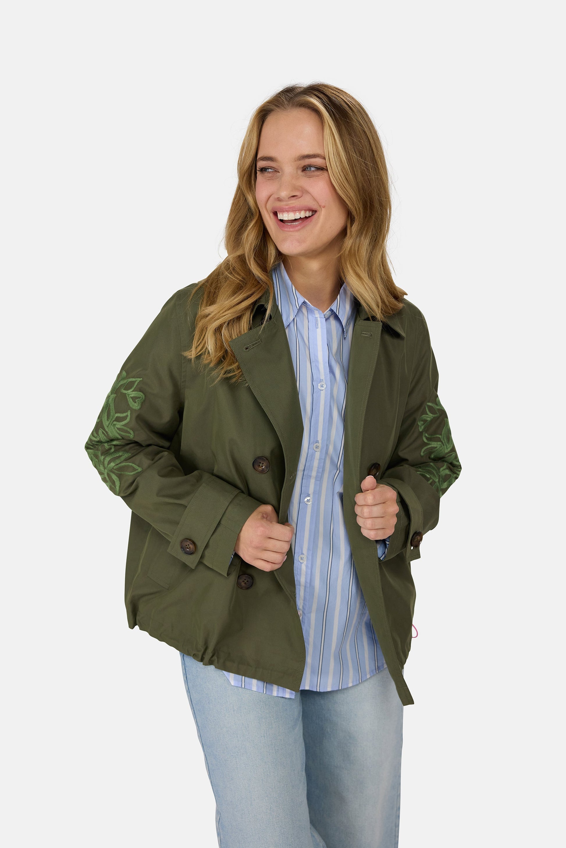 Klassik trifft auf Romantik: Dieser elegante Trenchcoat wird durch die feine, tonige Blumenstickerei an den Ärmeln zu etwas ganz Besonderem. Die doppelreihige Knopfleiste und der zeitlose Schnitt verleihen dem Mantel eine edle Note, während die floralen Details einen Hauch von Verspieltheit hinzufügen. Ein LIEBLINGSSTÜCK, das immer passt und Dich stilvoll und trendy kleidet.